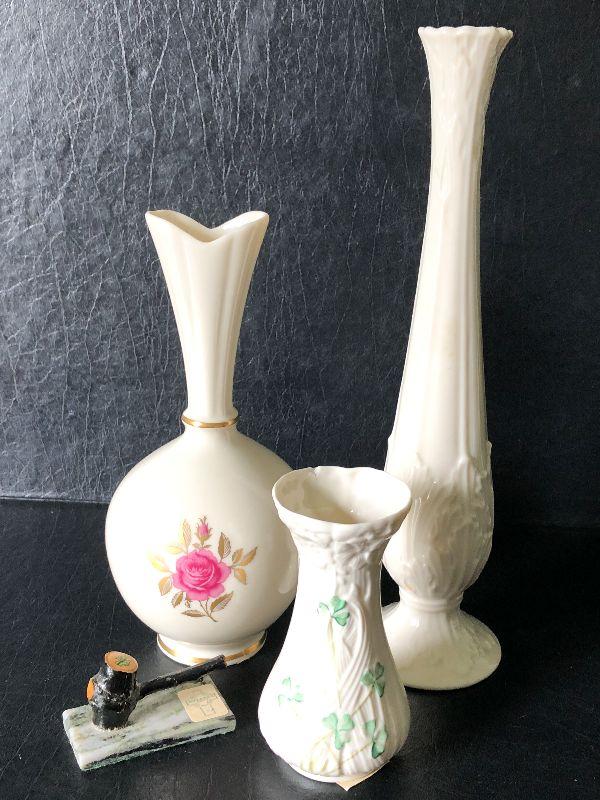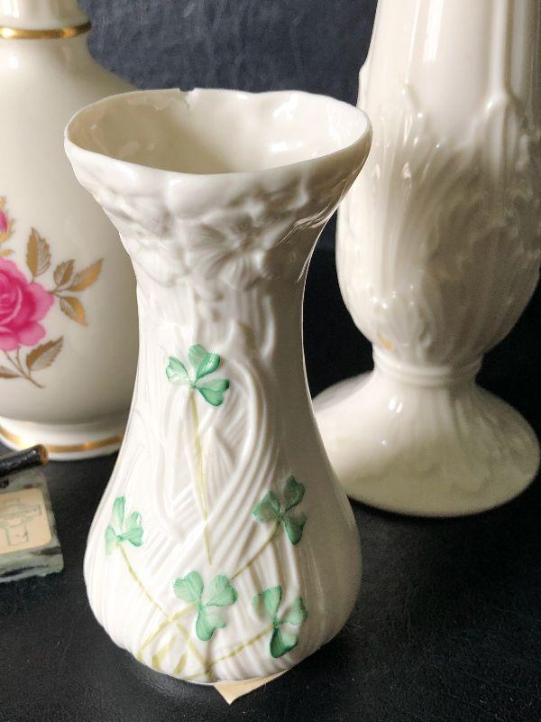 Set of three vases. Two Lenox vases and one clover print vase.