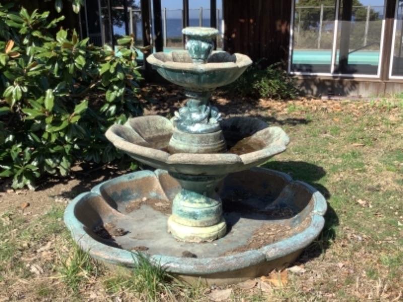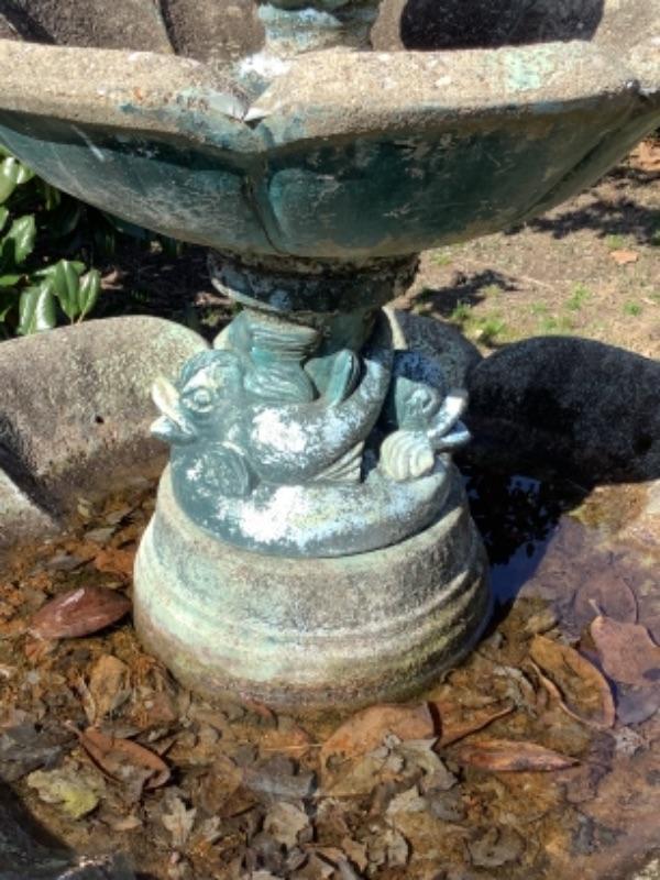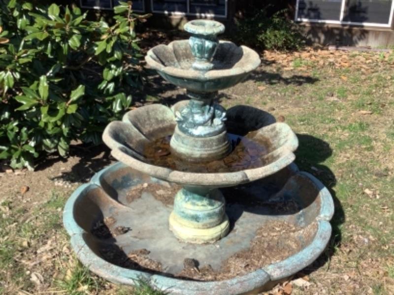 Large water fountain measures approximately 5’1” high and 5’11” round. Middle section has koi fish decor. The bottom piece is fiberglass and the rest is cement. Does come apart for moving.