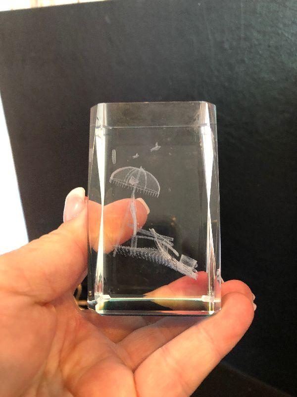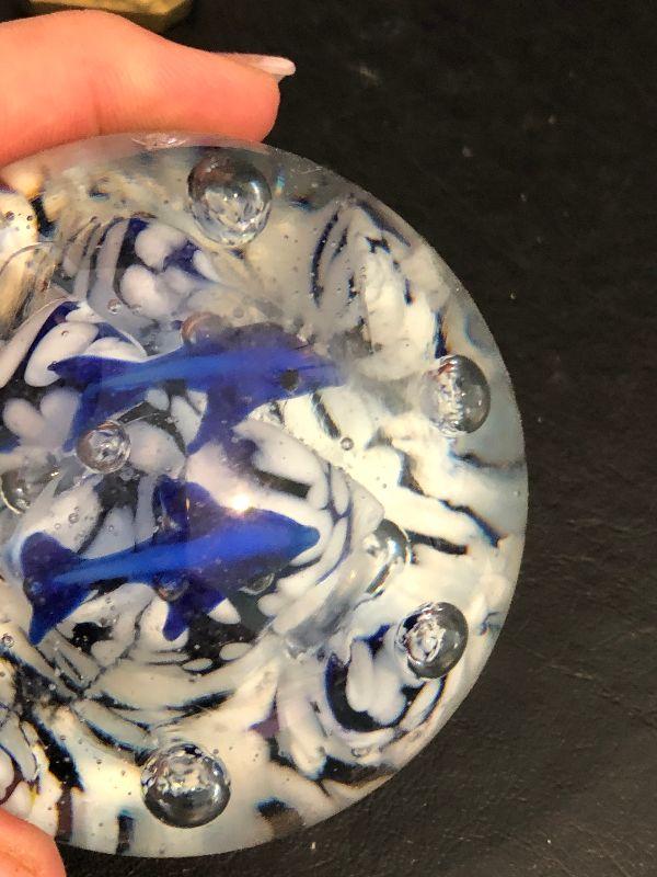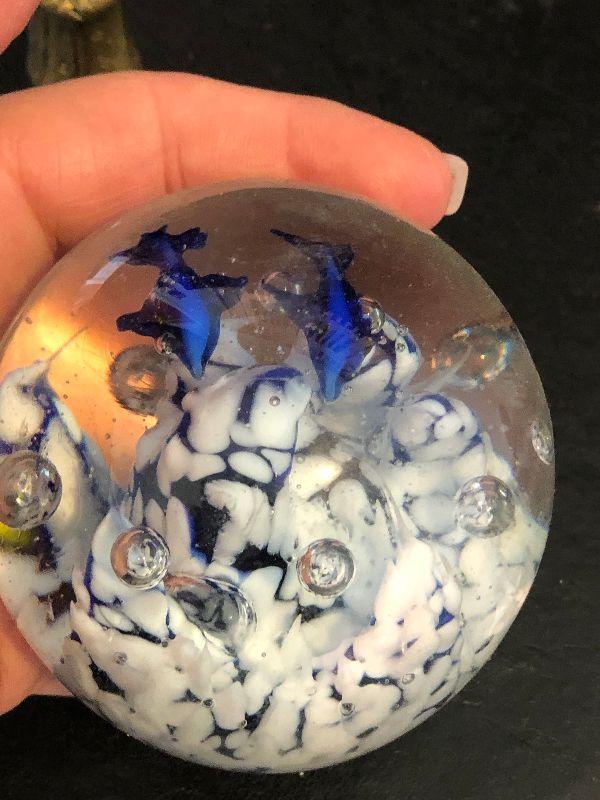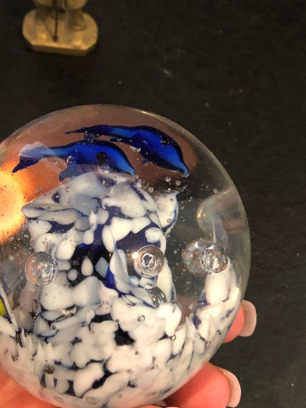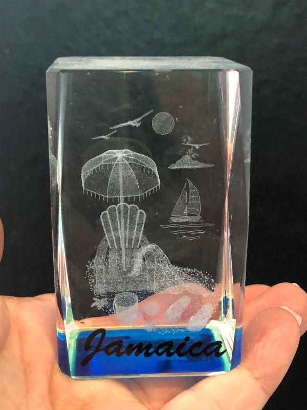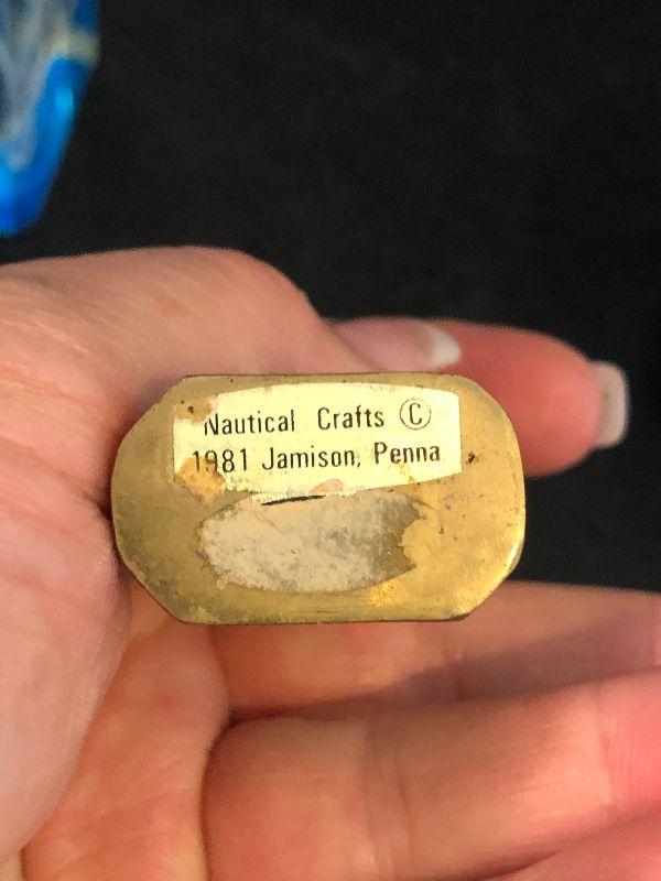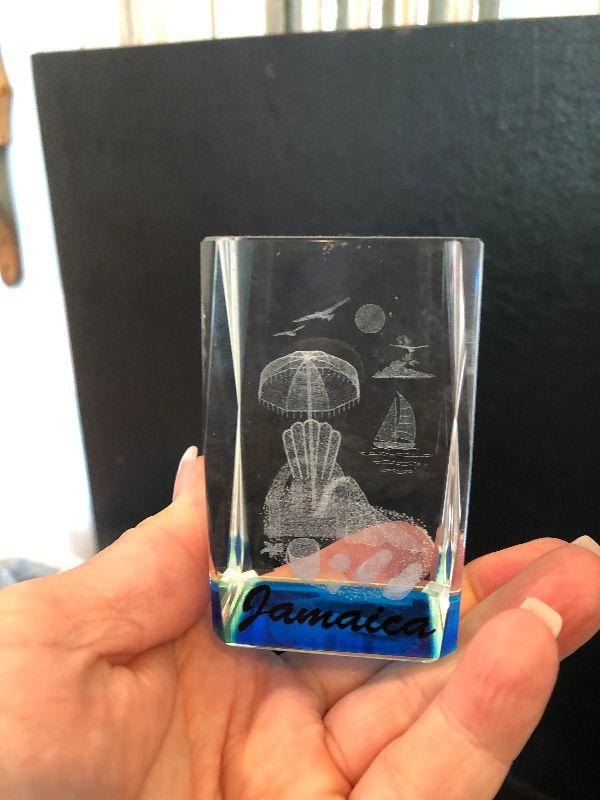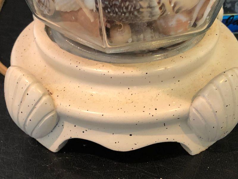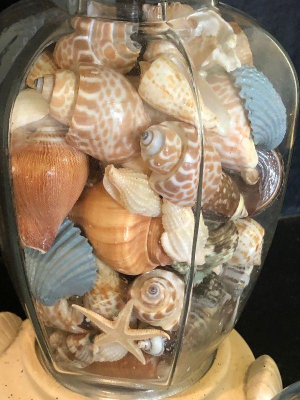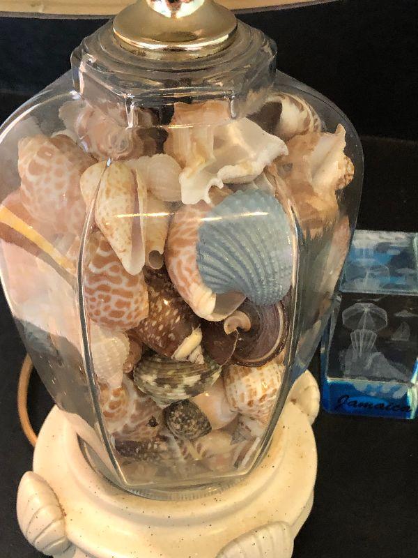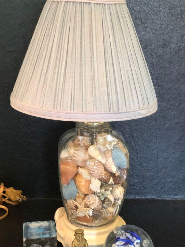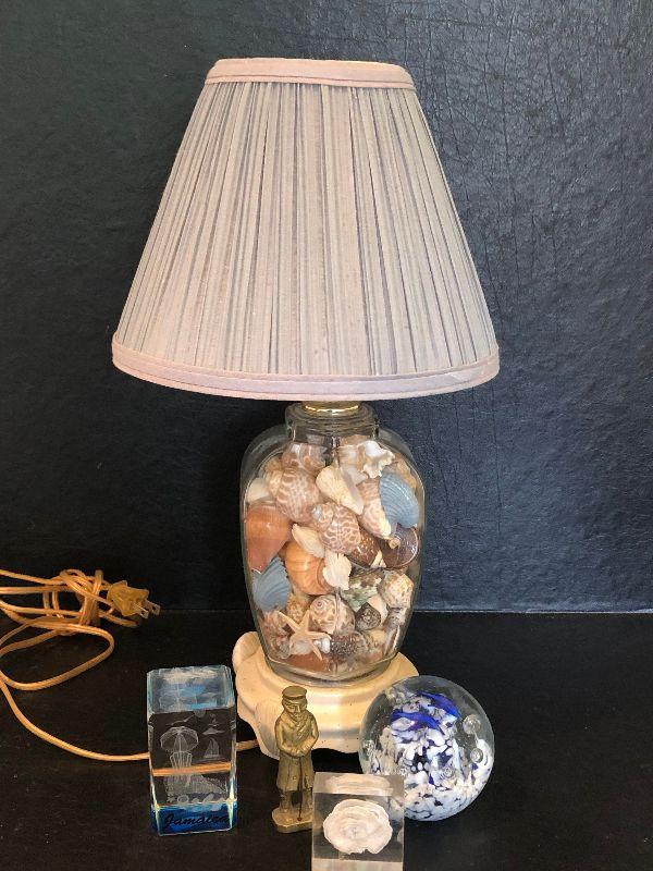 Glass lamp filled with sea shells, glass ball paper weight, a brass sea man, and a nautical designed souvenir from Jamaica. Bring box for moving.