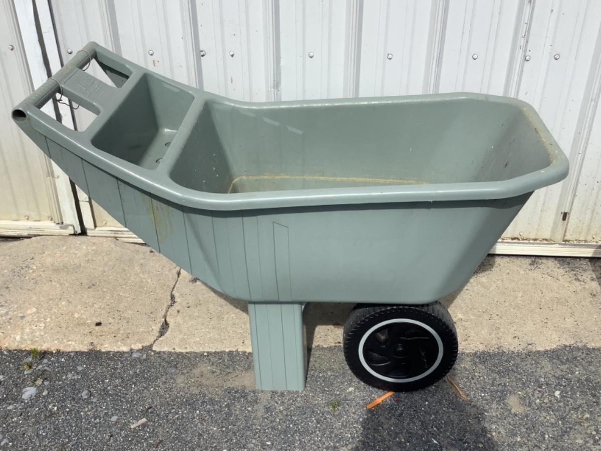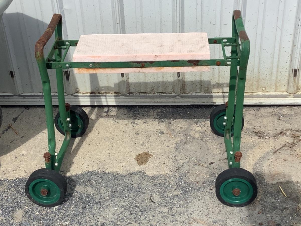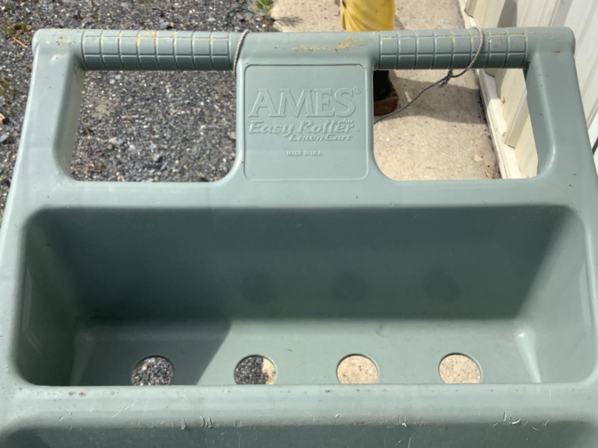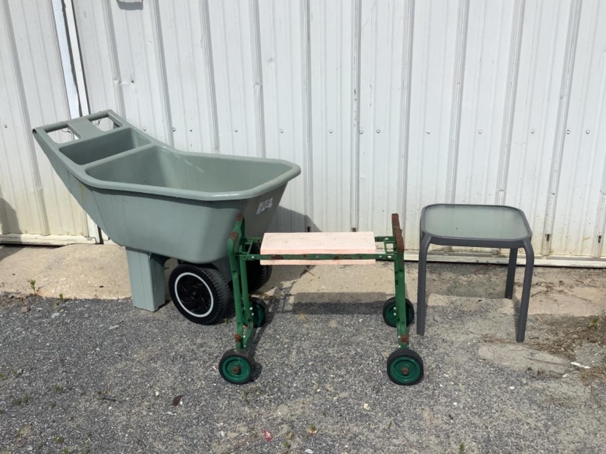 Ames easy roll plastic lawn cart, rolling garden seat has some rust (see photos) and a small metal outdoor table