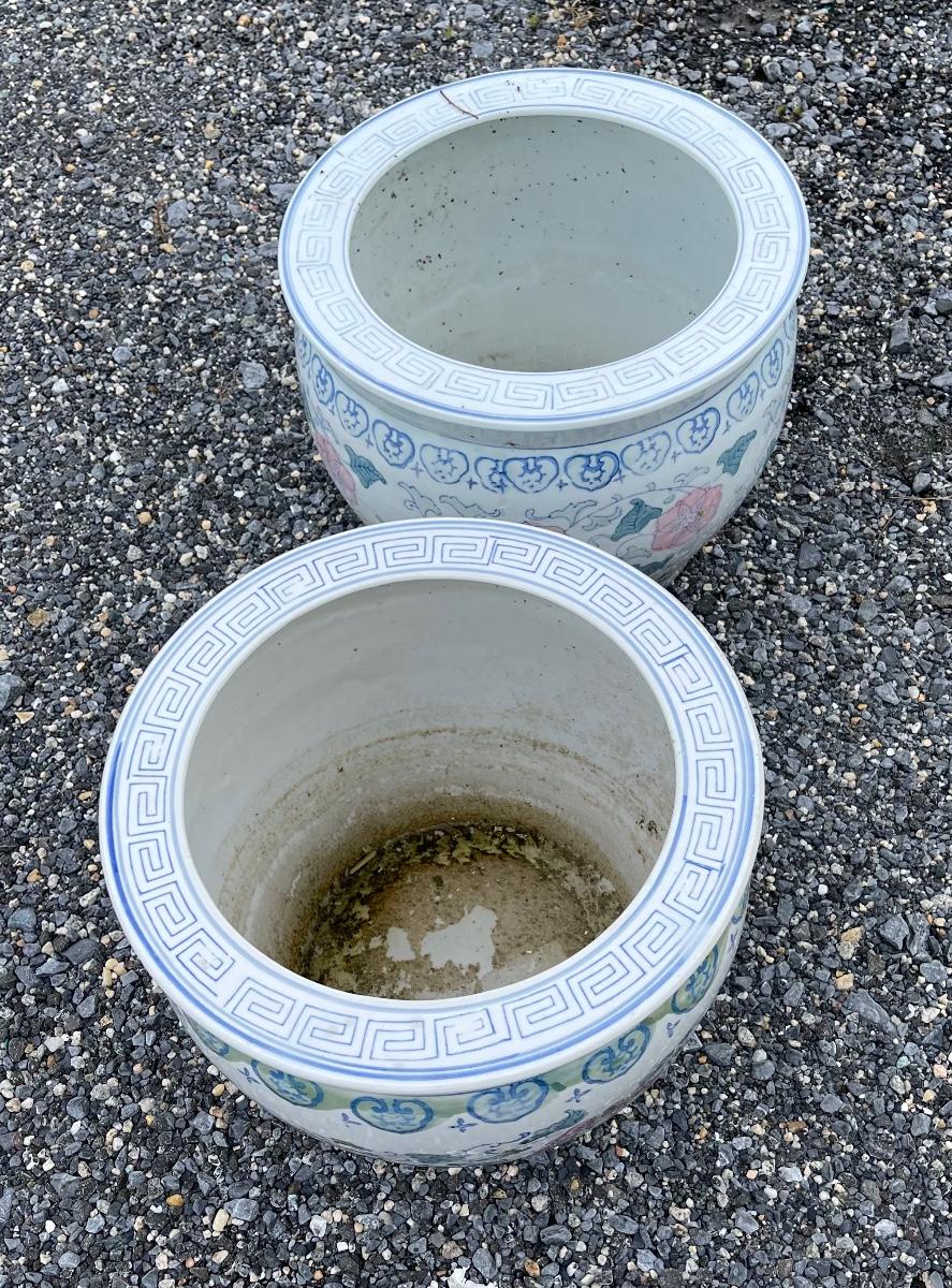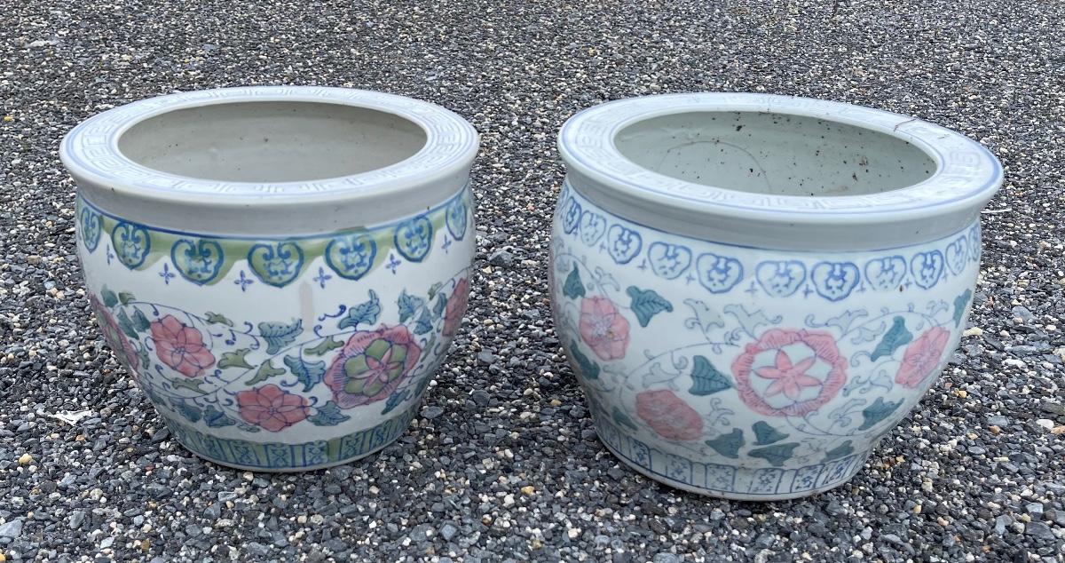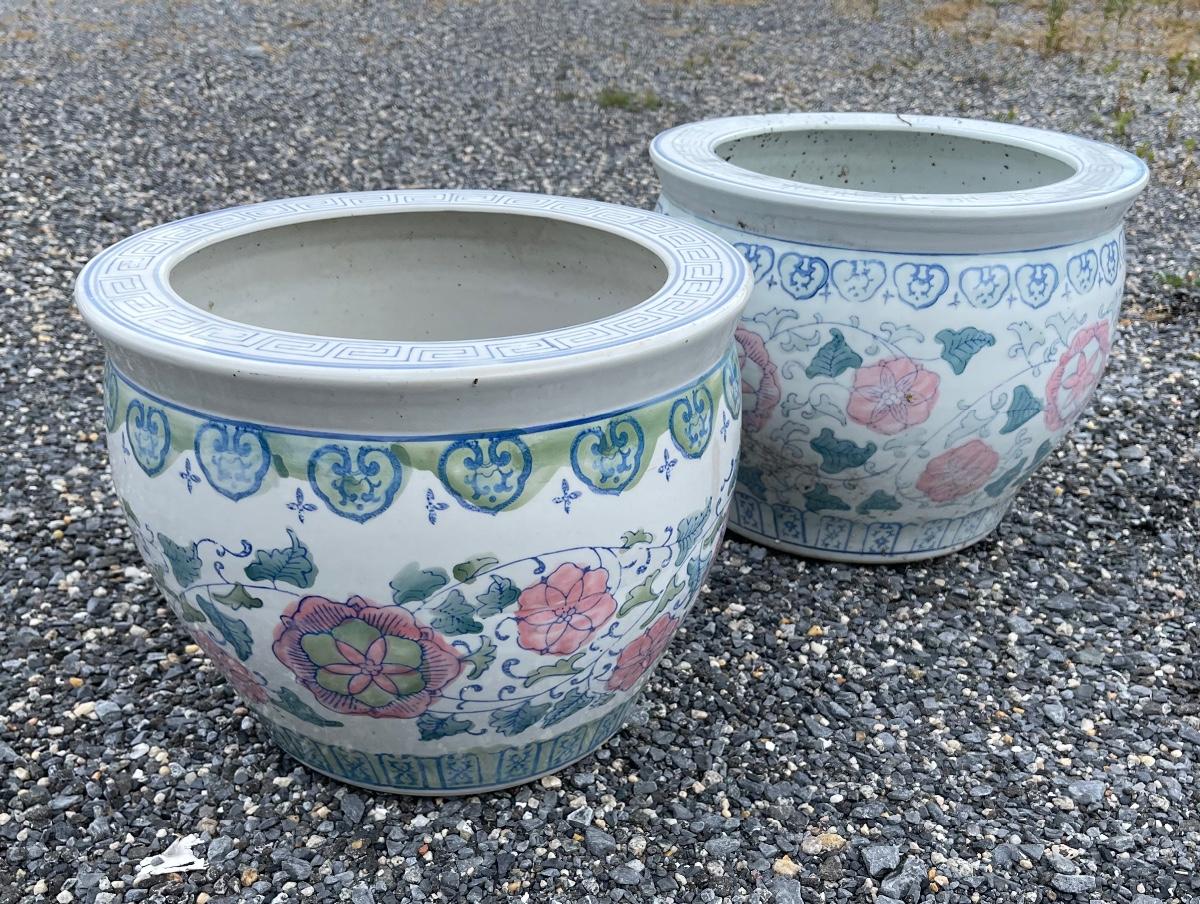 Two ceramic planters measuring 9-1/2” tall and 12” round