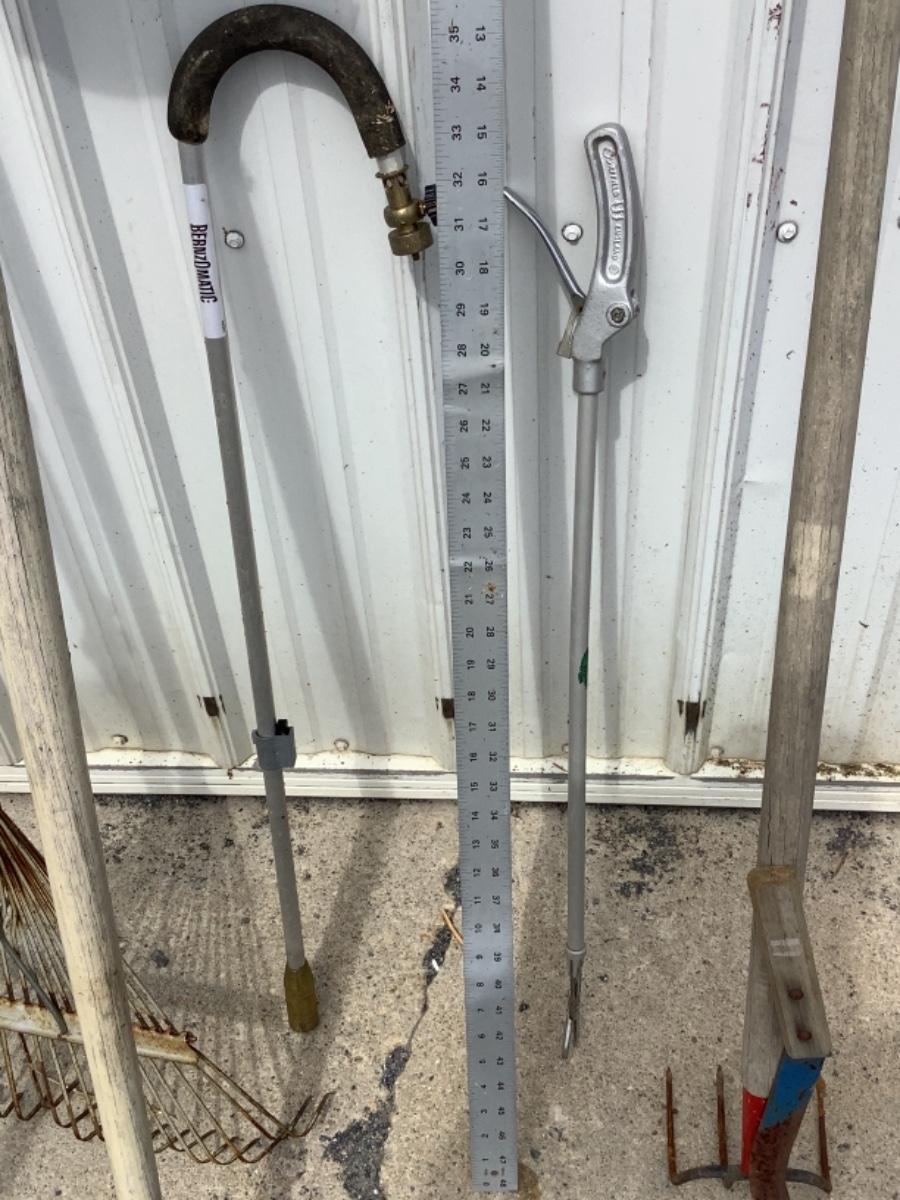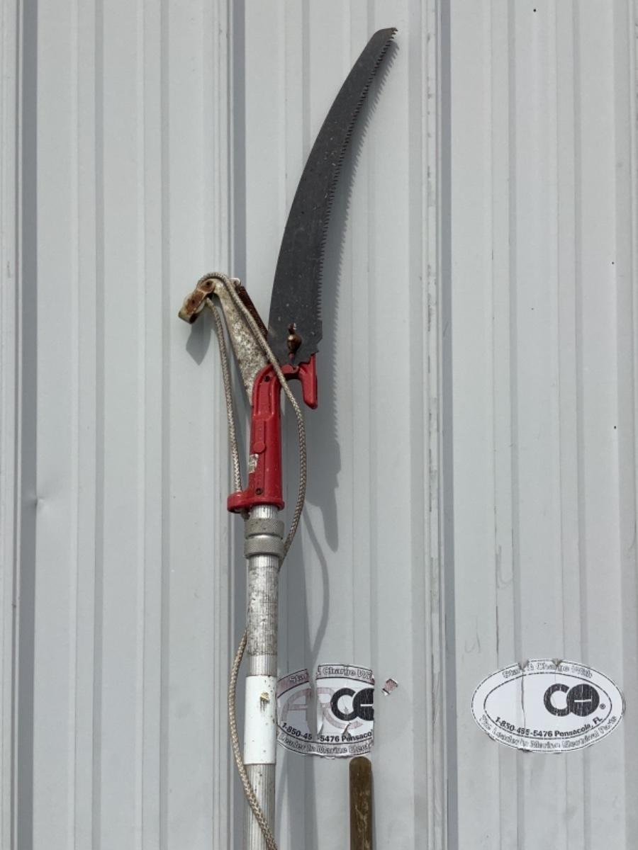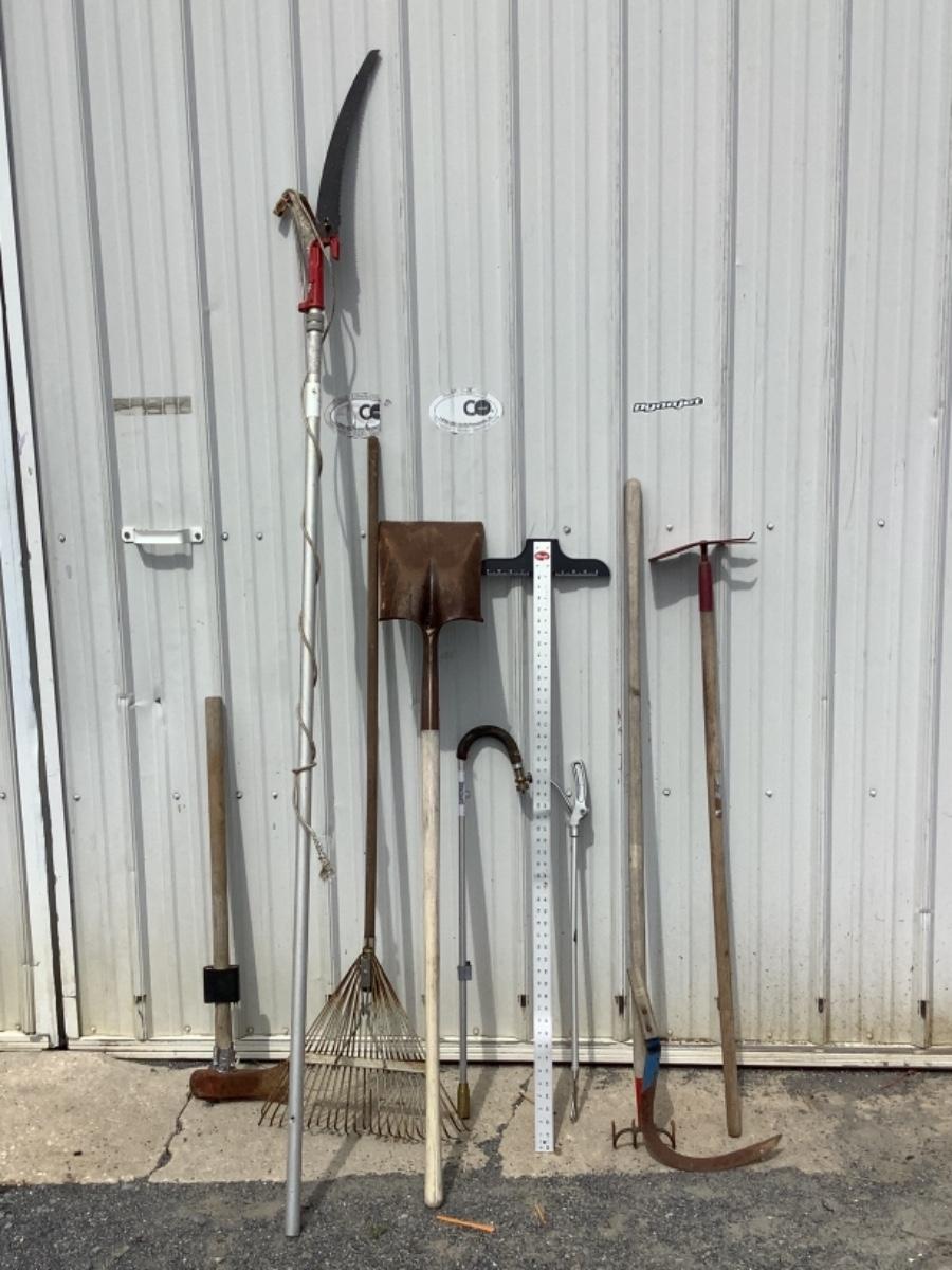 10 piece lot of gardening tools- pole saw, axe, rake, hoe and more
