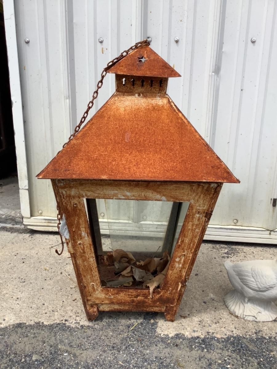 Lantern is missing two pieces of glass, measures 24” tall and 14-1/2” x 14-1/2”, comes with three composite Duck statues