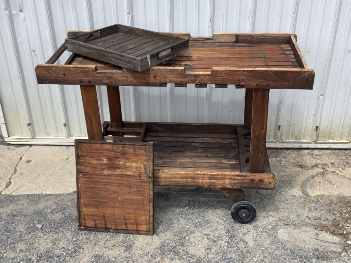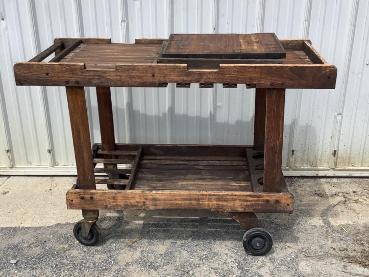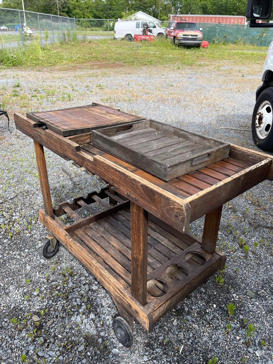 Cart measures 47-1/2” long 21” wide and 33” tall , needs to be refinished (see photos), comes with cutting board and tray