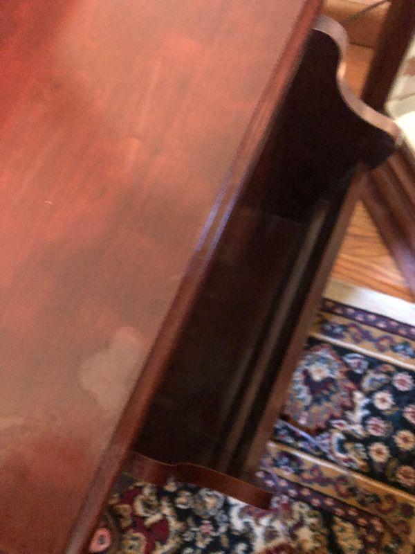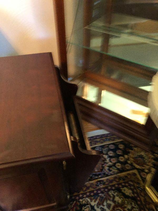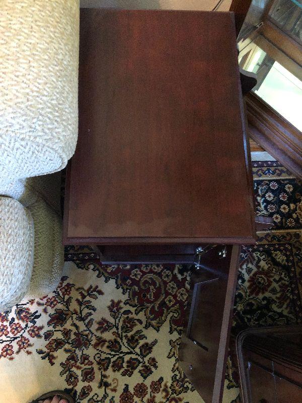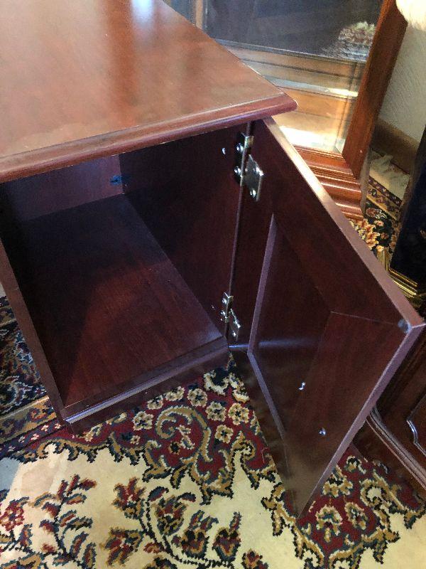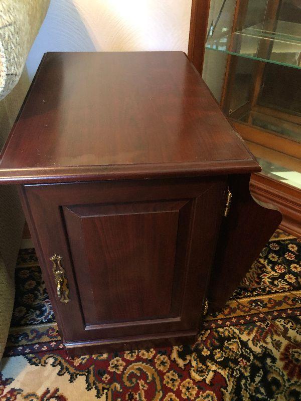 Cheerywood end table with side magazine rack and front cabinet. Good condition.