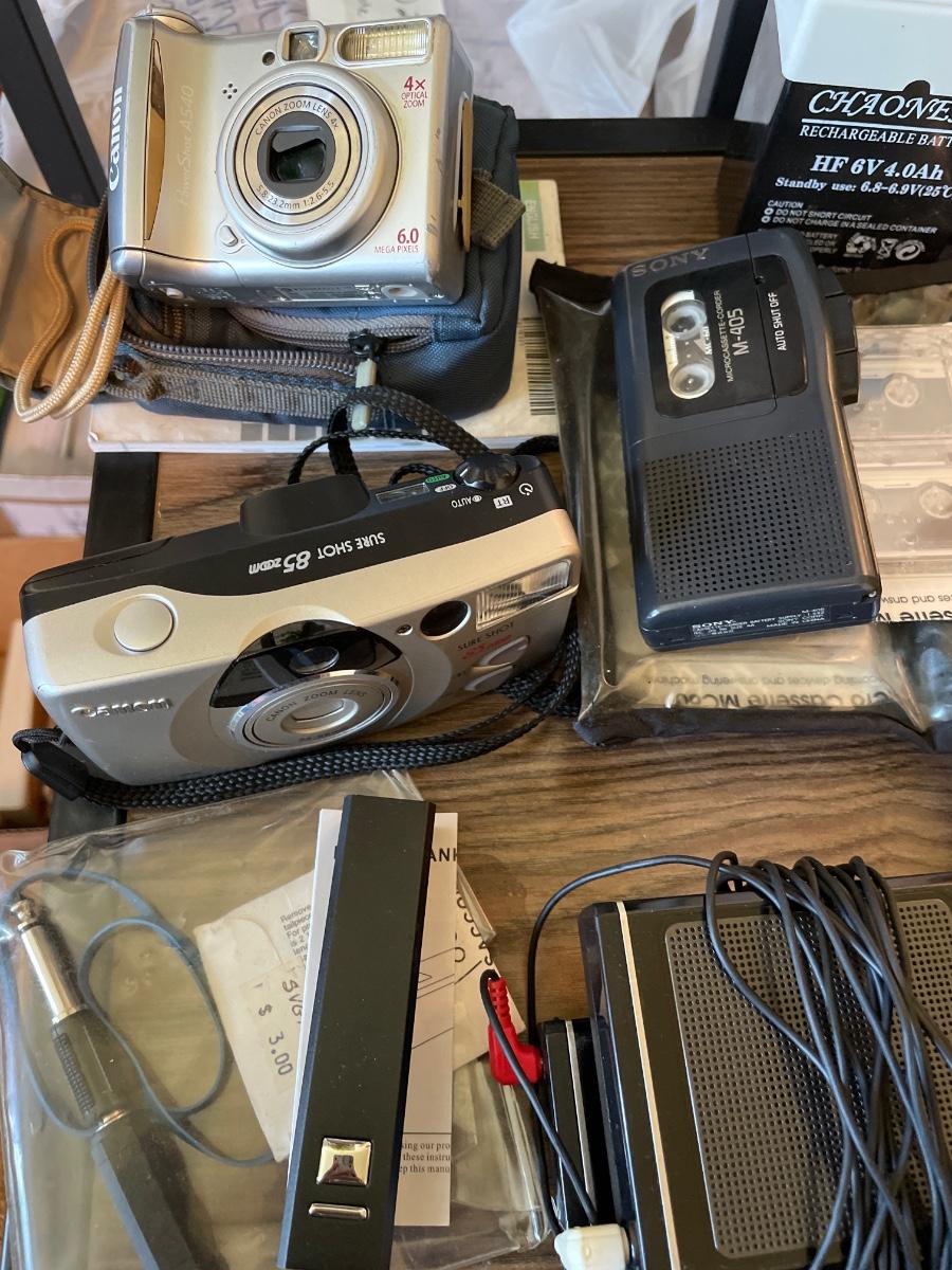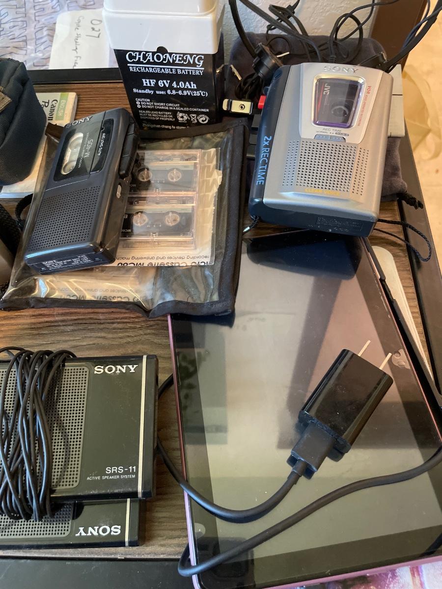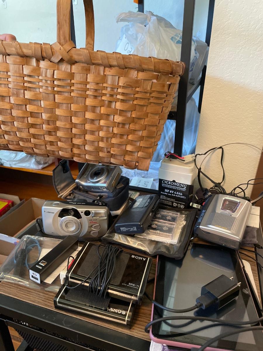 Basket full of Two Cannon cameras, Sony recorder, Sony speaker system tablet plus.