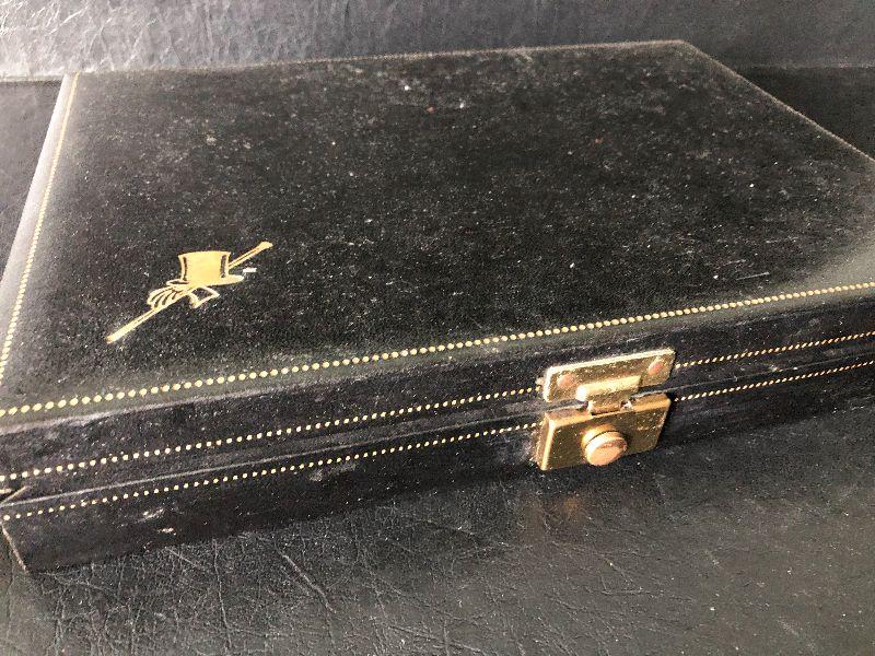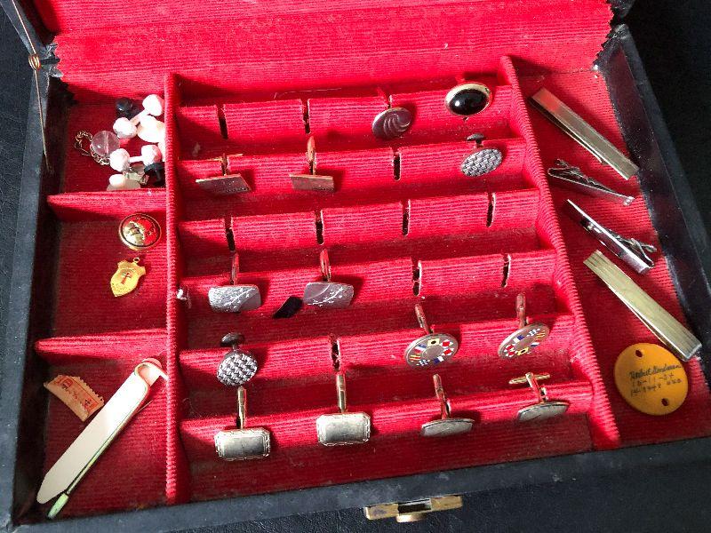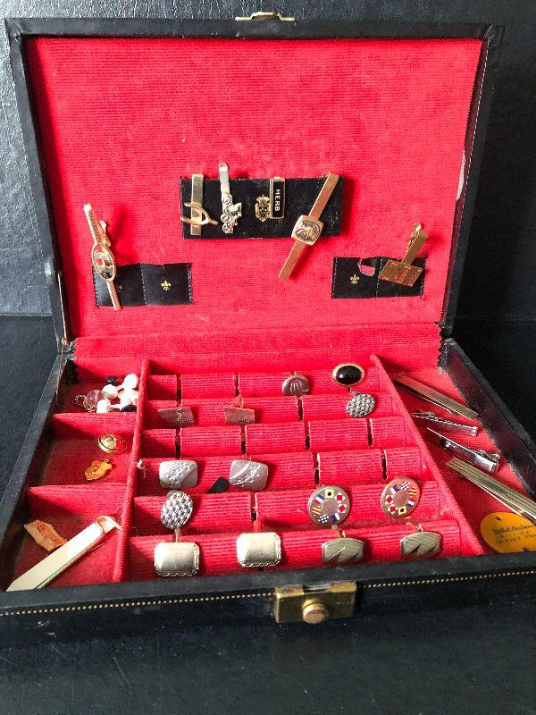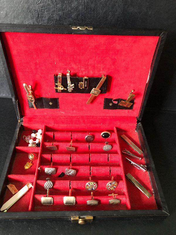 Classy mens jewelry box filled with men’s tie clips and cuff links