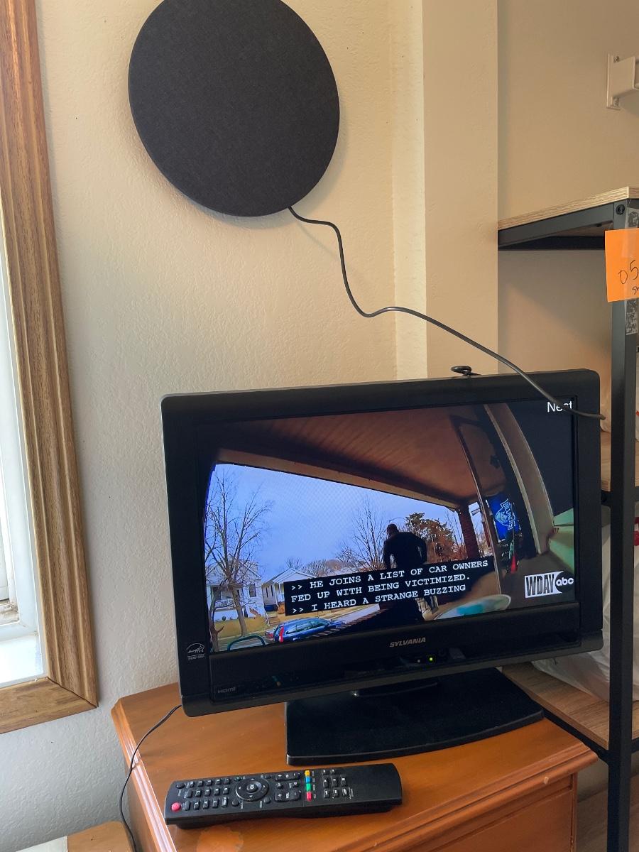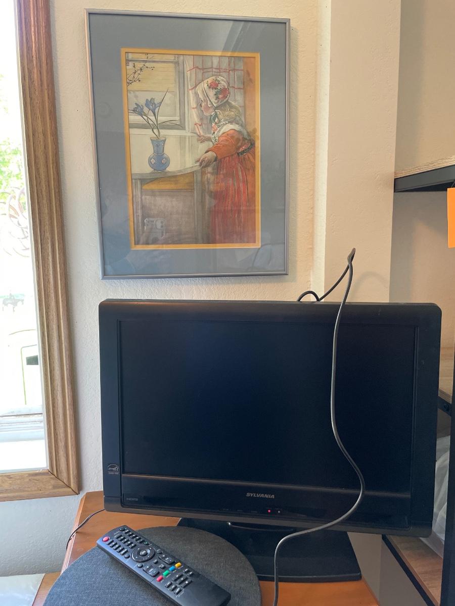 Sylvania 18” TV with antenna and remote. Plus wall art of small child. Stand not included