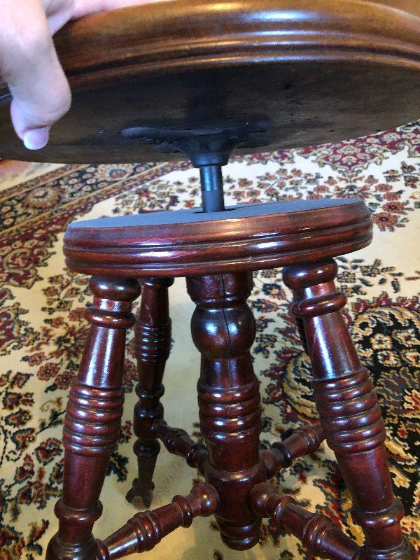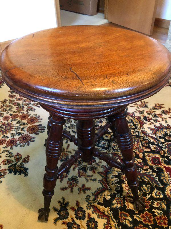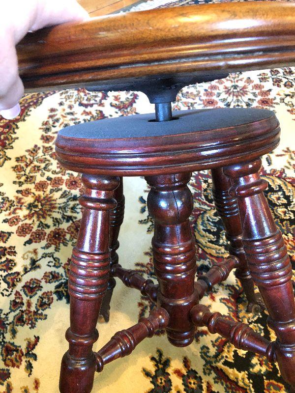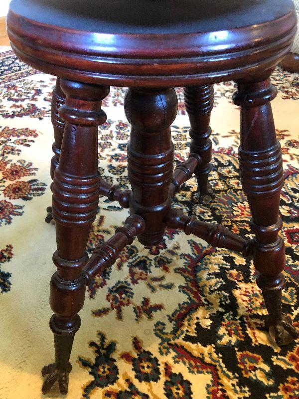 Antique 19th Century A. Merriam Oat Piano Stool. Glass ball and claw. Claw foot holds crystal ball. Three balls in great condition, one ball is chipped. Stool size is adjustable. Great rare find!