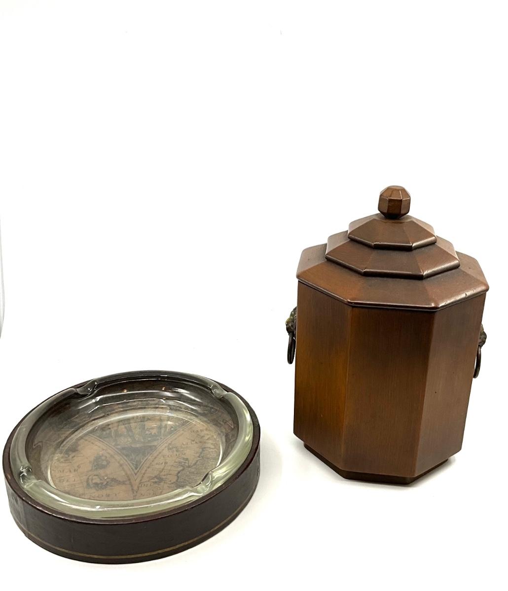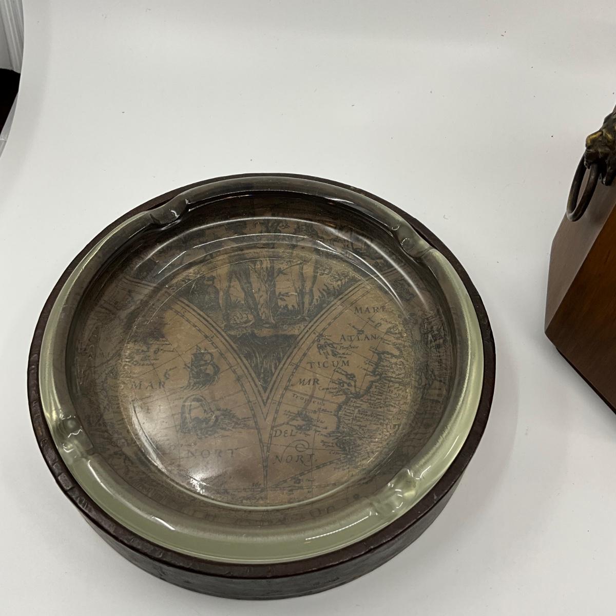 Ashtray has leather side with world globe designed underneath glass ashtray
