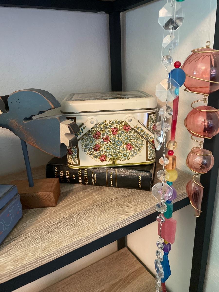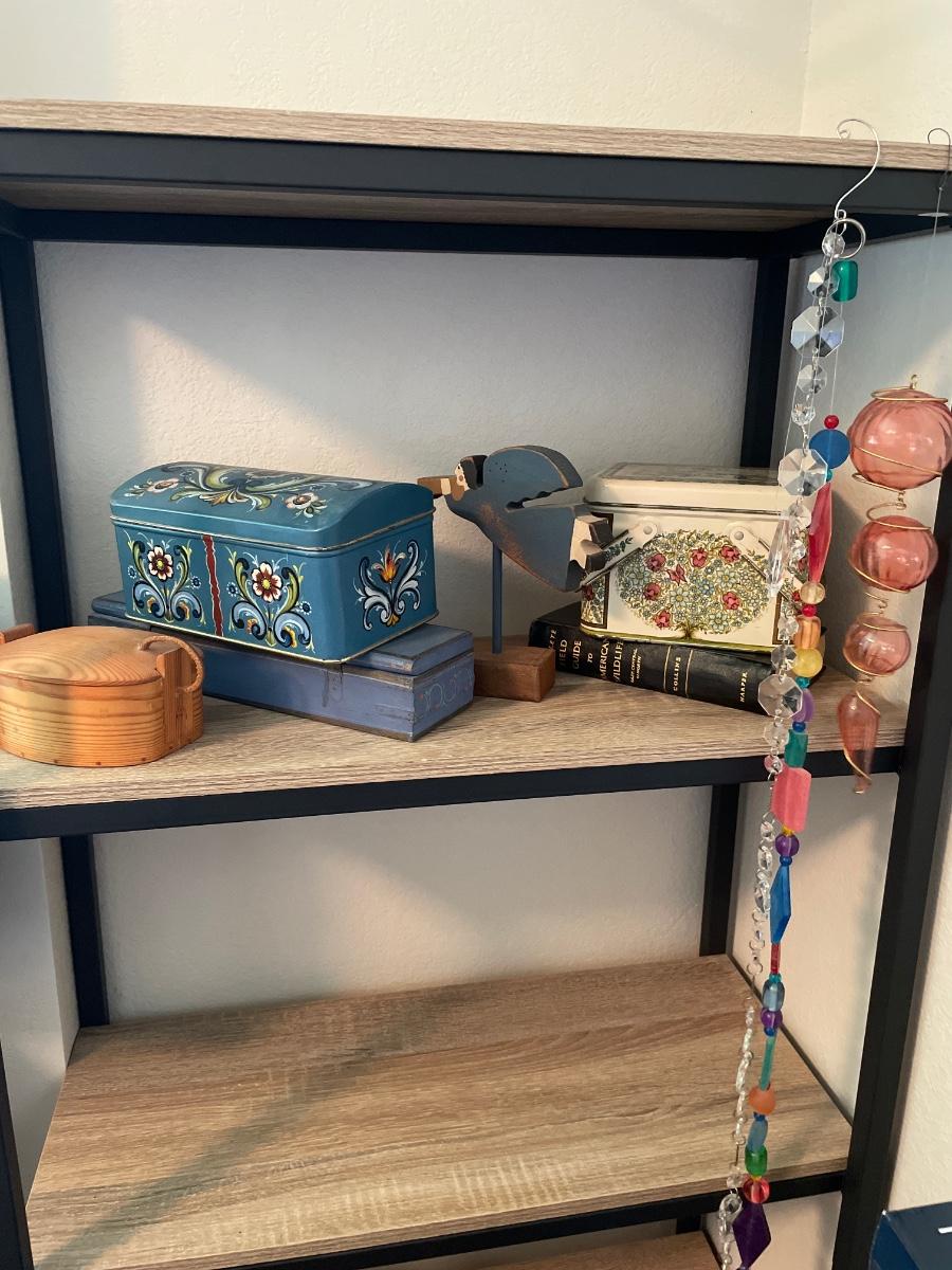 Scandinavian wood boxes, book, wind chimes and more (not including salmon colored glass hanging item -sorry! Was removed after picture was taken)