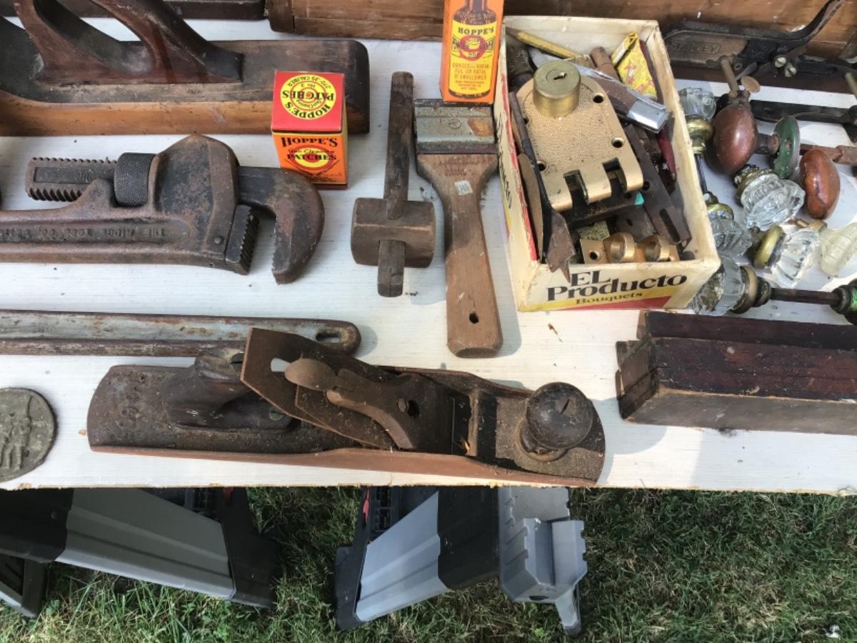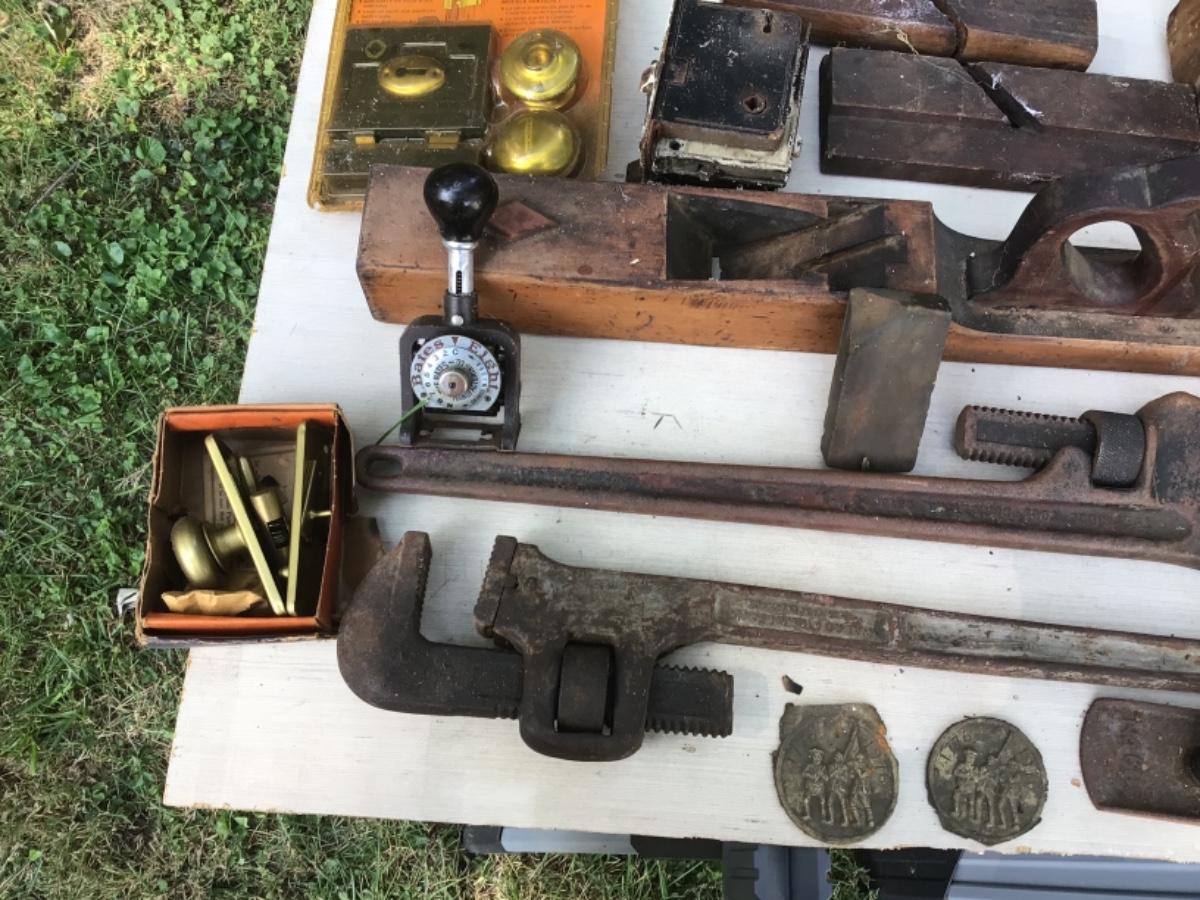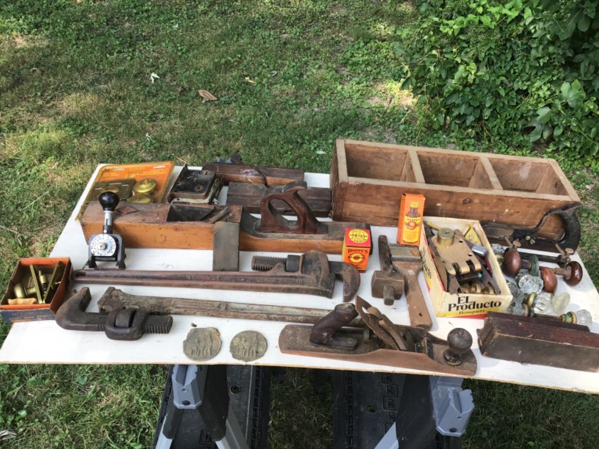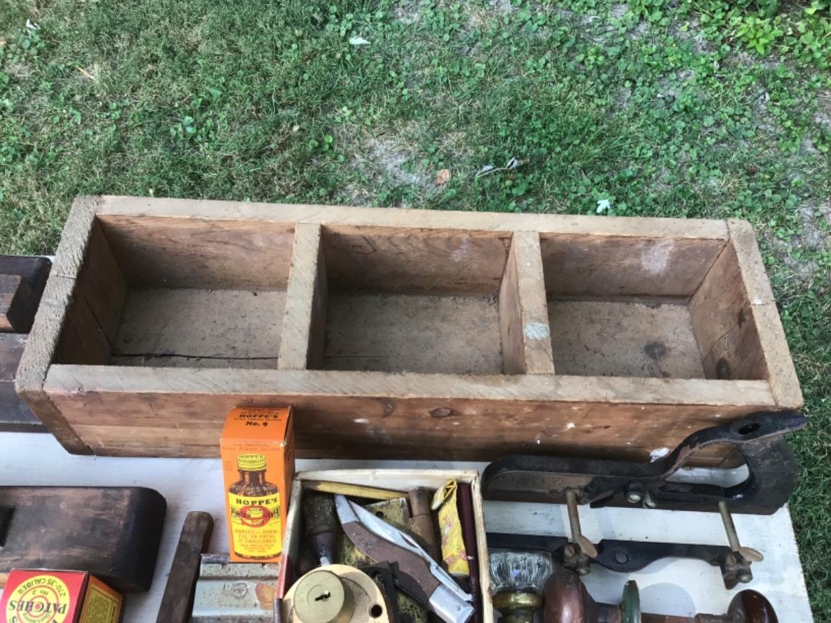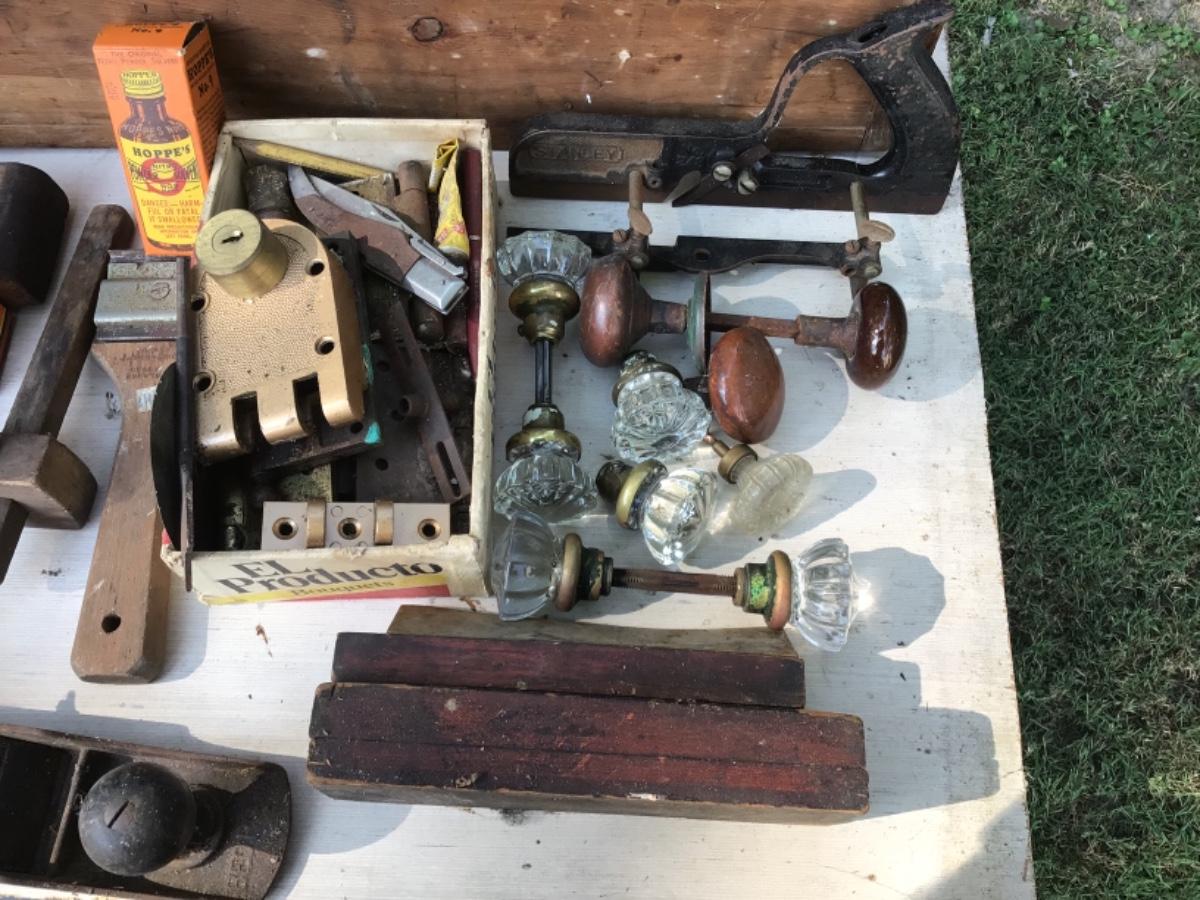 Large wooden toolbox with three compartment with an organizer, over 20 items of old vintage door scrapers, old door lock mechanisms, large old wrenches, Old glass door knobs, and two old metals