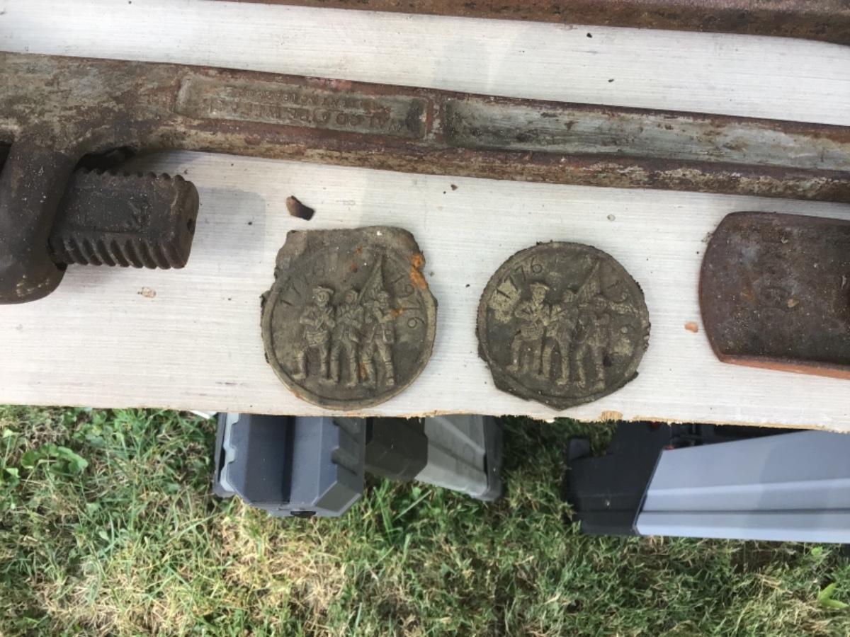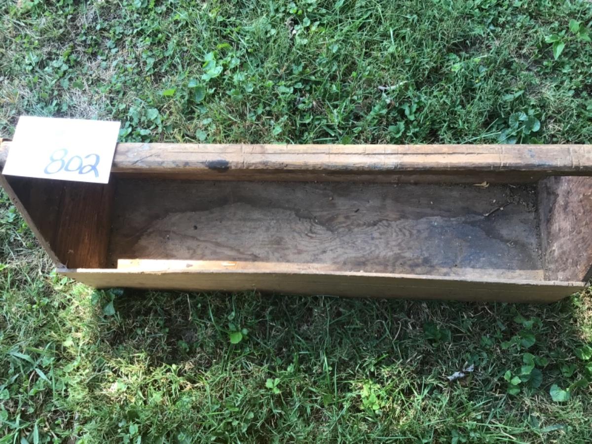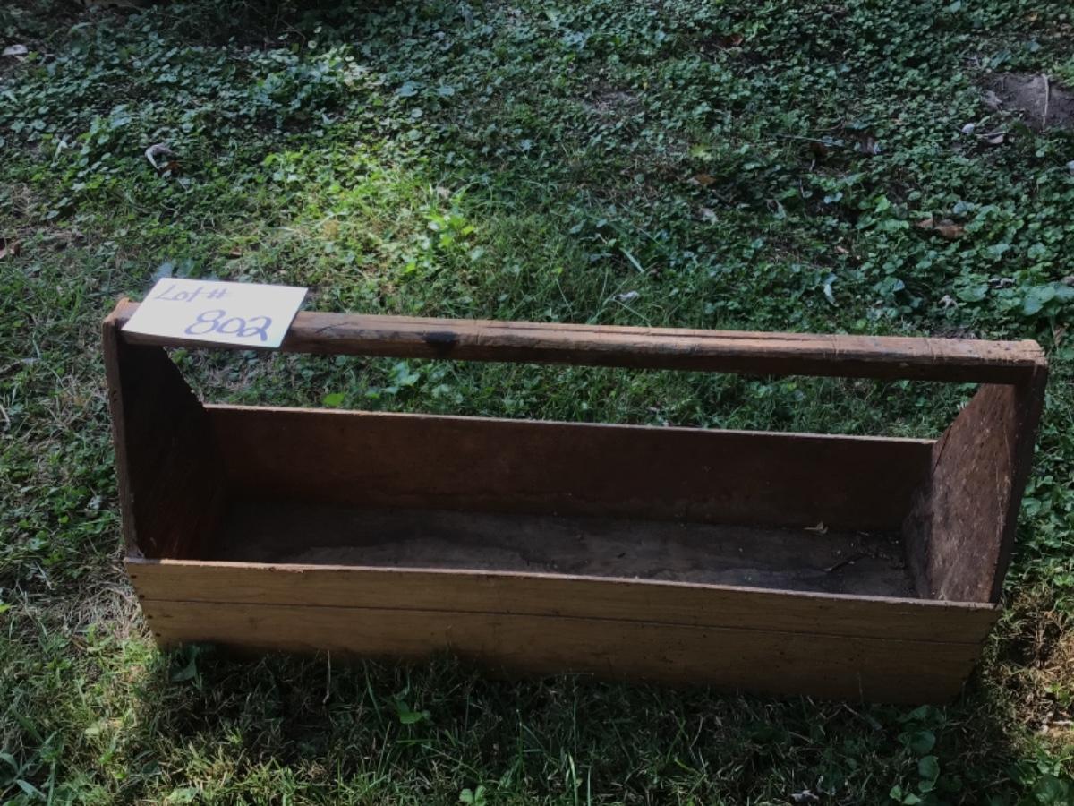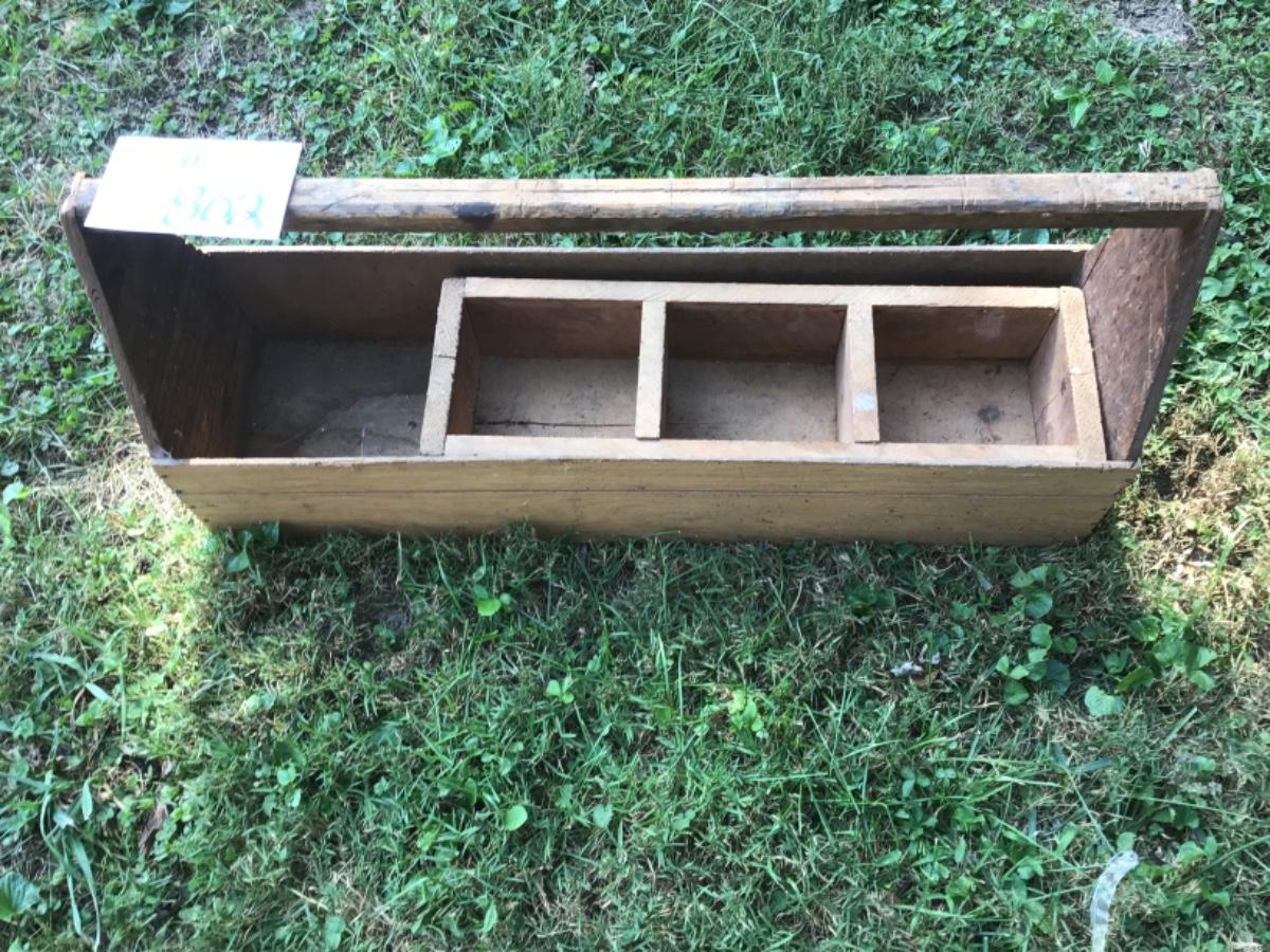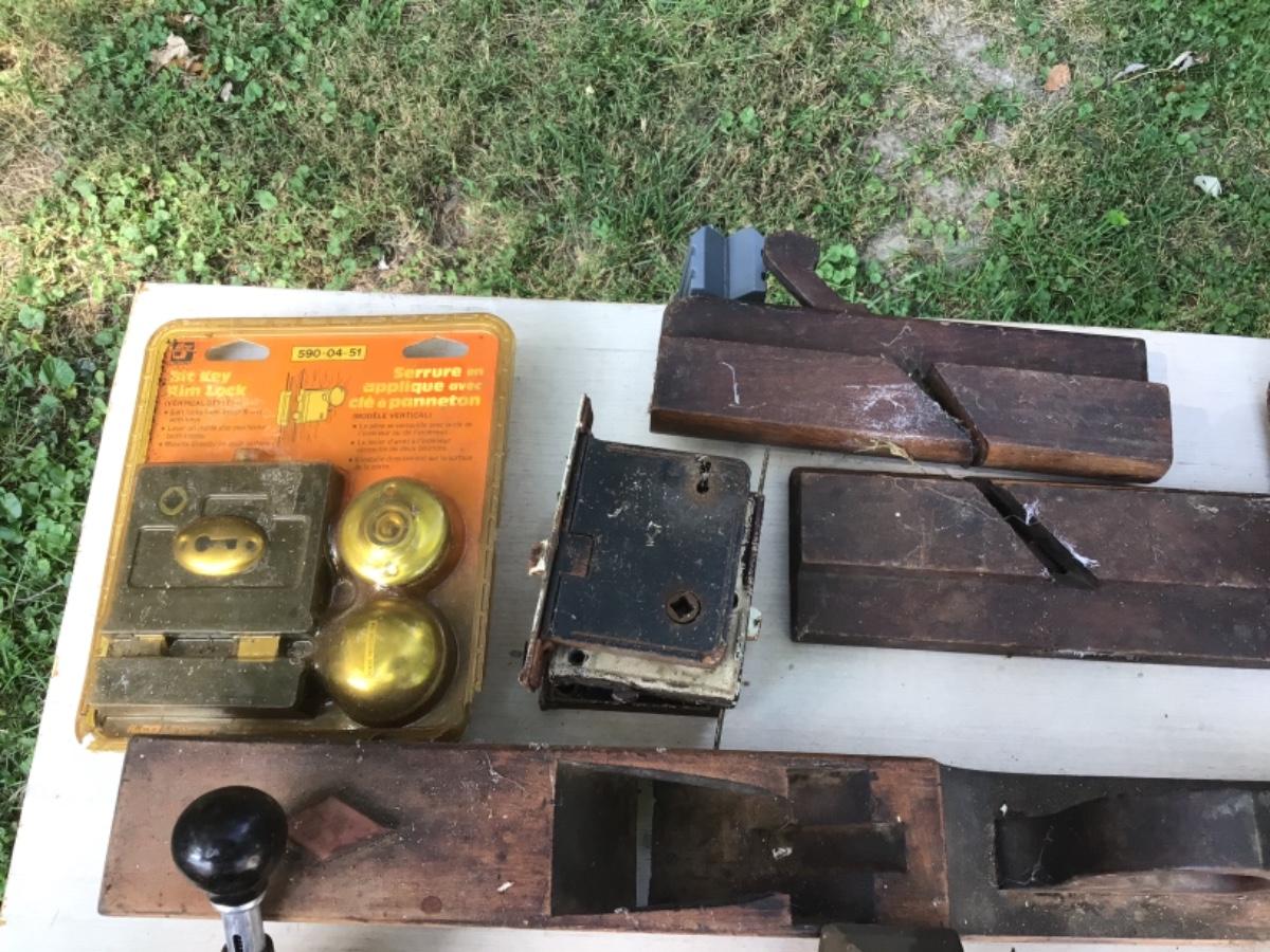 Large wooden toolbox with three compartment with an organizer, over 20 items of old vintage door scrapers, old door lock mechanisms, large old wrenches, Old glass door knobs, and two old metals