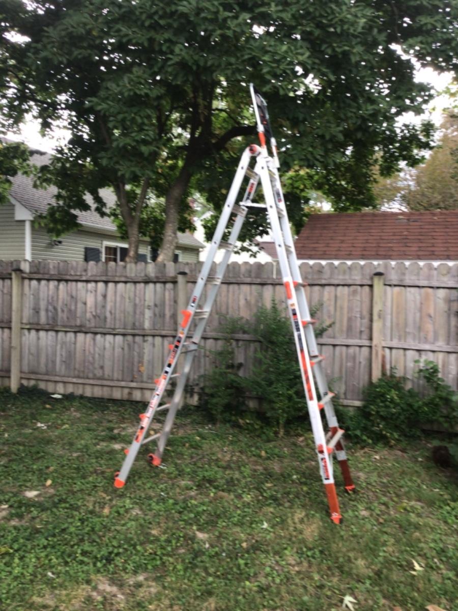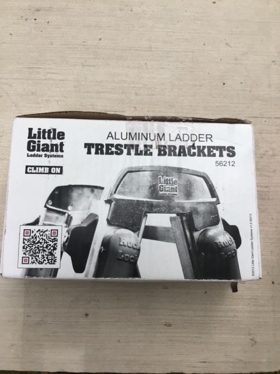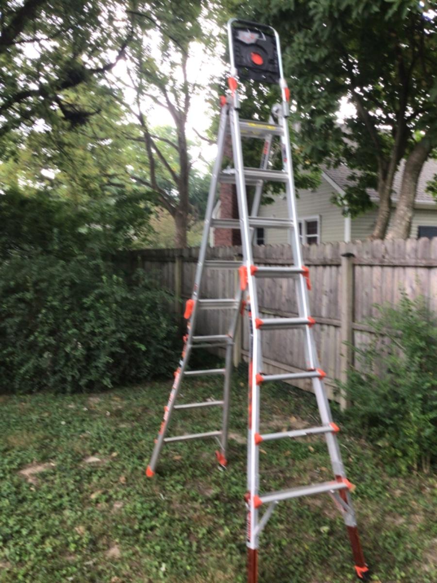 Little giant extreme extension ladder, able to extend to 14 foot. Multi positional latter. Regular standard height at regular position is 9 feet tall. Includes aluminum ladder trestle brackets.