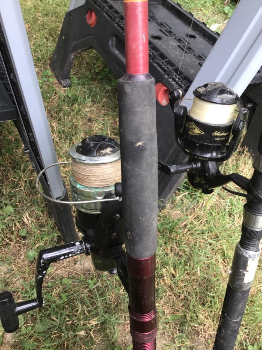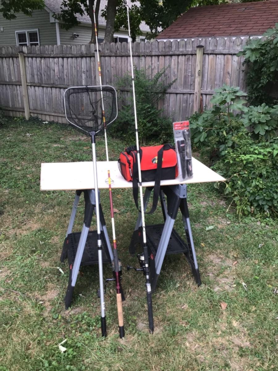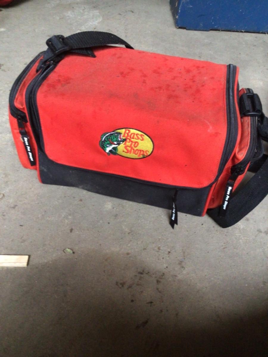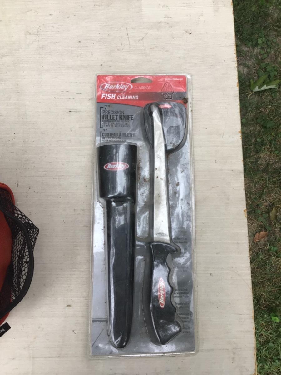 Fishing and tackle box light. Comes with a fish cleaning precision knife 7 inches. Also comes with two Shakespeare fishing rods worn condition, one extendable fishing net, and one Bass Pro shops tacklebox.
