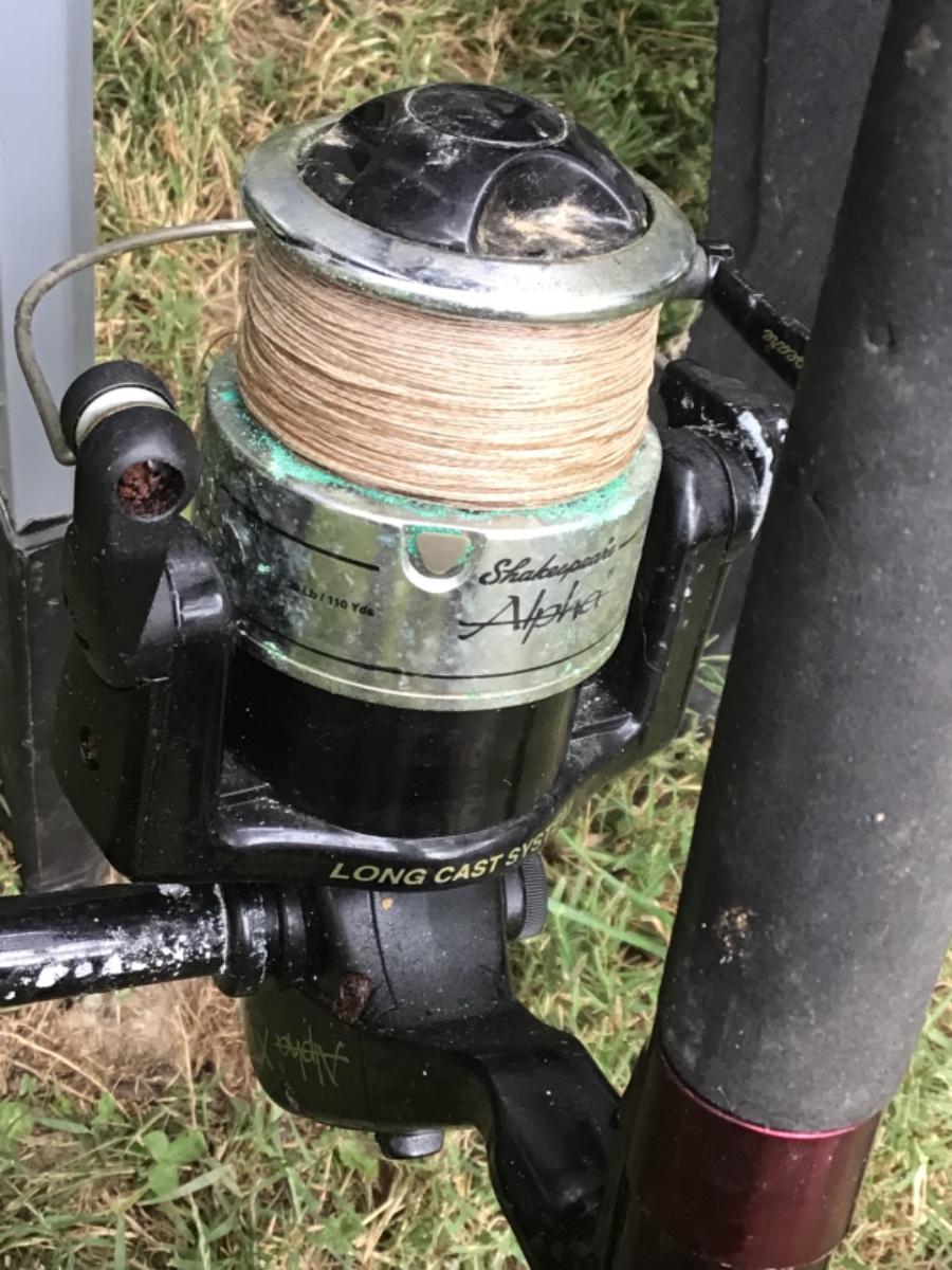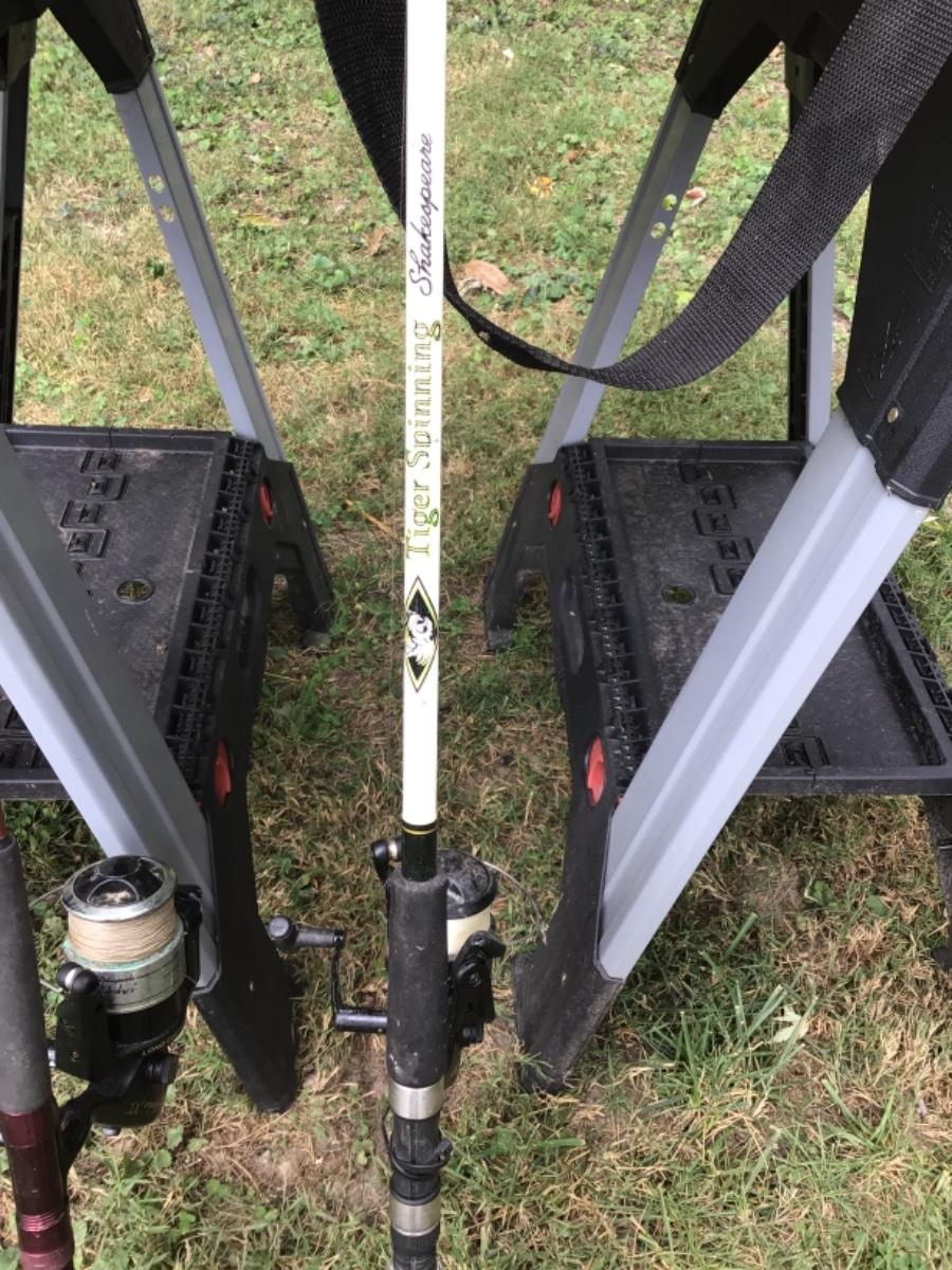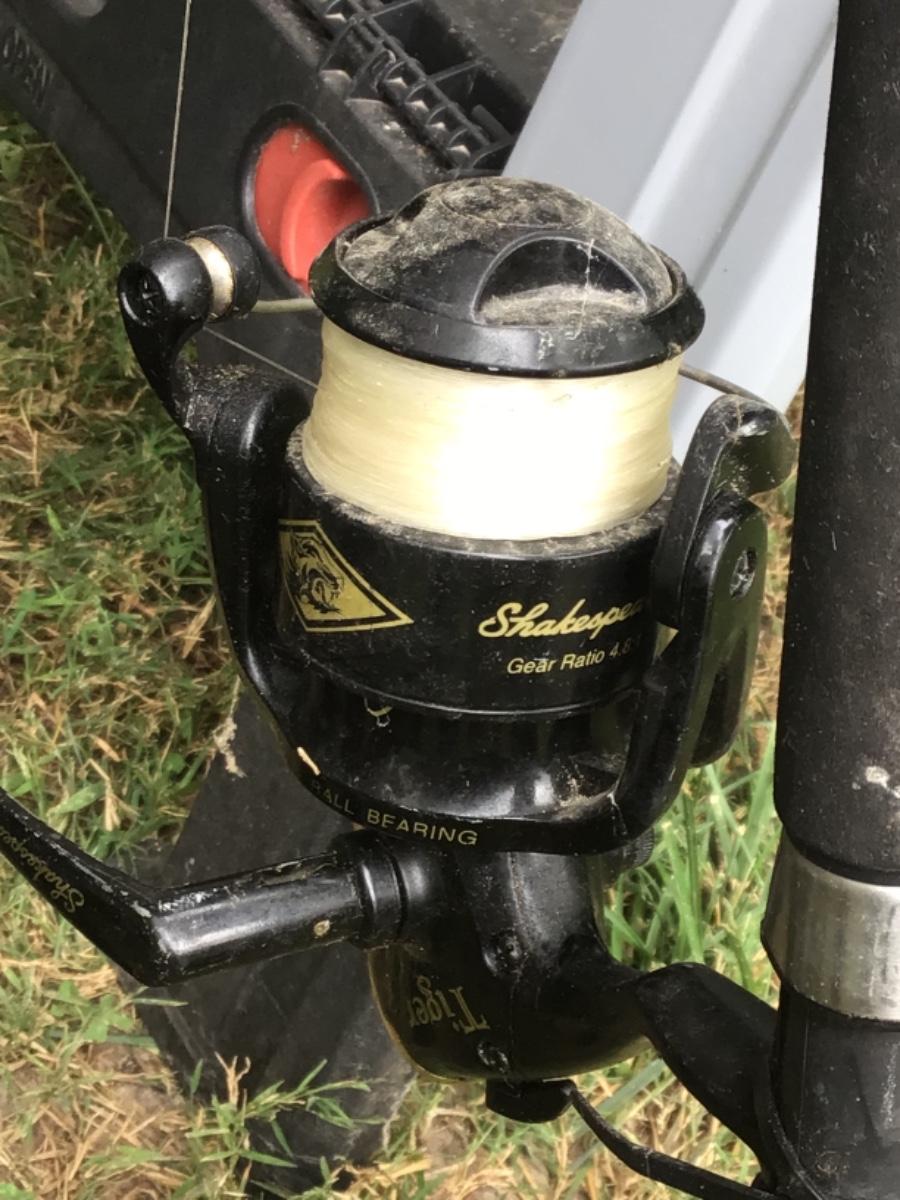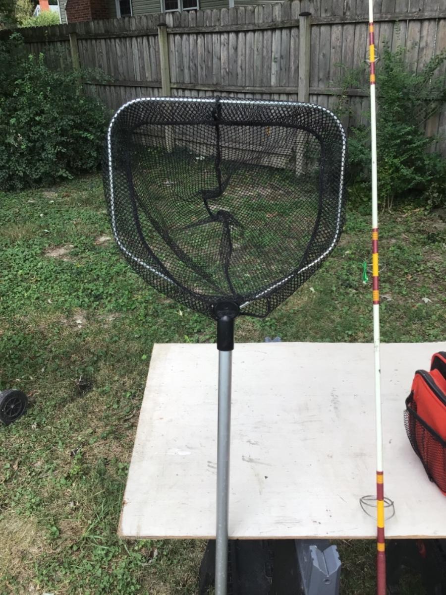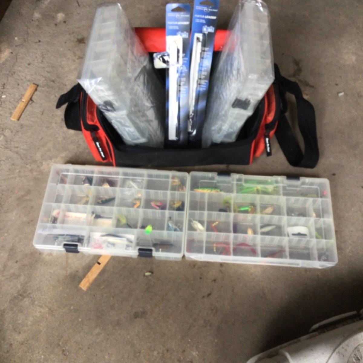 Fishing and tackle box light. Comes with a fish cleaning precision knife 7 inches. Also comes with two Shakespeare fishing rods worn condition, one extendable fishing net, and one Bass Pro shops tacklebox.