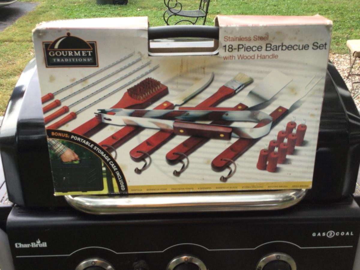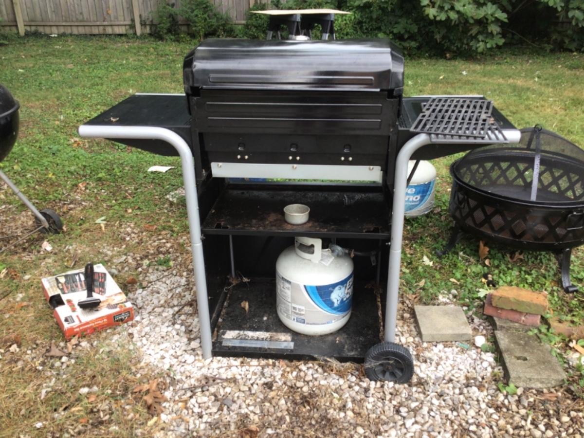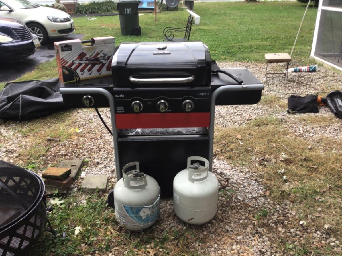 One charbroil gas to Cole grill three burner with one side burner grill. Comes with three propane tanks, 18 piece barbecue tool set, and spare grill brush and grill cover.