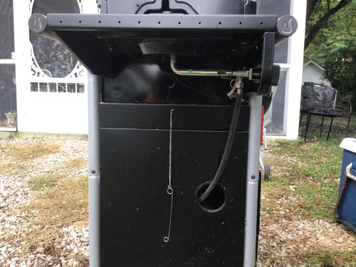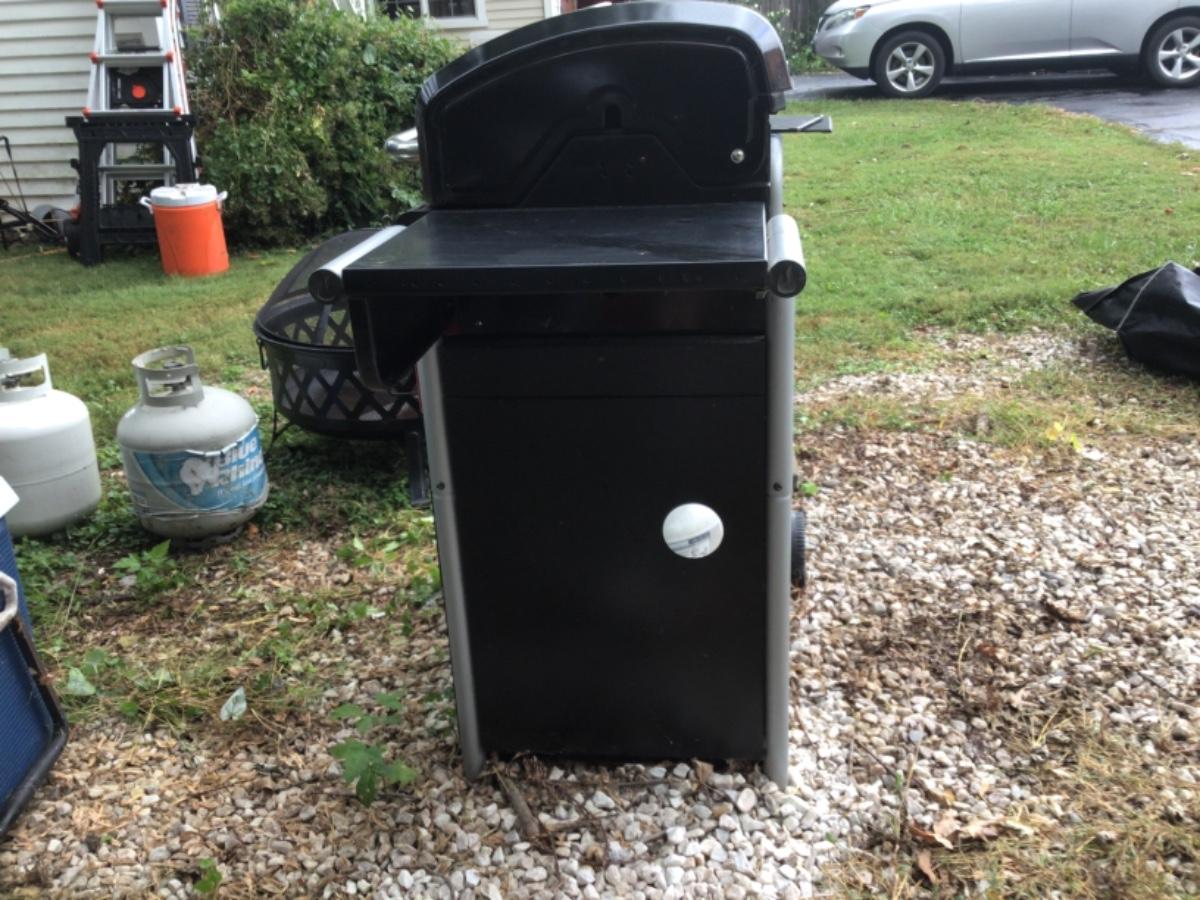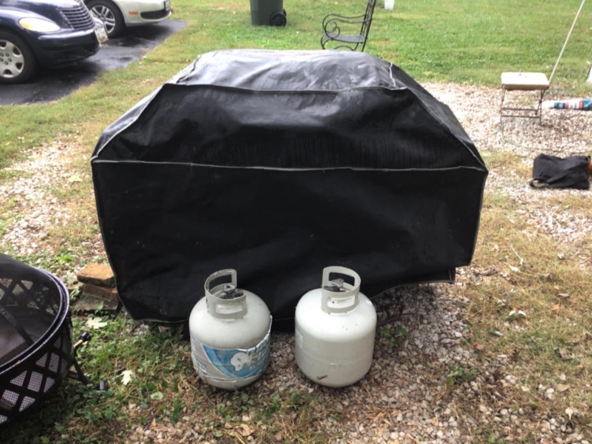 One charbroil gas to Cole grill three burner with one side burner grill. Comes with three propane tanks, 18 piece barbecue tool set, and spare grill brush and grill cover.