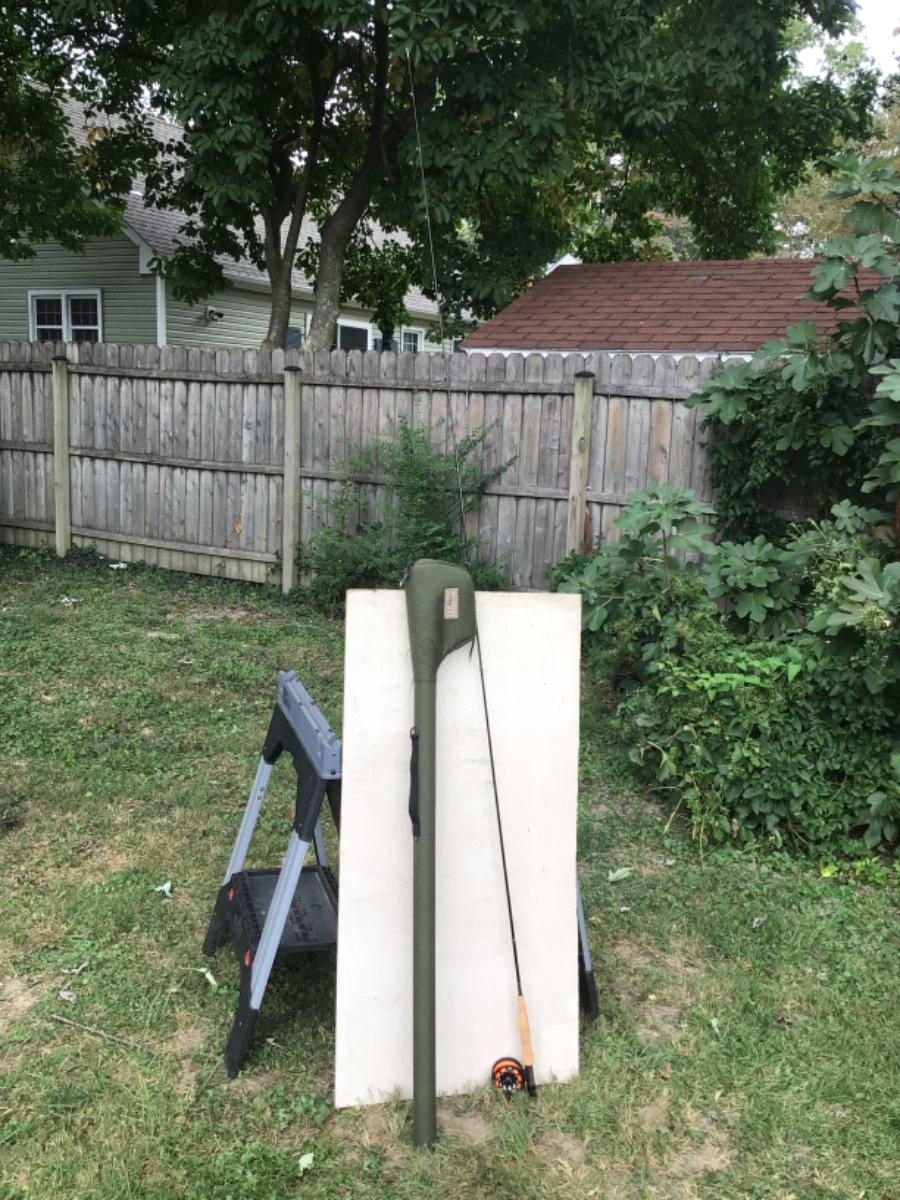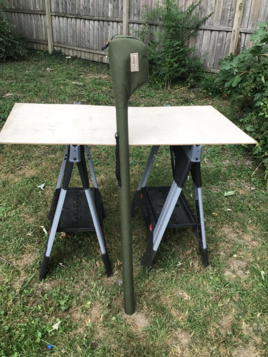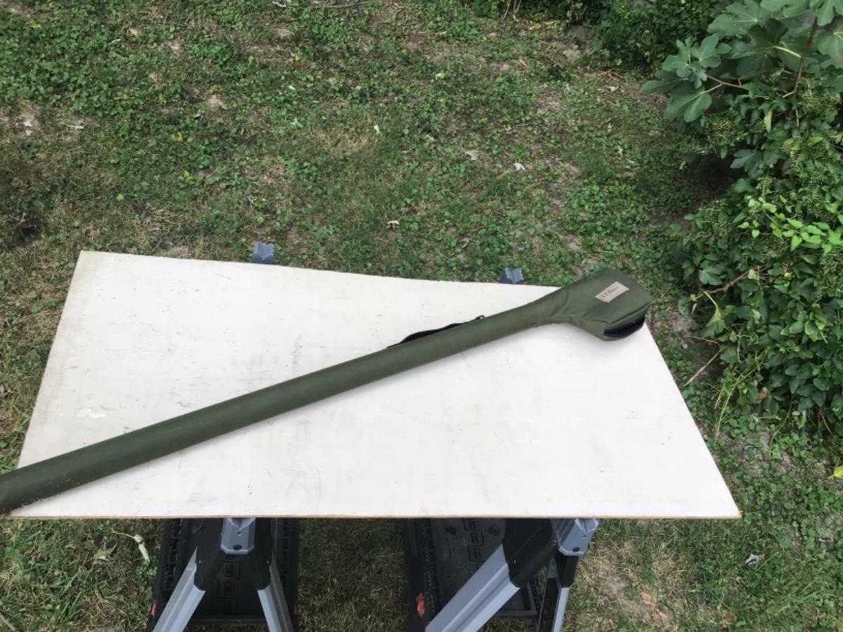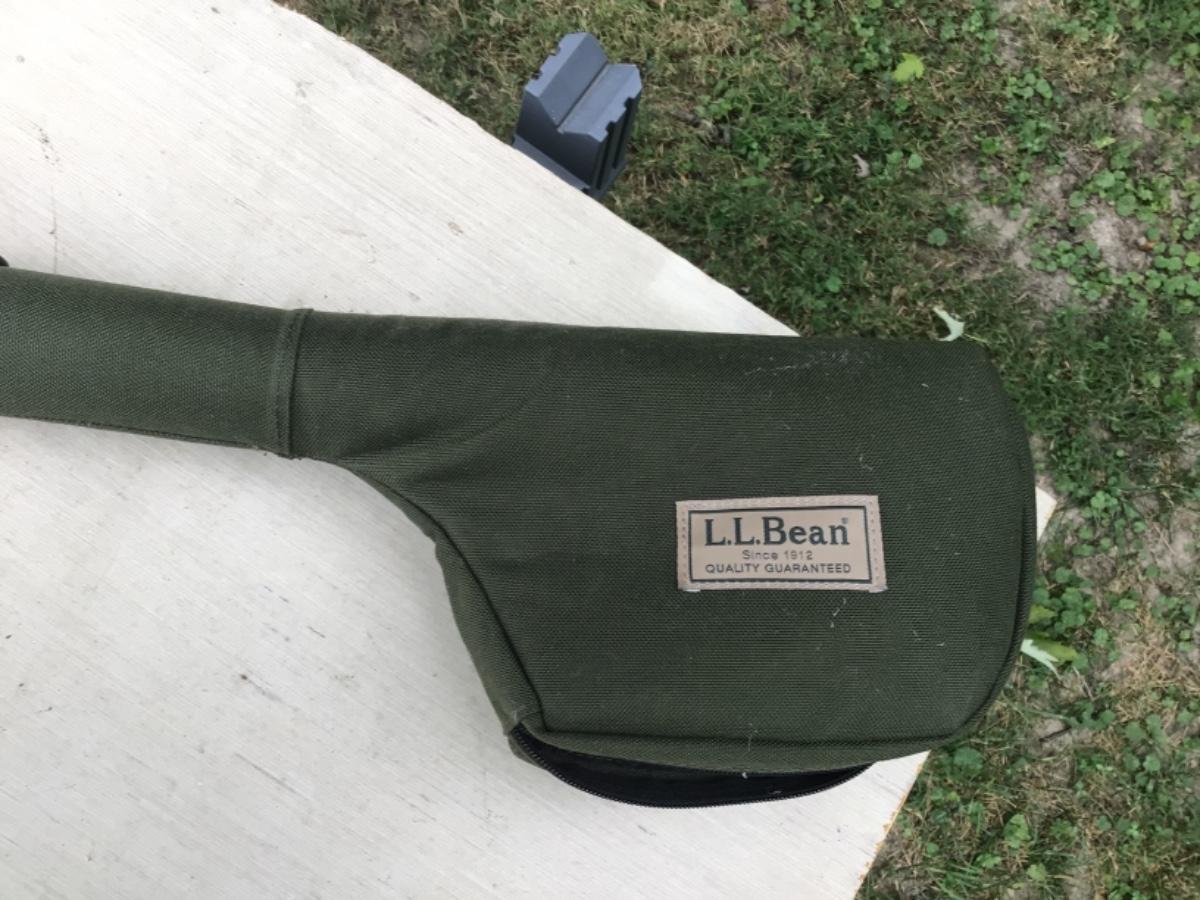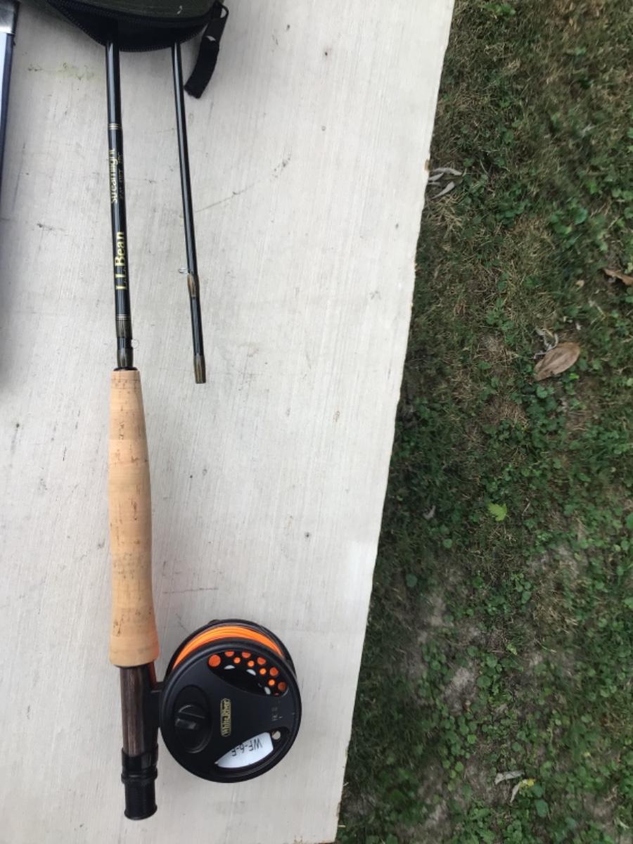 One LL Bean fly fishing rod with dark green carrying case. Orange fishing line wire on but I’ll ride. Extends to 9 feet in length.