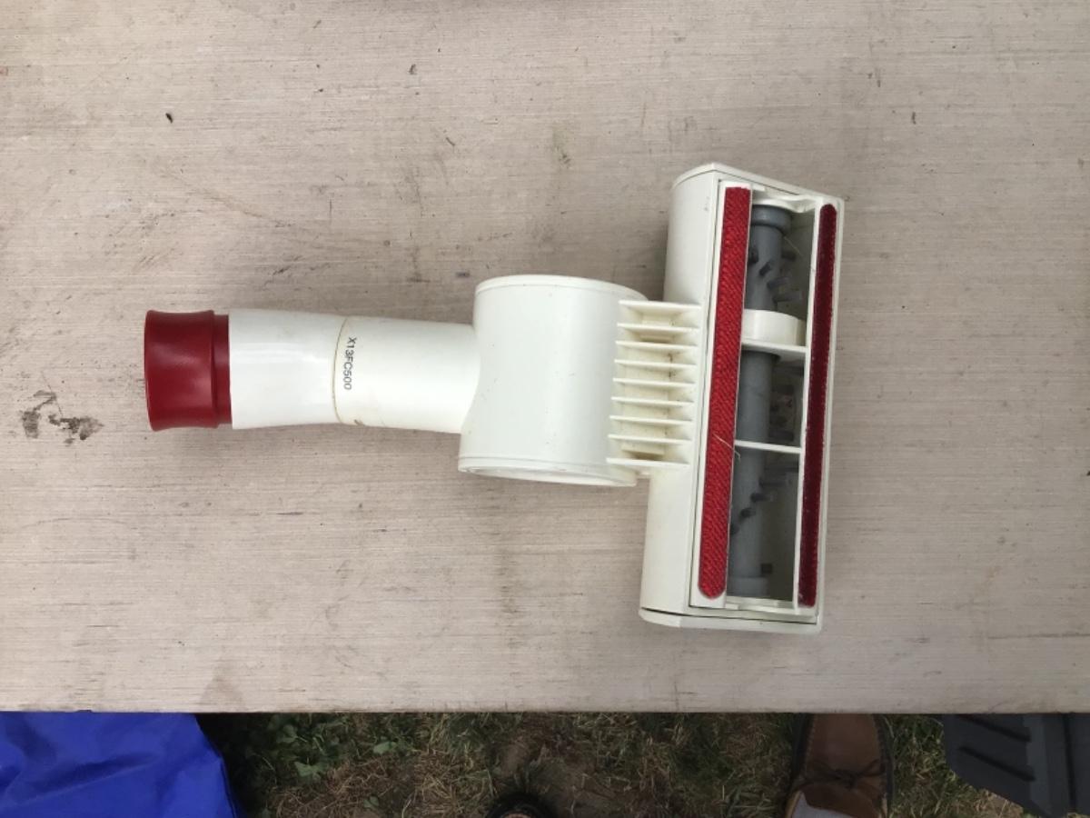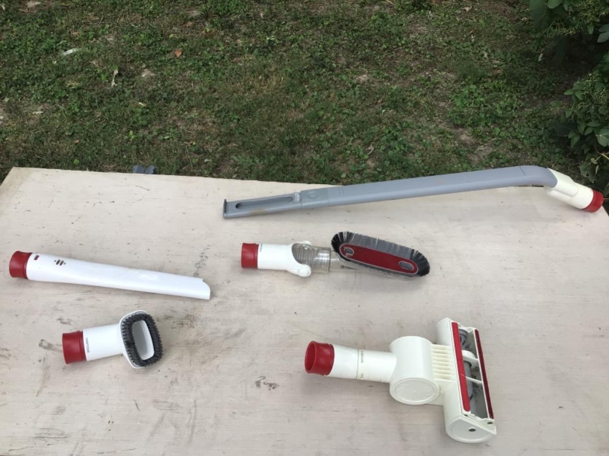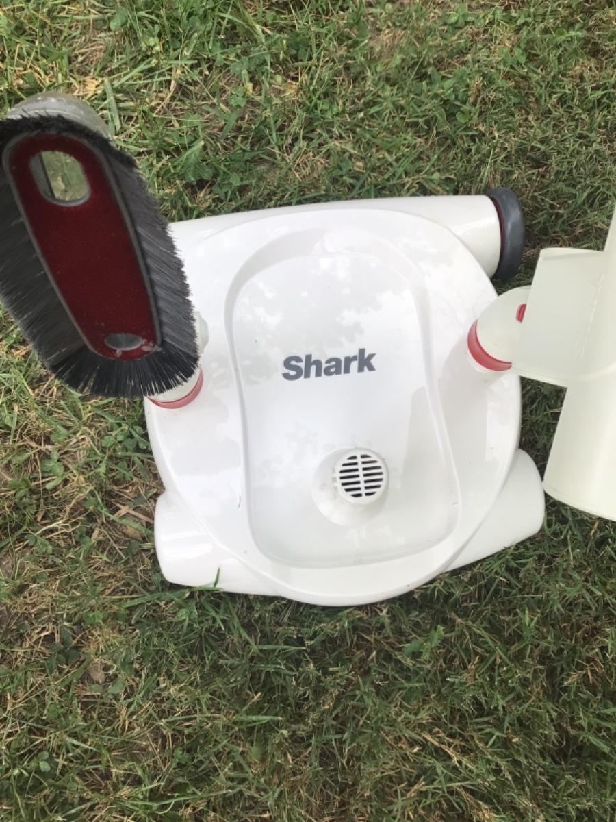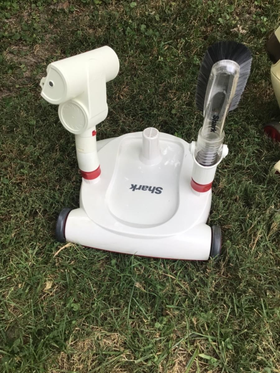 Comes with mobile base with two attachment ports, shark vacuum is in working condition. Comes with five extra nozzles. One hard to reach extension brush, goes to 42 inches in extended length. Comes with one small oval brush, one small hand nozzle brush, one point brush, One small Power brush roll.
