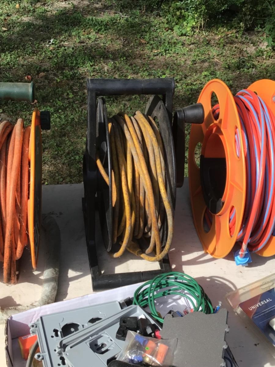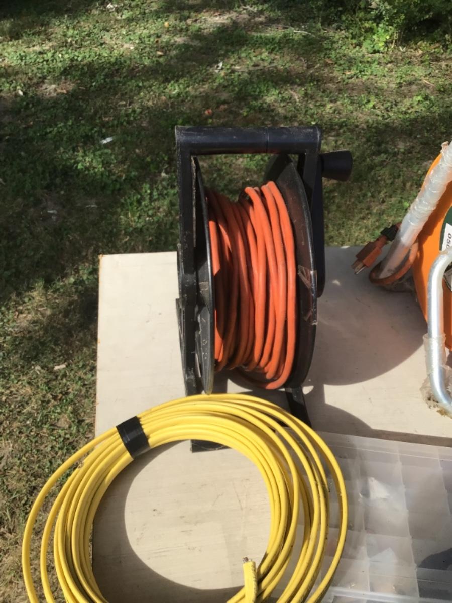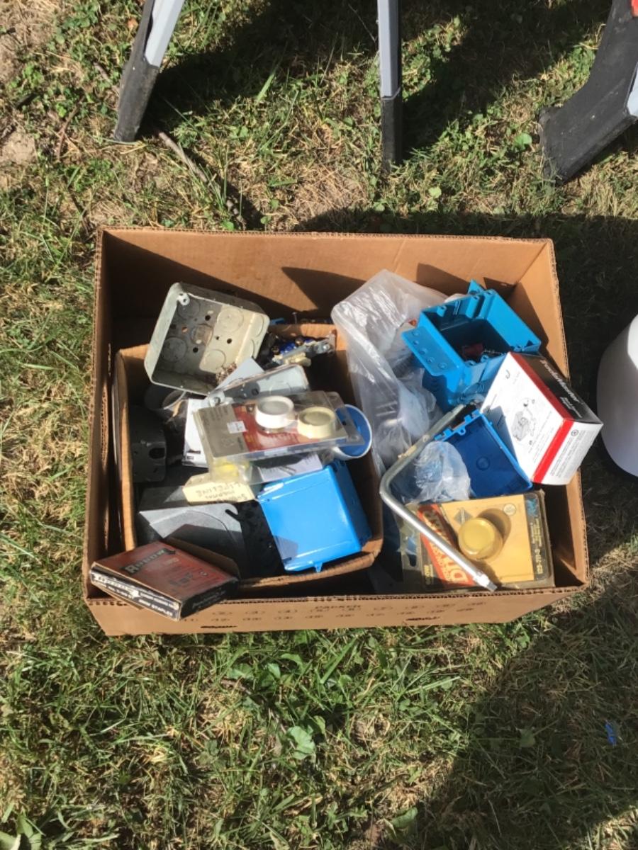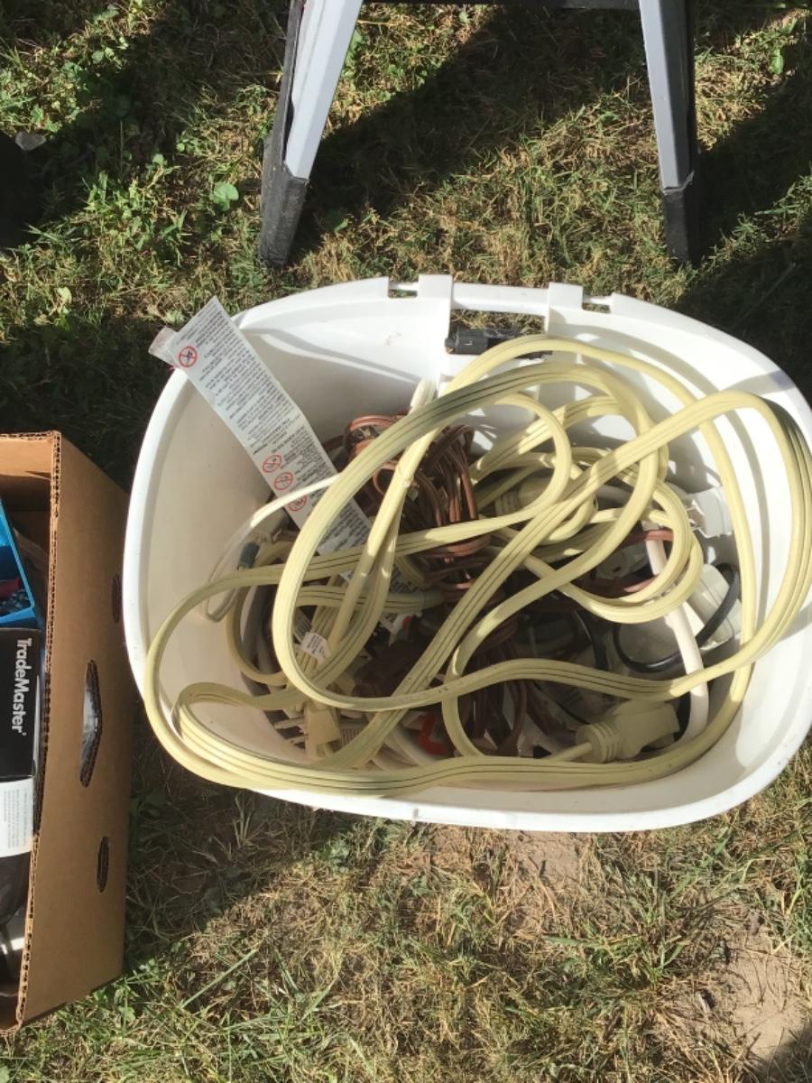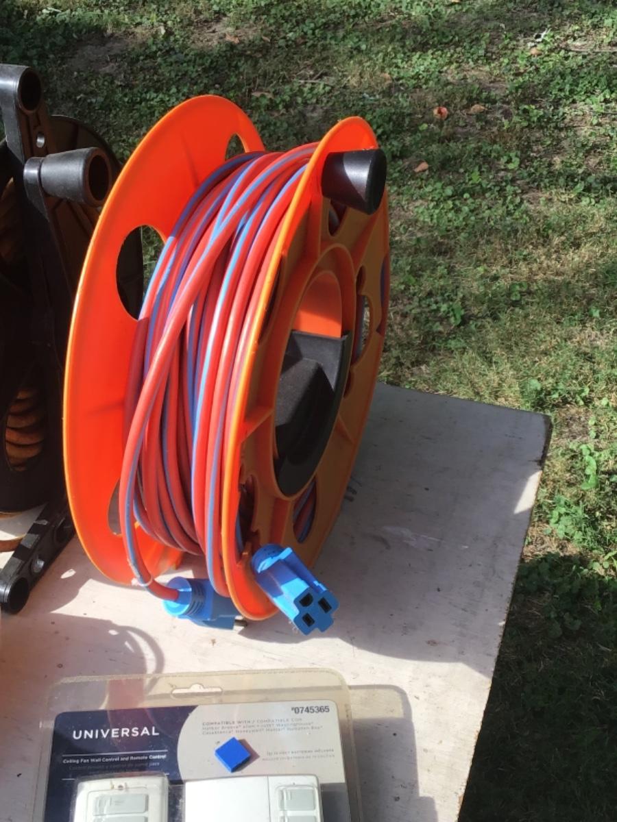 Large electrical light comes with, four extension cord wheels, universal ceiling fan remote kit, large white bin of extension cords, yellow ground electrical wire, large cardboard box of new and old junction boxes. Also other small electrical components and pieces.