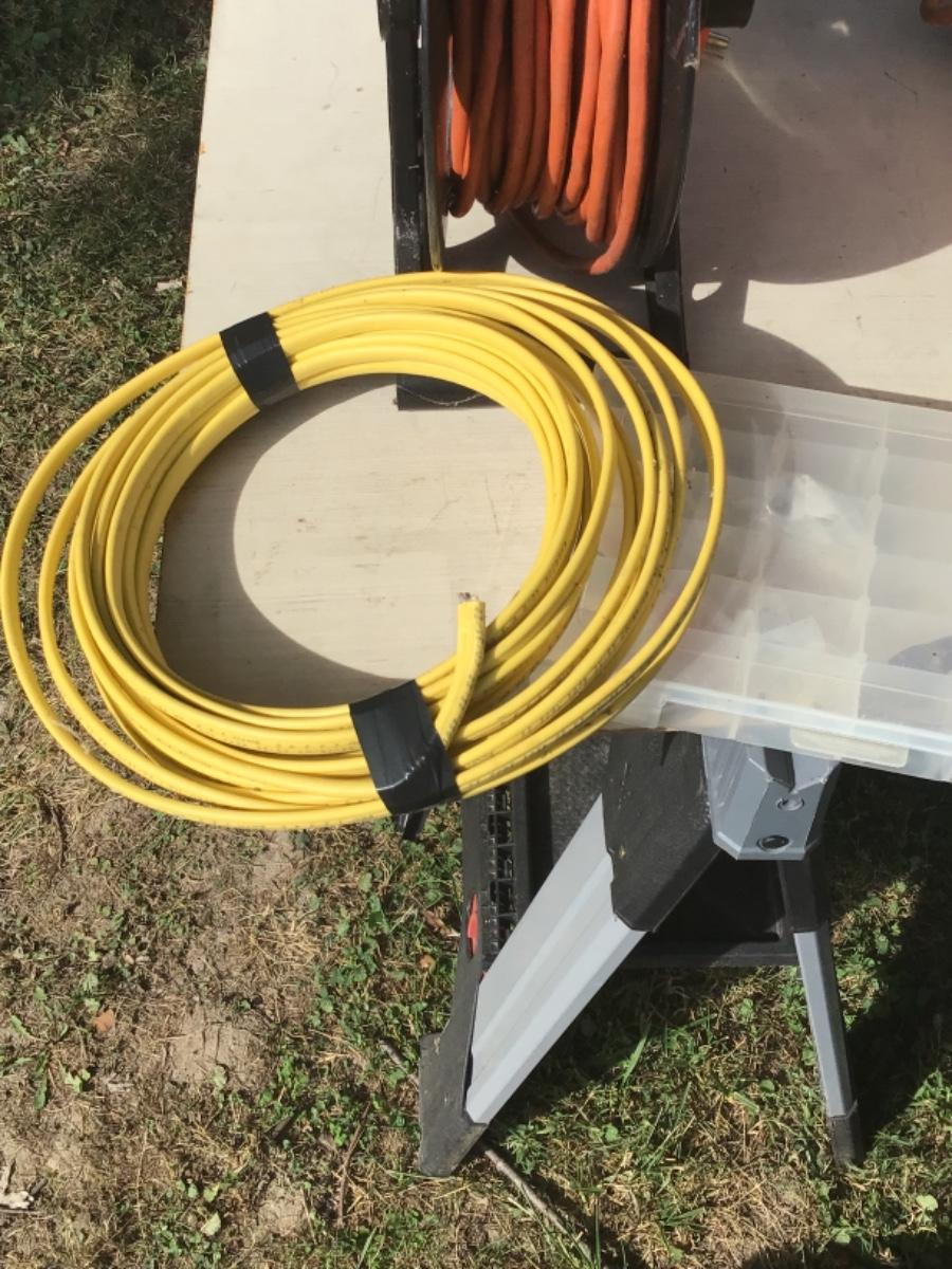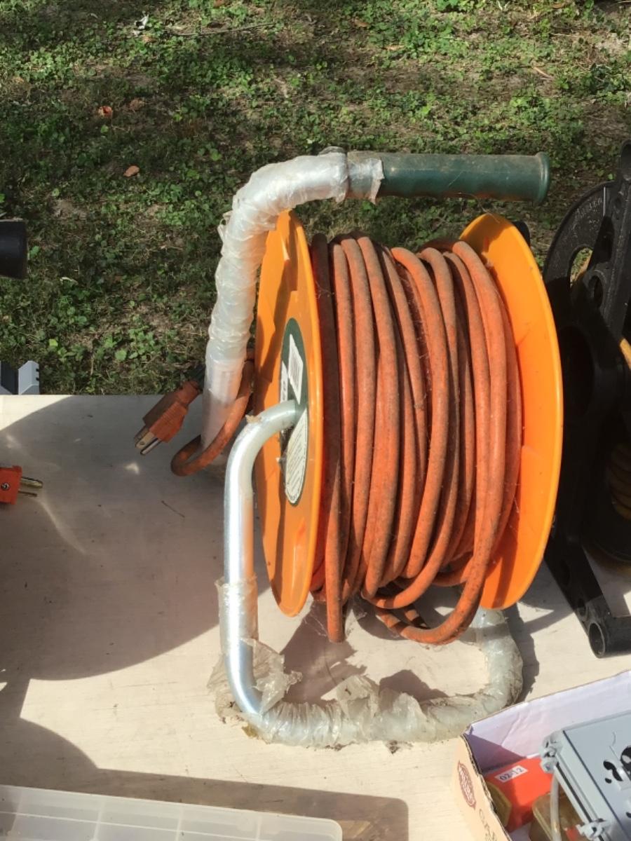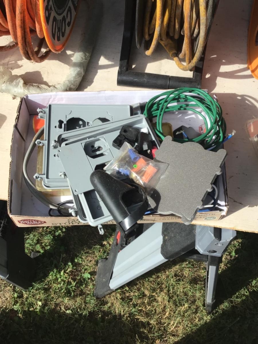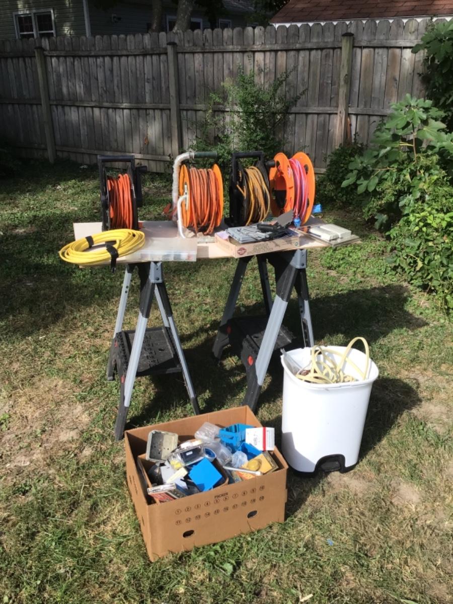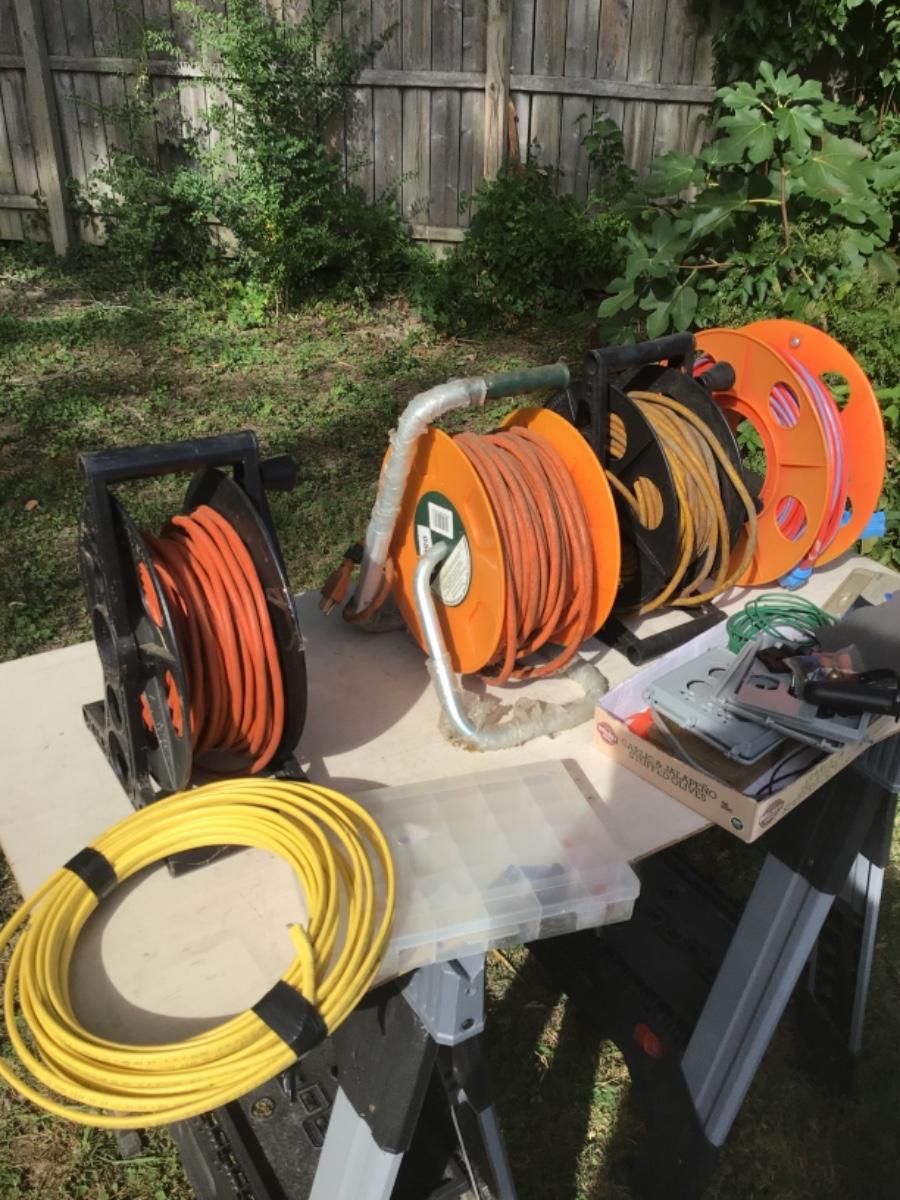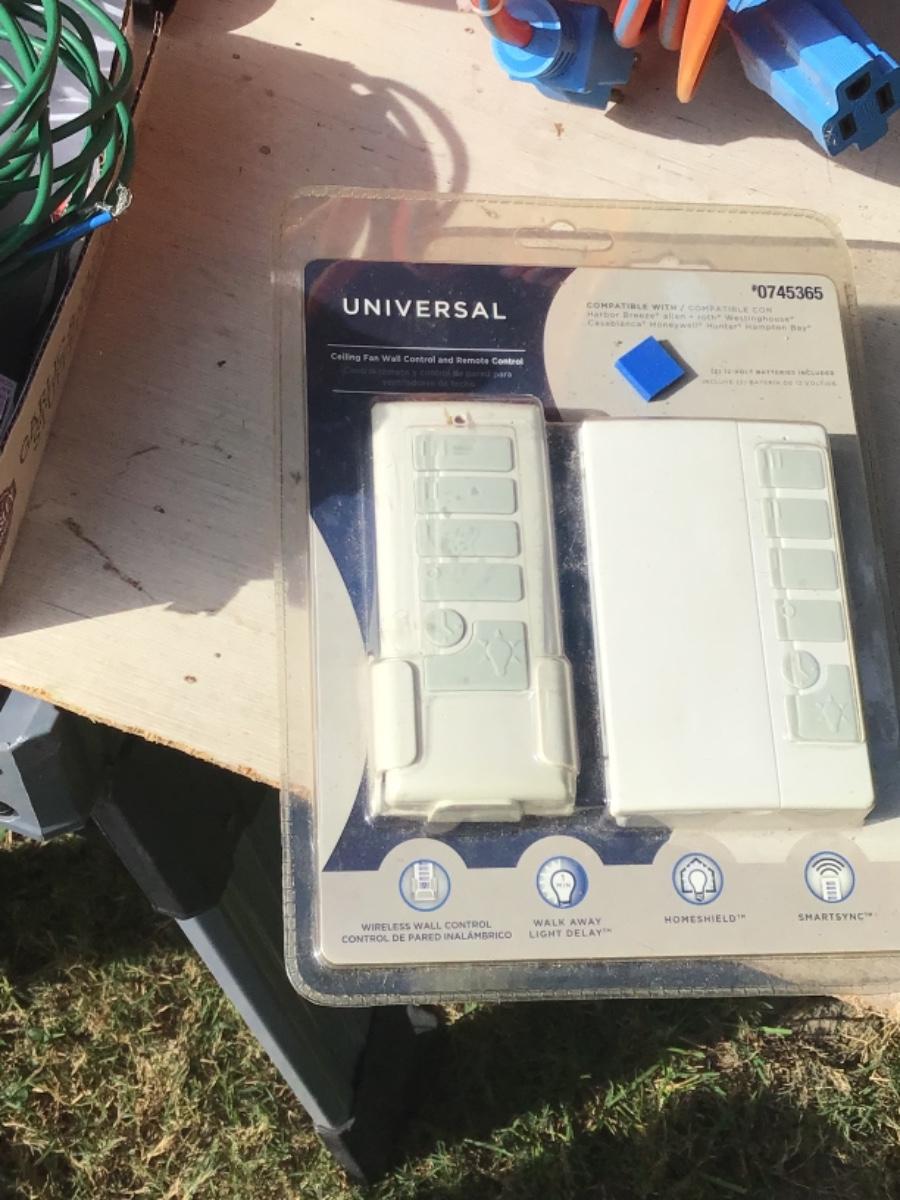 Large electrical light comes with, four extension cord wheels, universal ceiling fan remote kit, large white bin of extension cords, yellow ground electrical wire, large cardboard box of new and old junction boxes. Also other small electrical components and pieces.