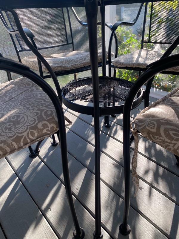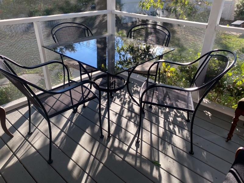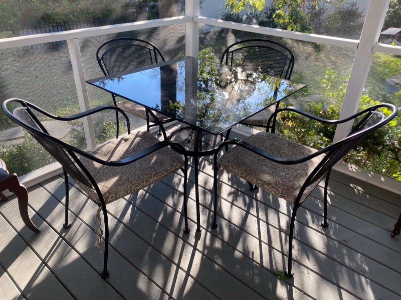 Metal Outdoor Glass-top Table. (29’ H x 32”D x 35” W), qty (4) chairs.