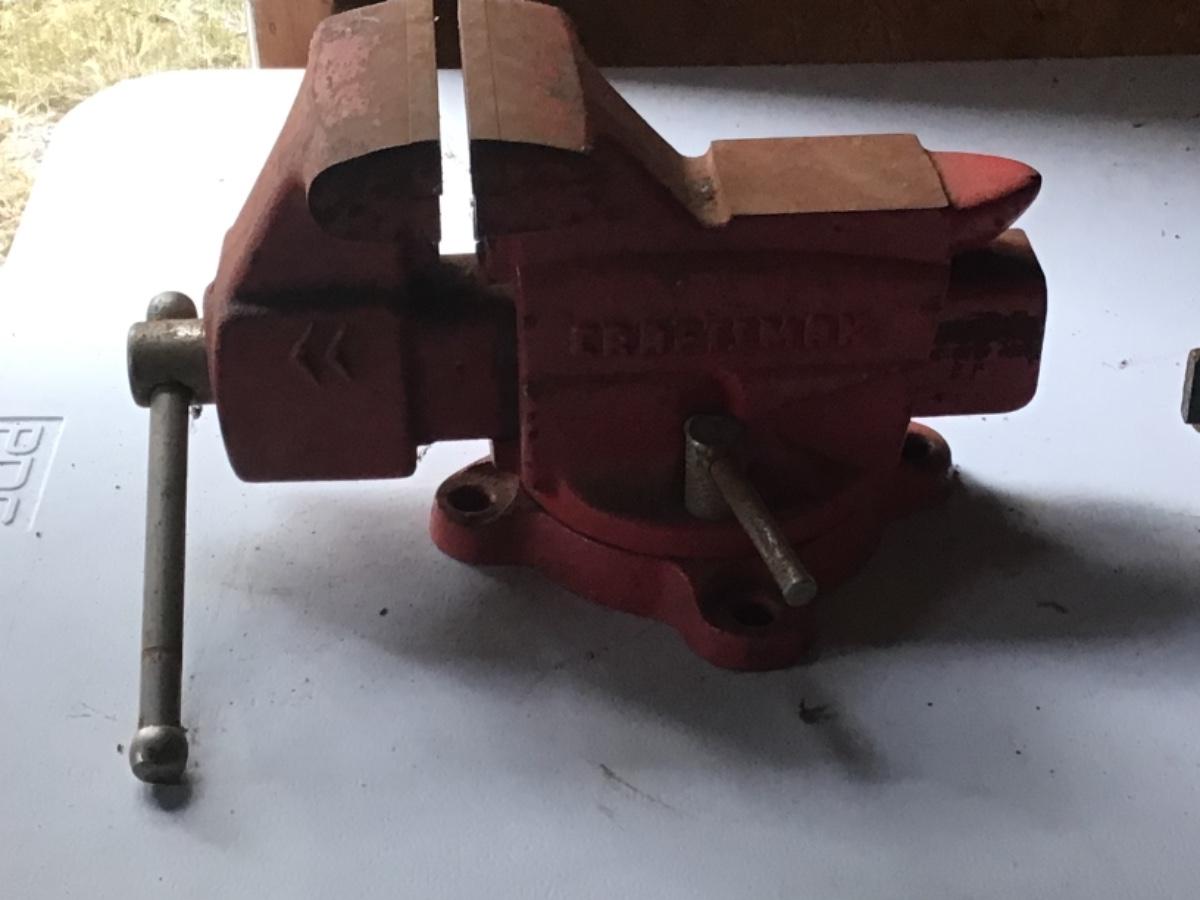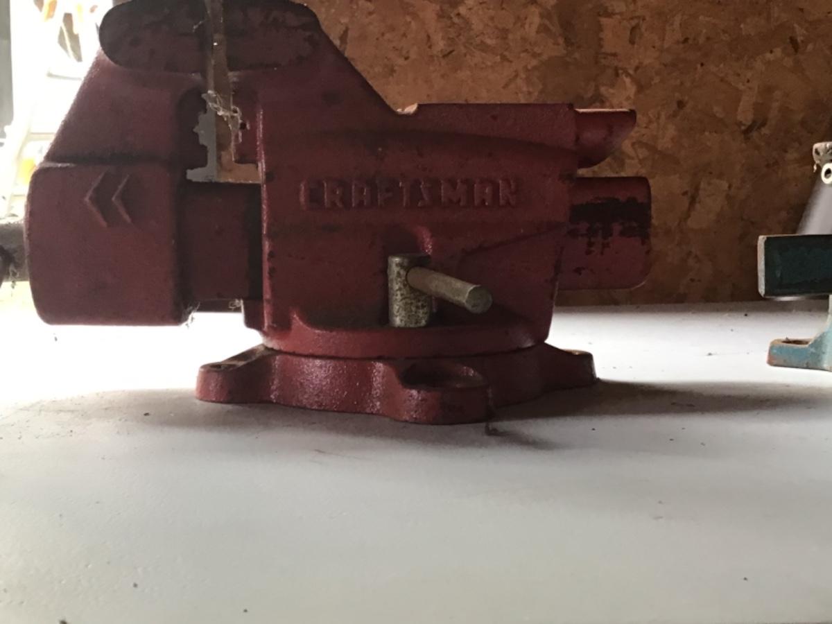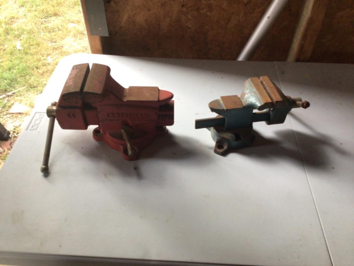 Two iron heavy duty work clamps. One red craftsman workbench plant, one smaller iron blue work bench clamp no brand. Both have rust, in worn shape, blue handle has rust damage.