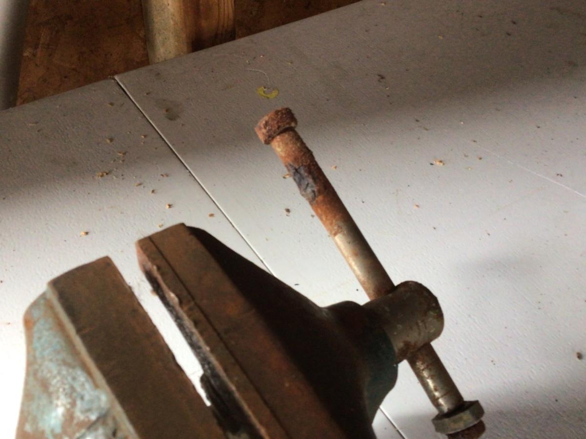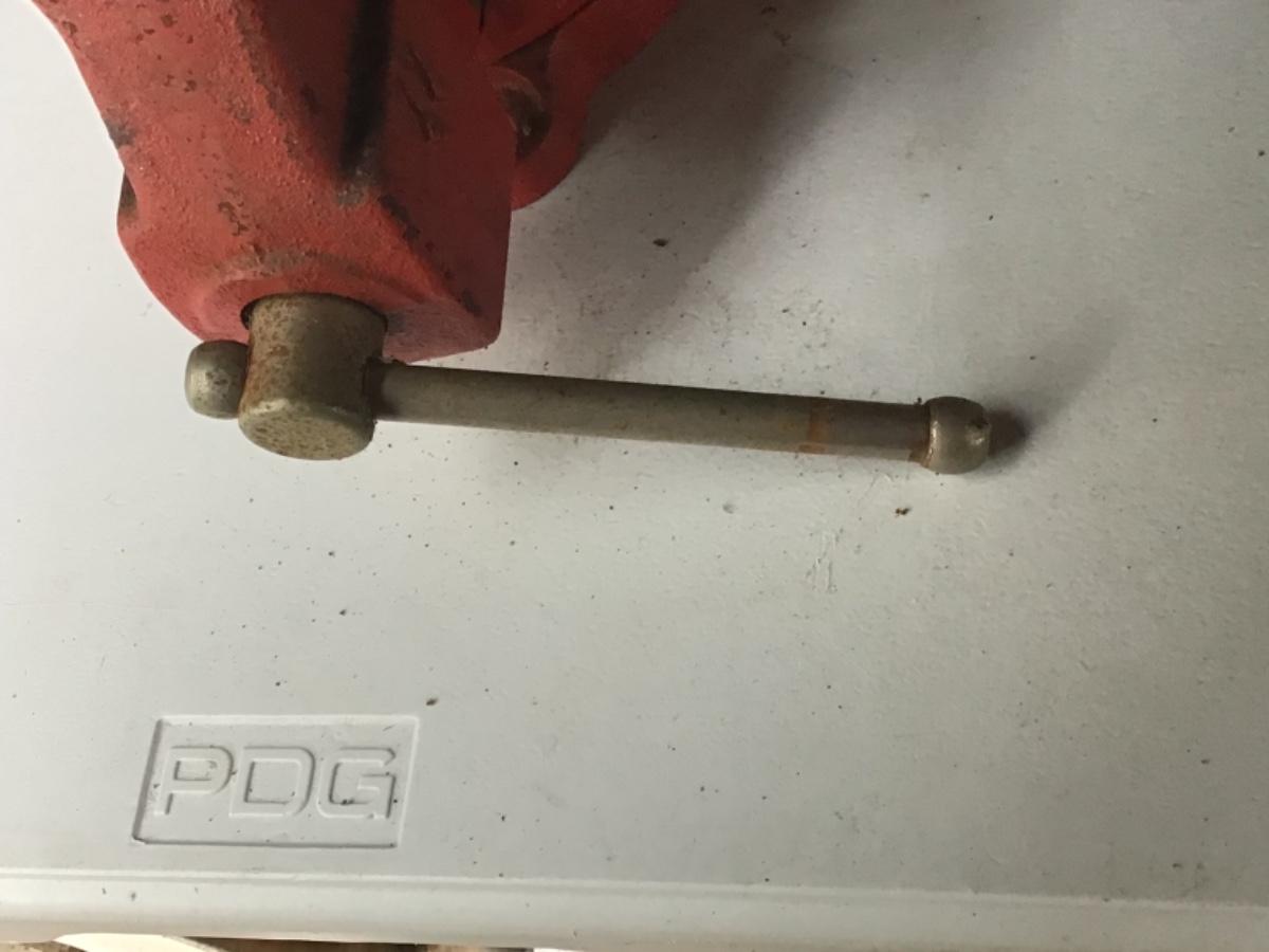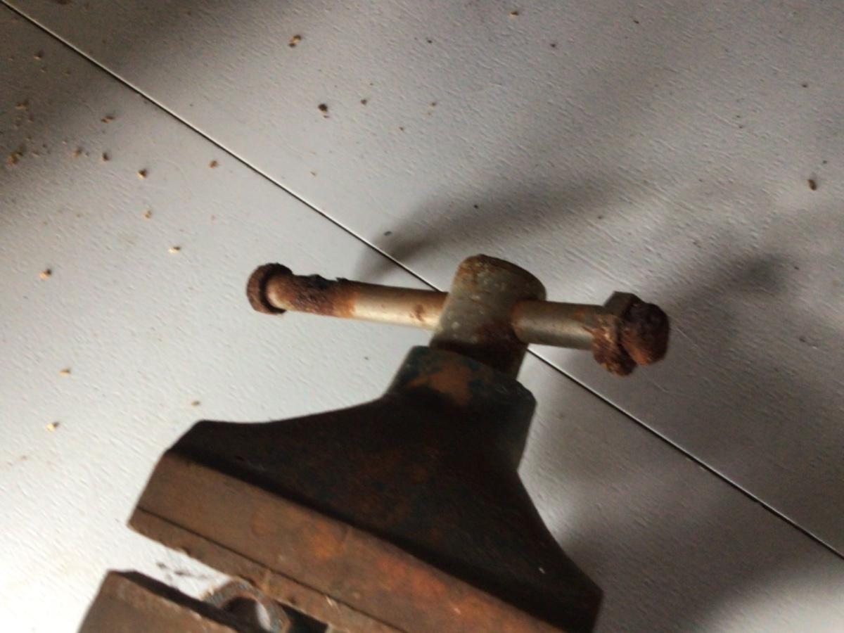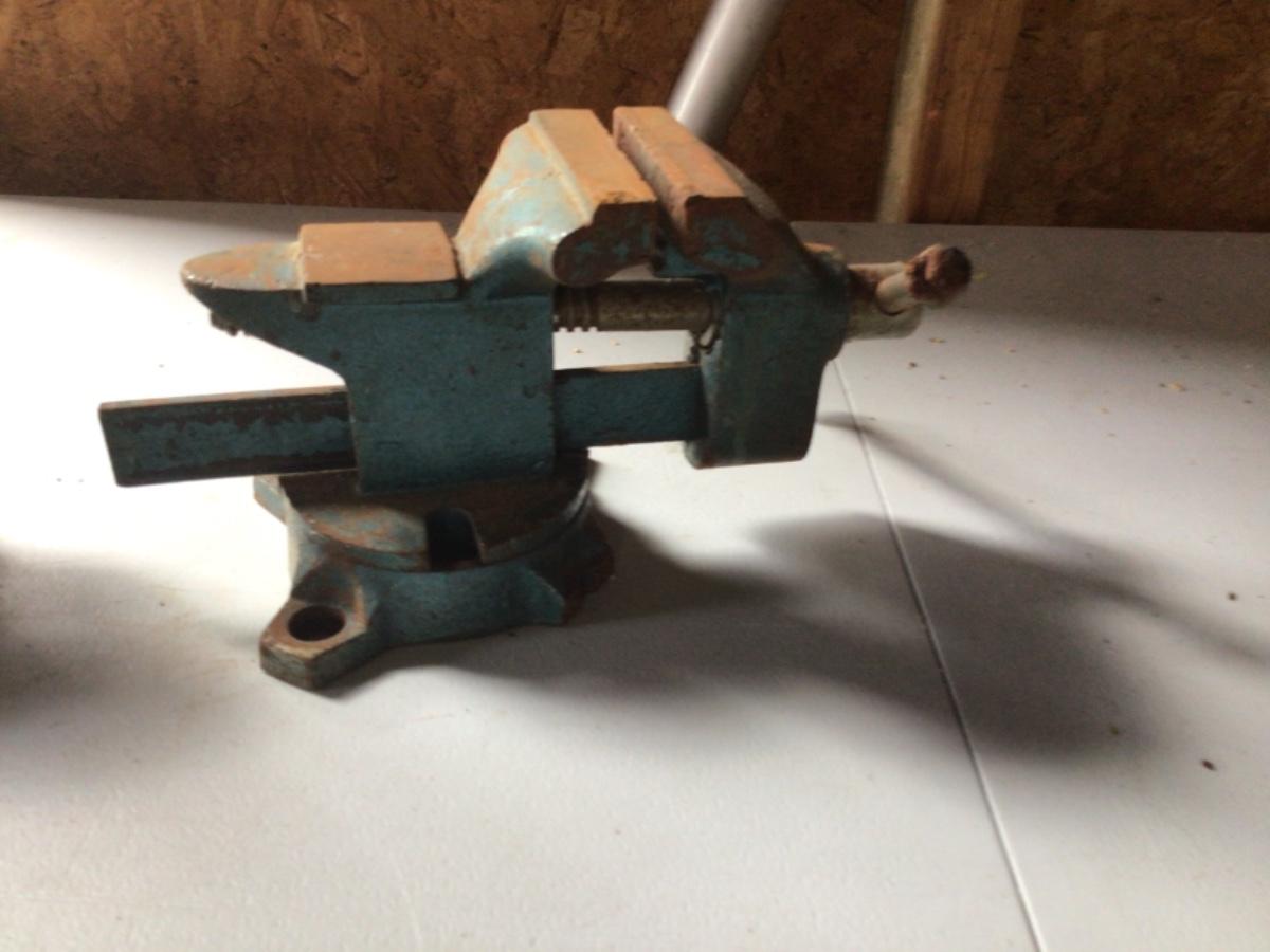 Two iron heavy duty work clamps. One red craftsman workbench plant, one smaller iron blue work bench clamp no brand. Both have rust, in worn shape, blue handle has rust damage.