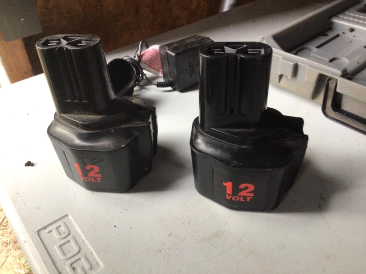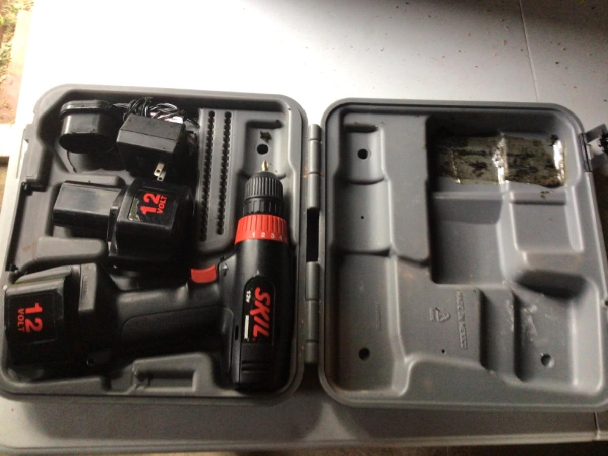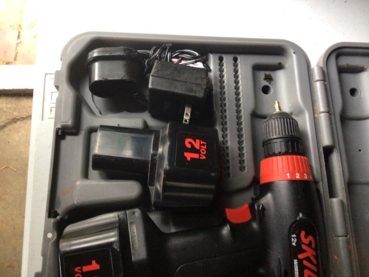The skilled 12 V cordless drill does not work, needs new batteries to operate. Comes with two chargeable batteries and one charger.