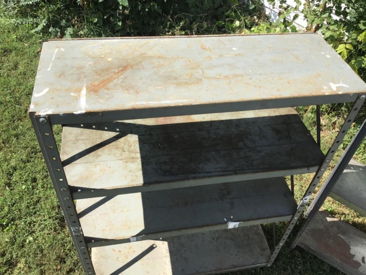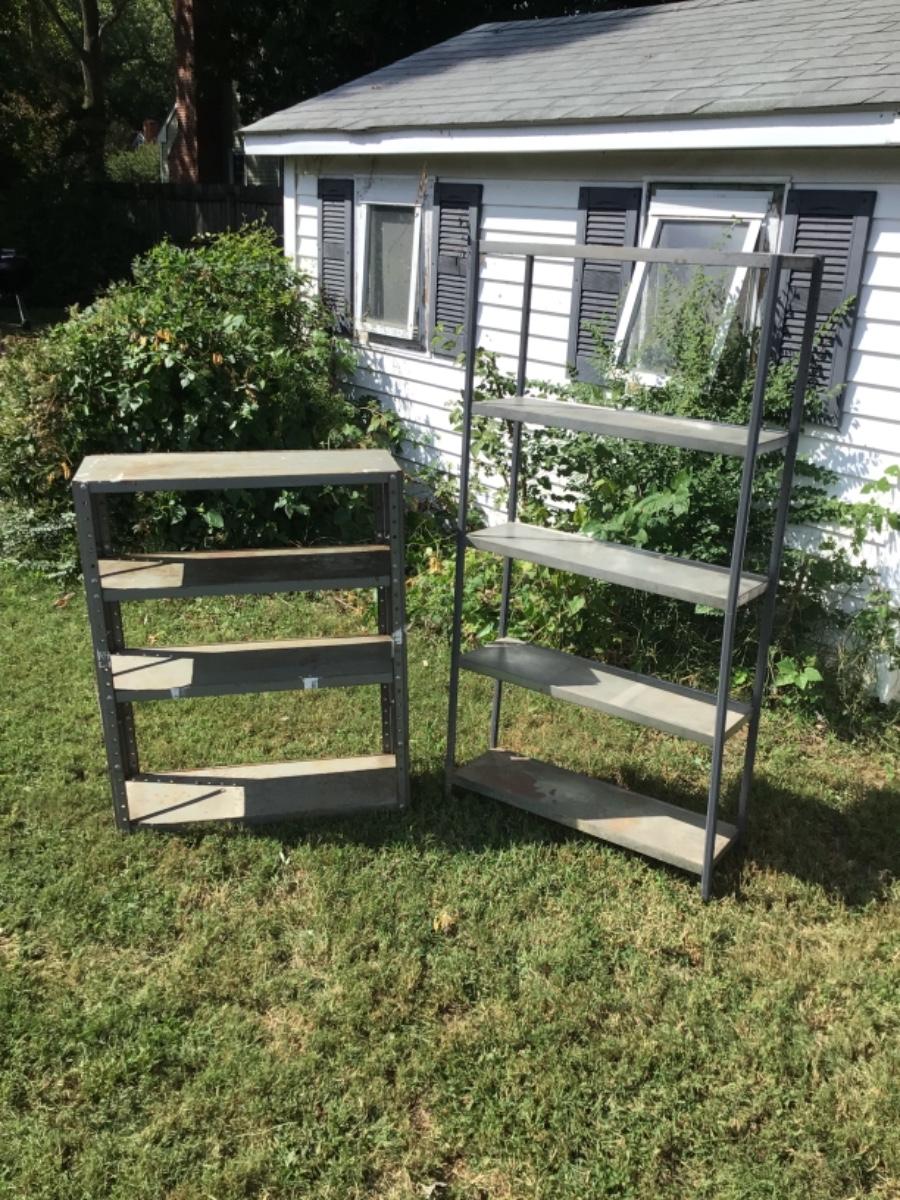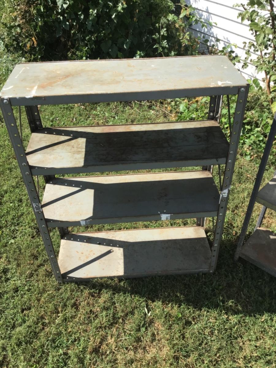 Two old metal shelving units light weight, both have some degree of rust or minimal wear. Otherwise both shelves are in decent shape.