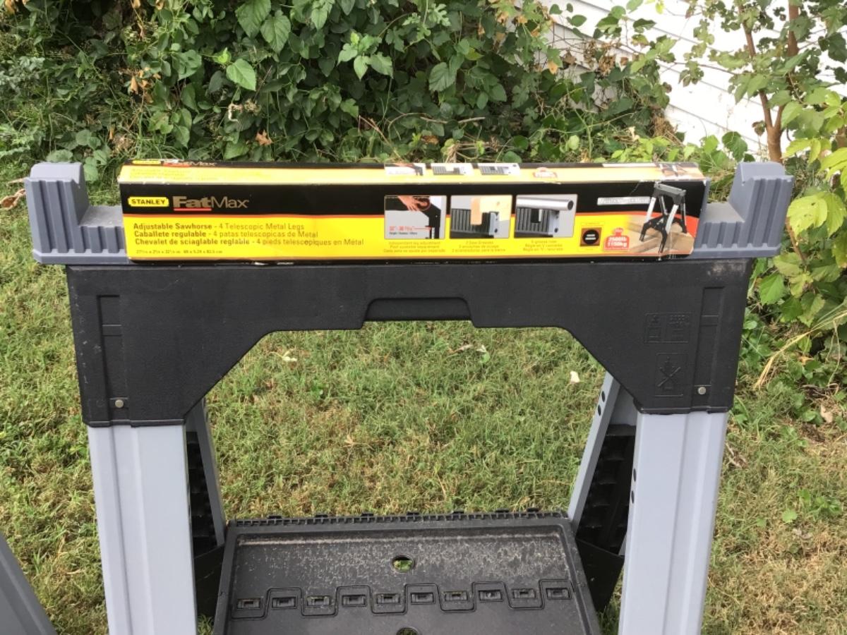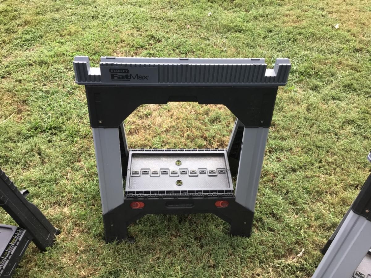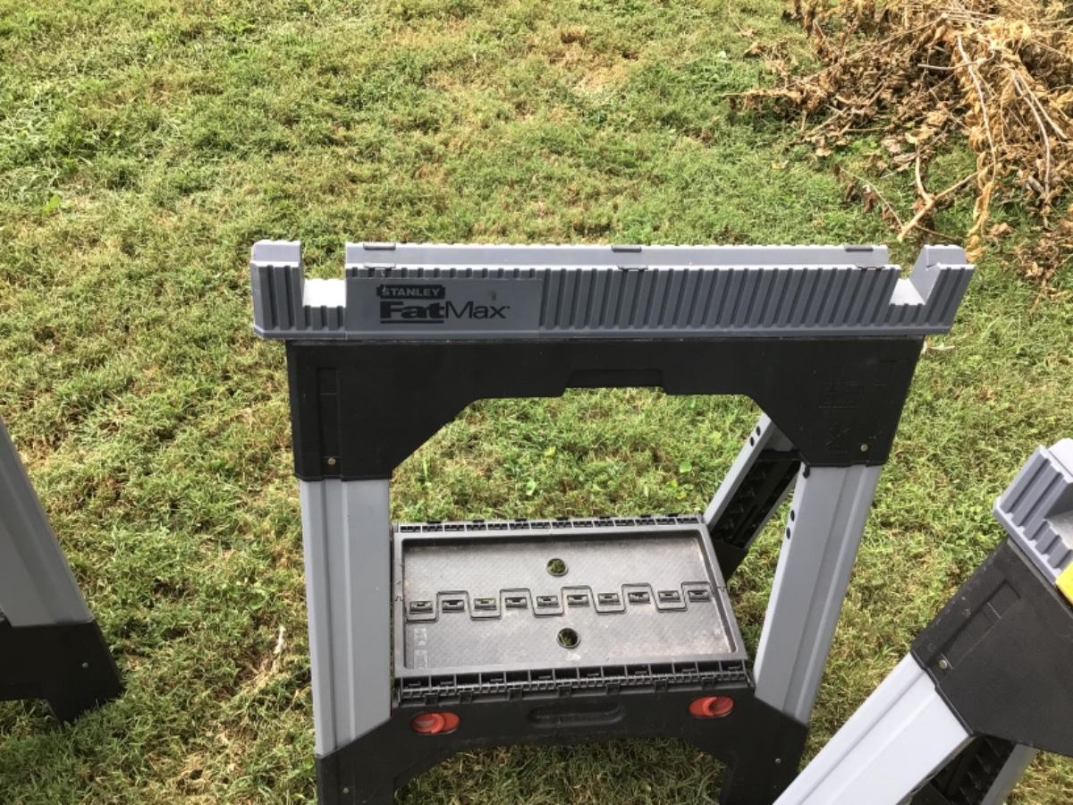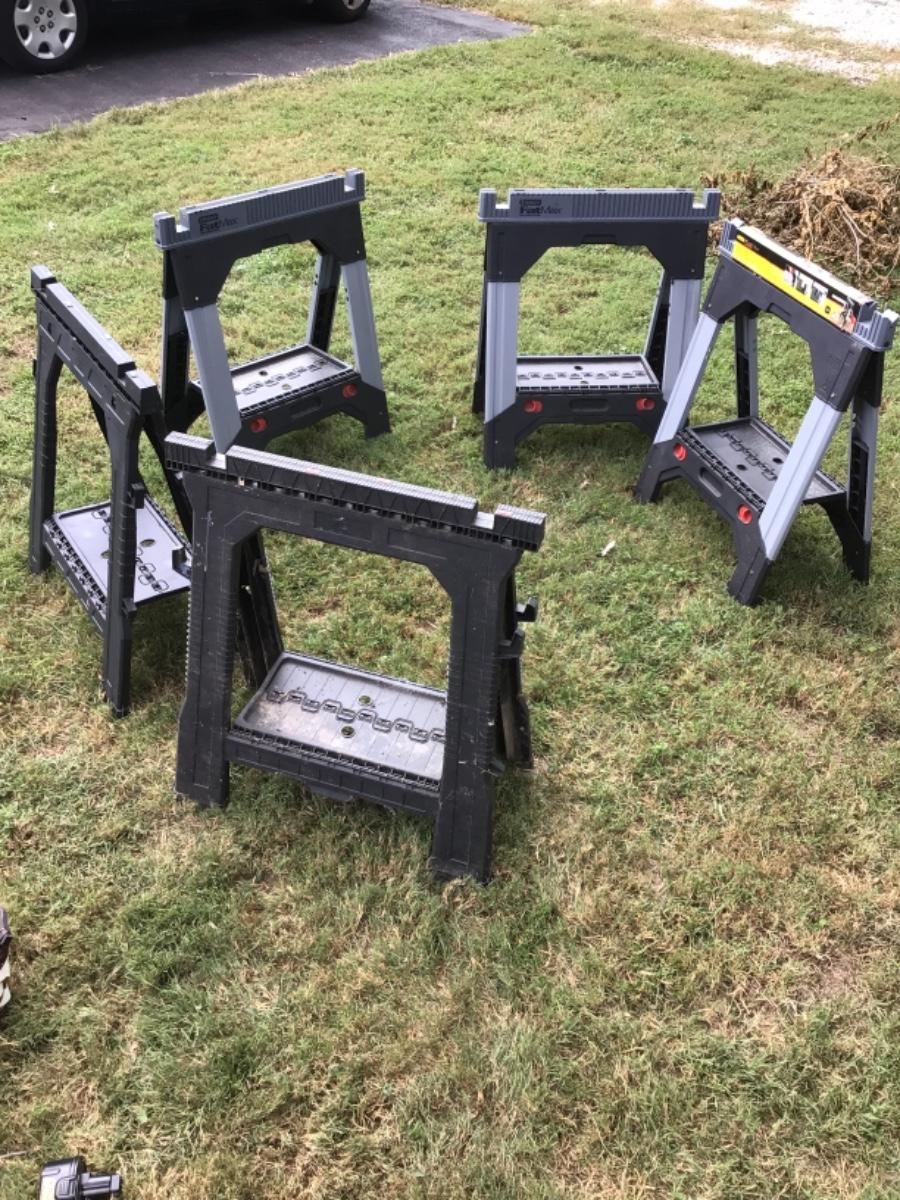 Comes with three Stanley fat max sawhorses, one blue hawk sawhorse, and one task force sawhorse.