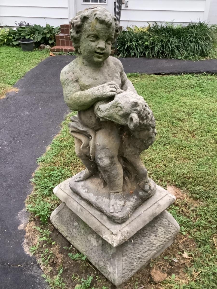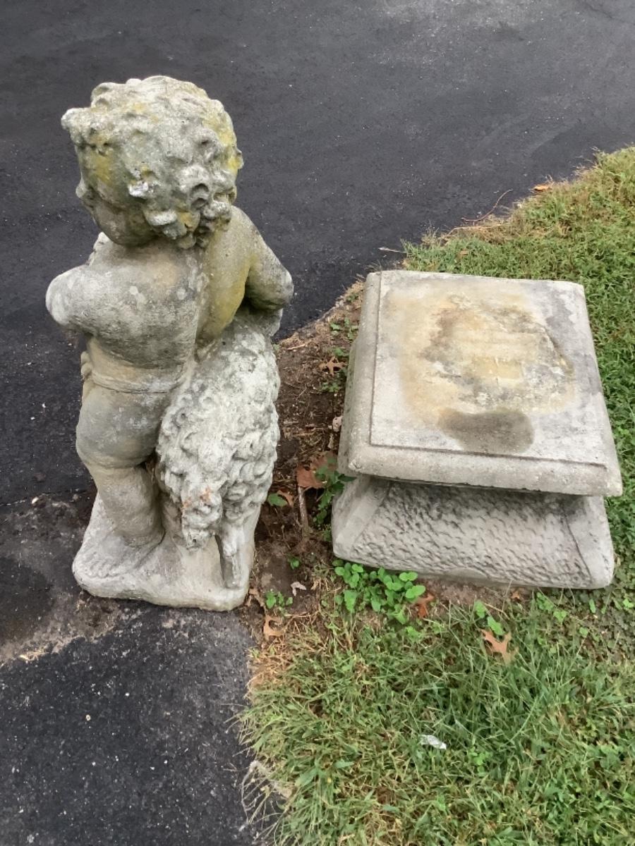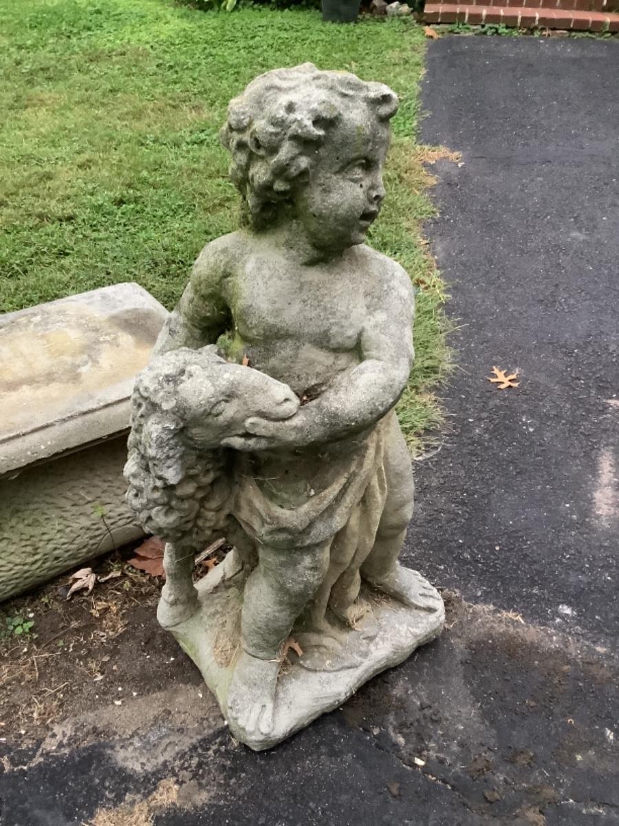 O933 Pair of Cement Putti Garden Statues of Boy with Lamb on Pedestal