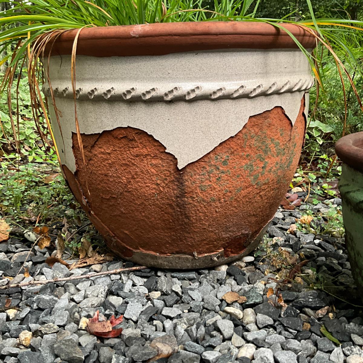 Large pot is missing glaze, measures: 18.5" diameter x 14.5" high