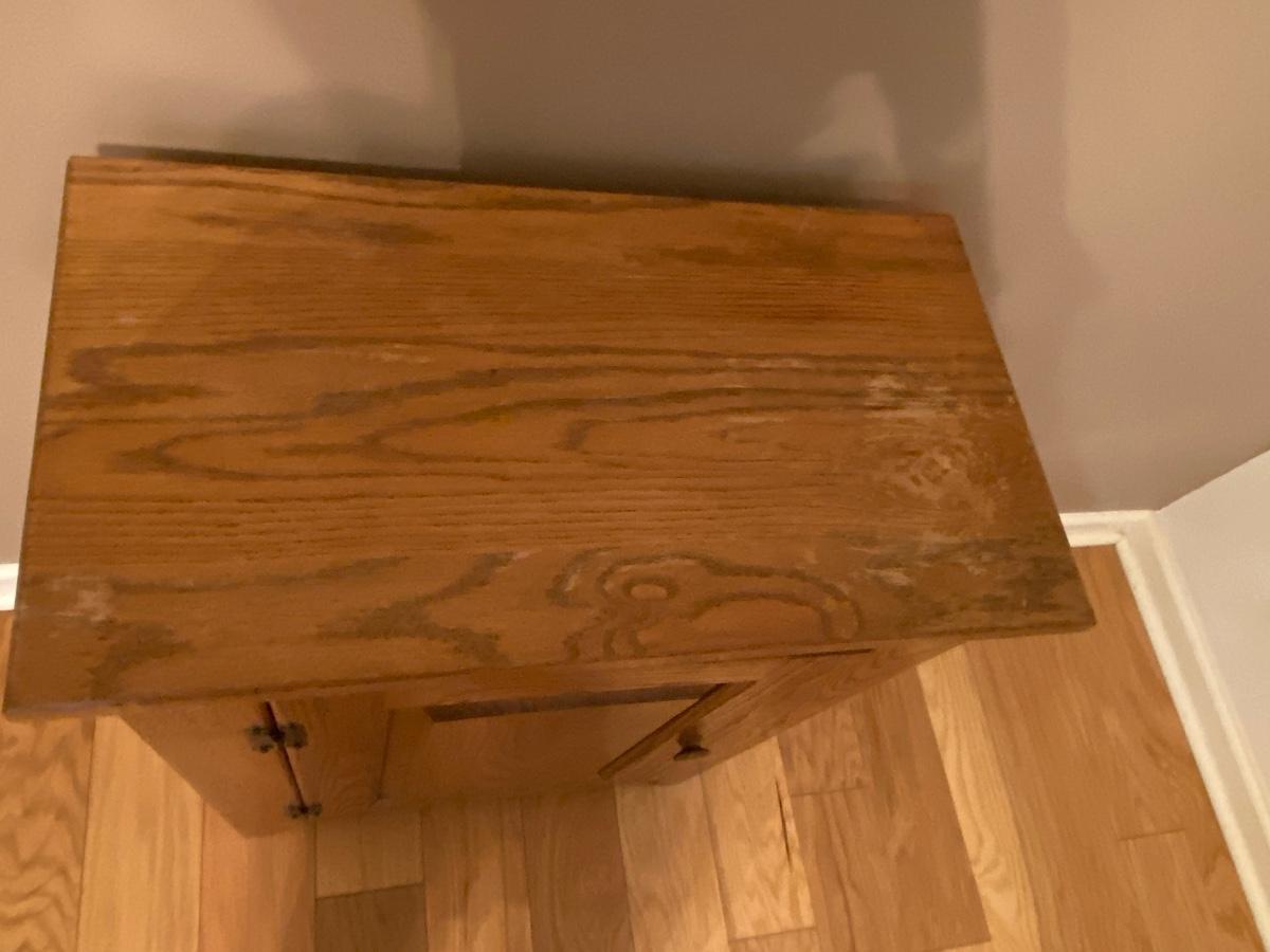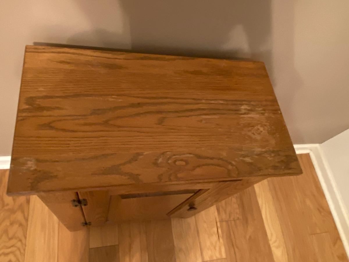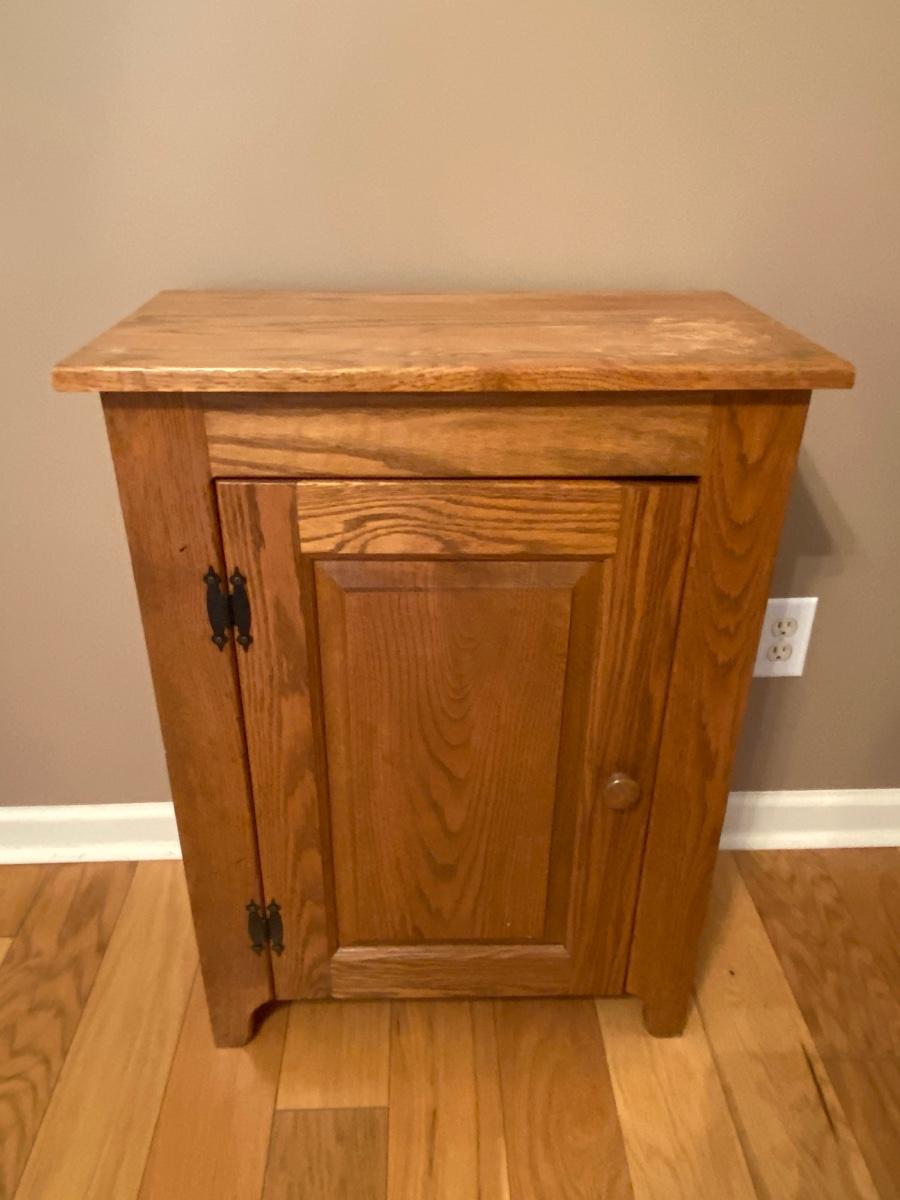 Oak 1 Door Cabinet w/ Contents As Pictured Some Wear on Top, 32x24x13