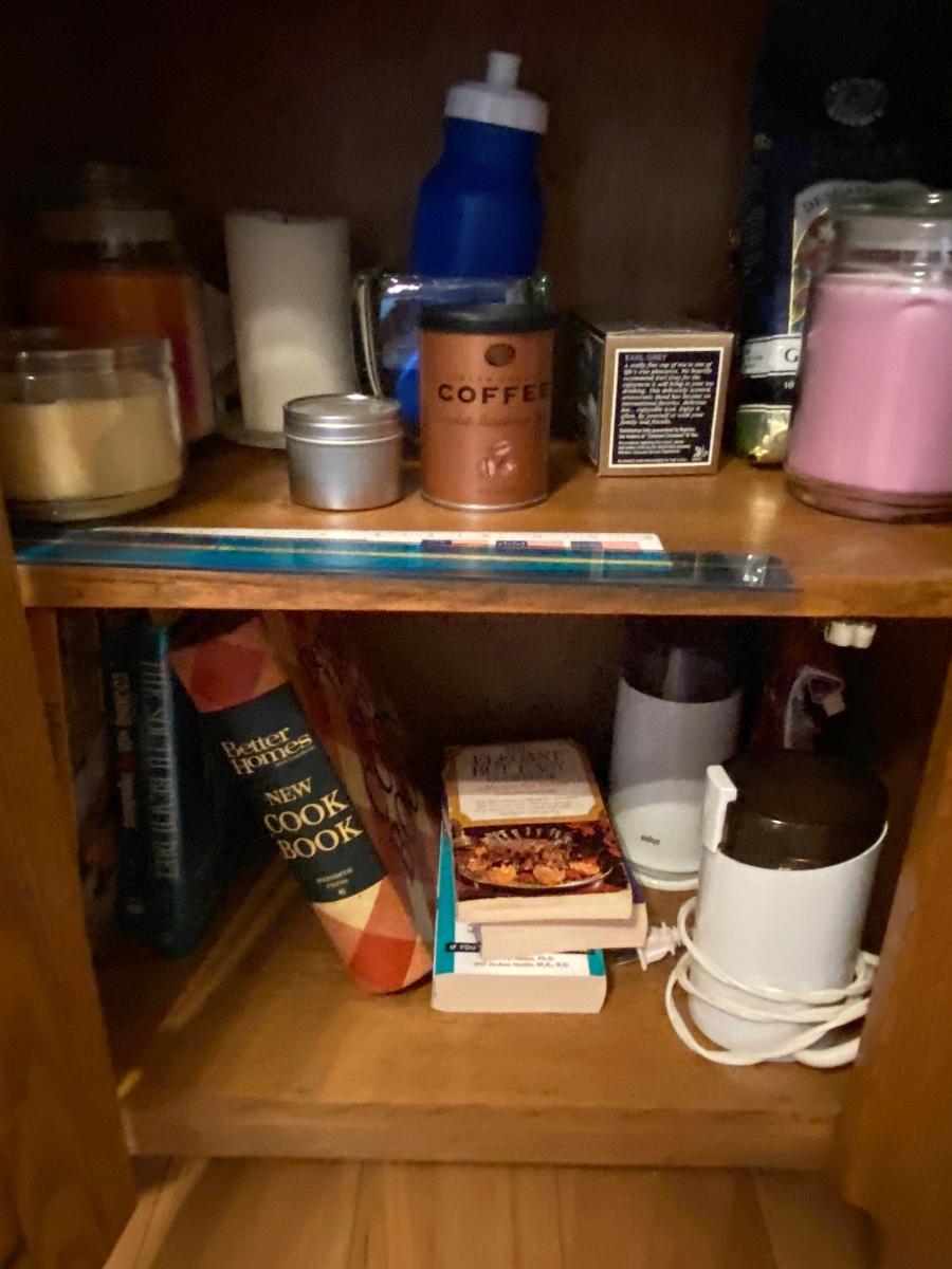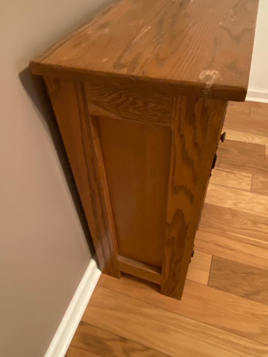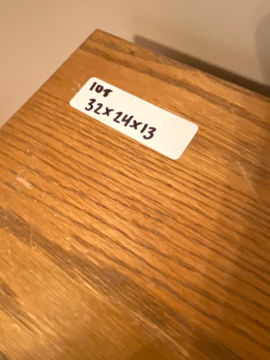 Oak 1 Door Cabinet w/ Contents As Pictured Some Wear on Top, 32x24x13