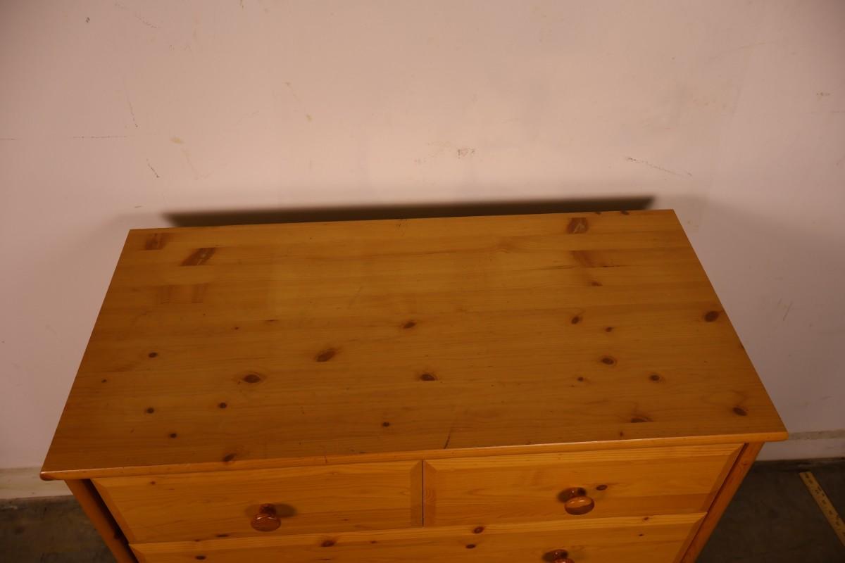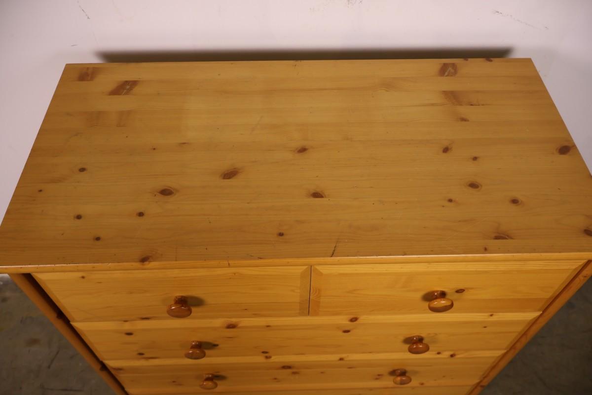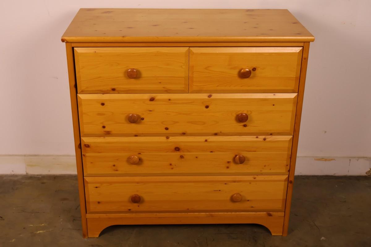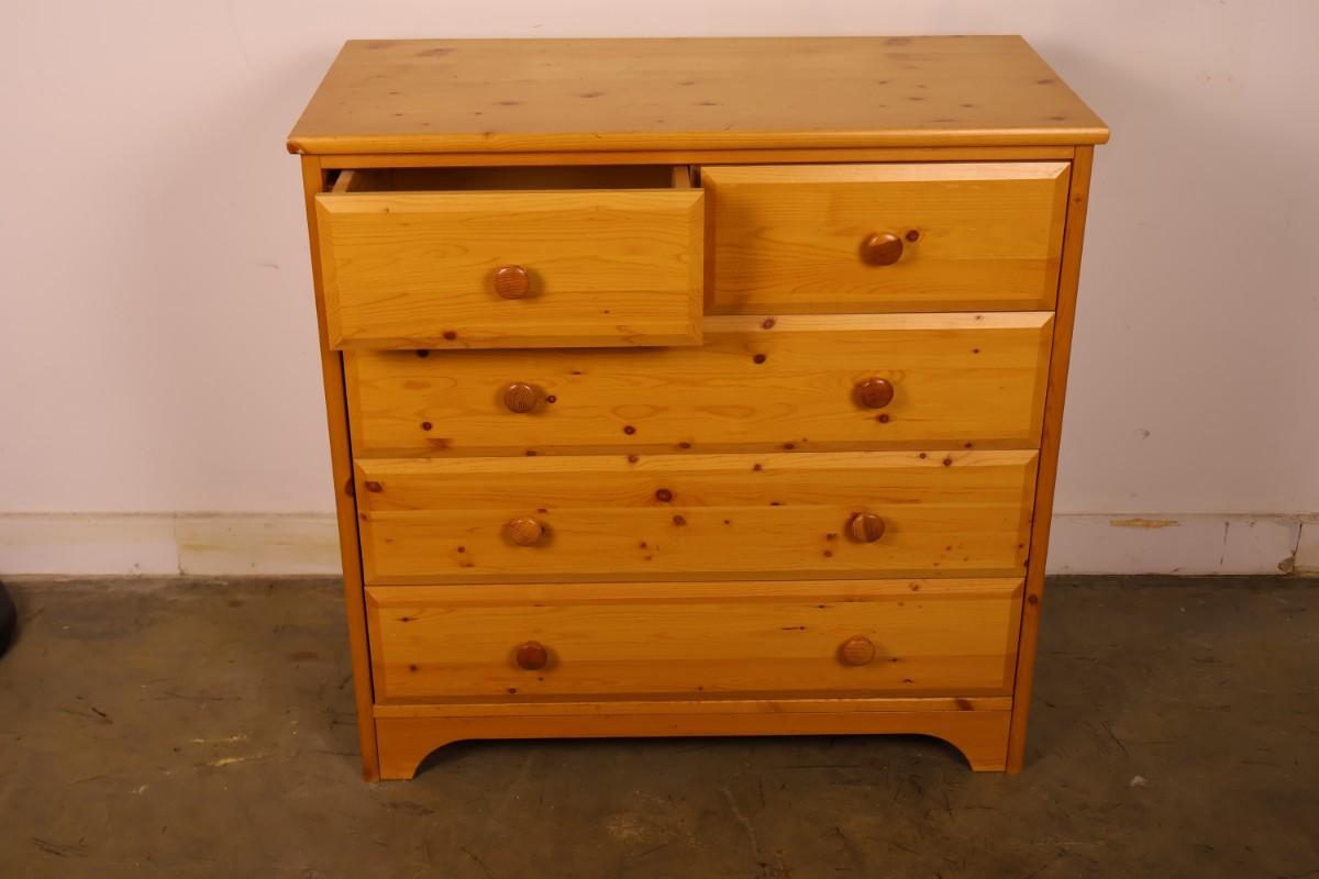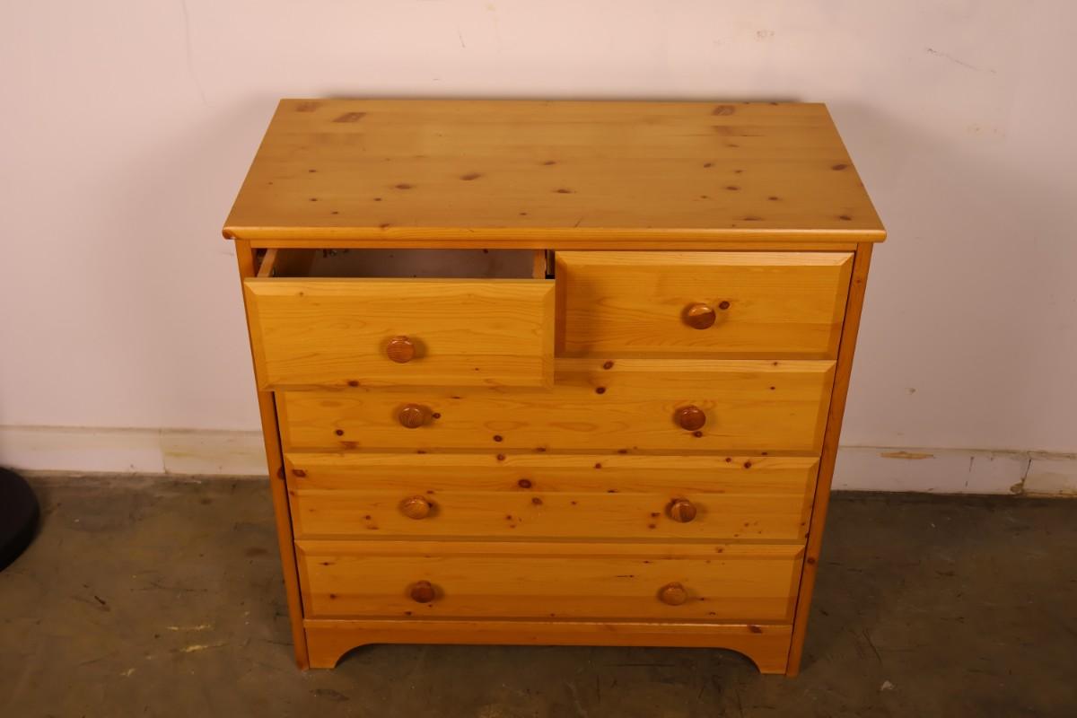 Oak 5 Drawer Chest. Has some scratches. Drawers function properly. Dimensions: 31 1/2" x 15 1/2" x 31" high.