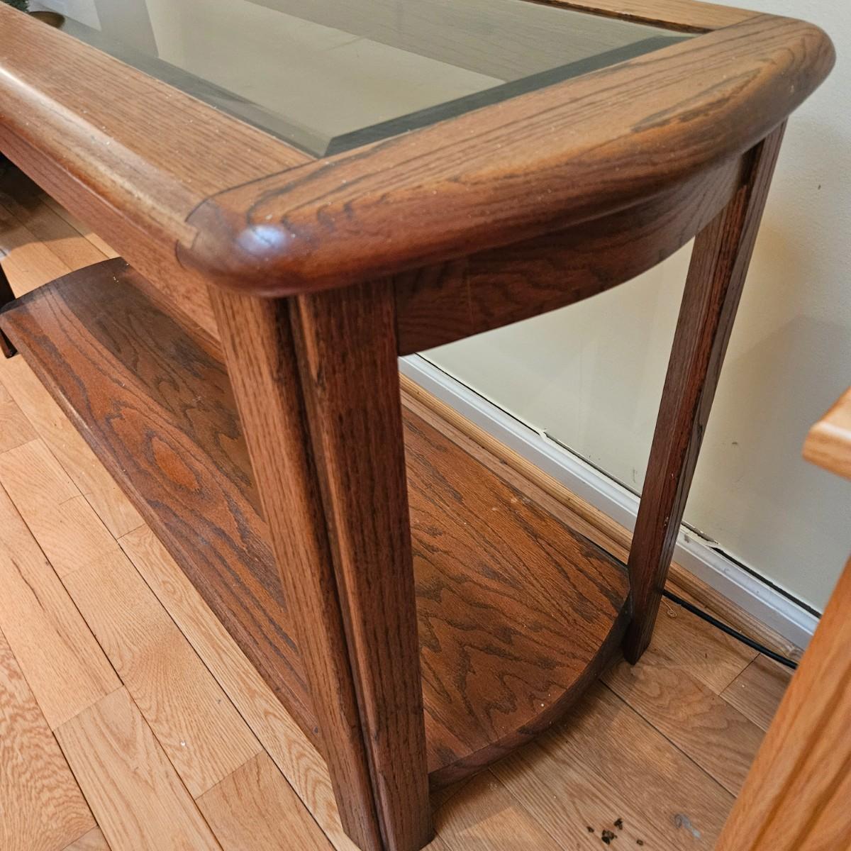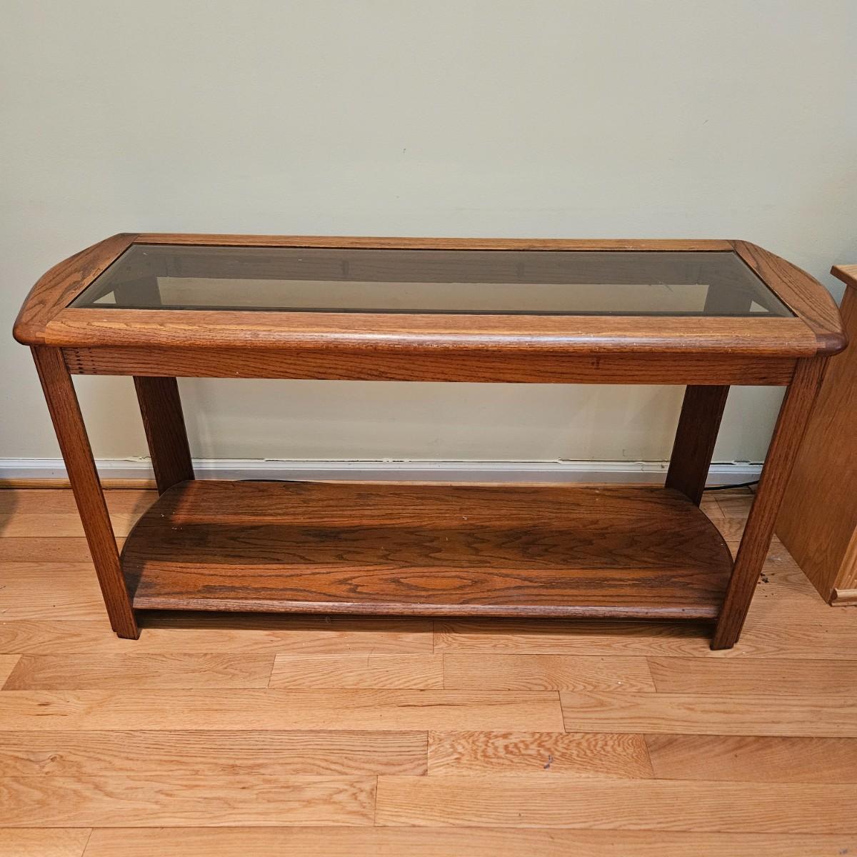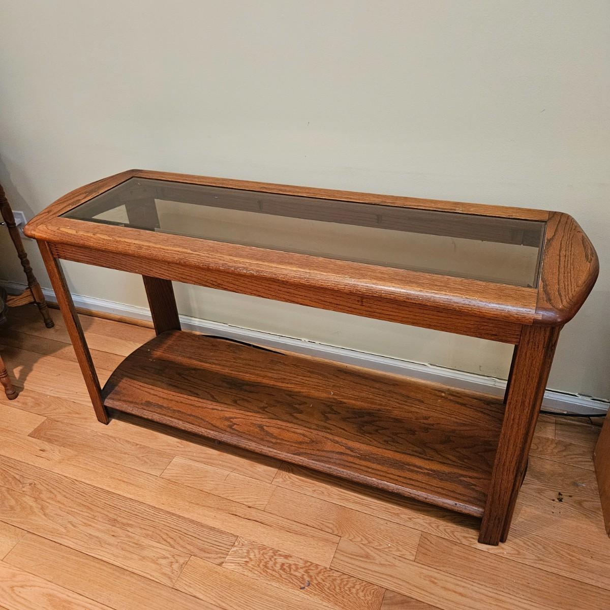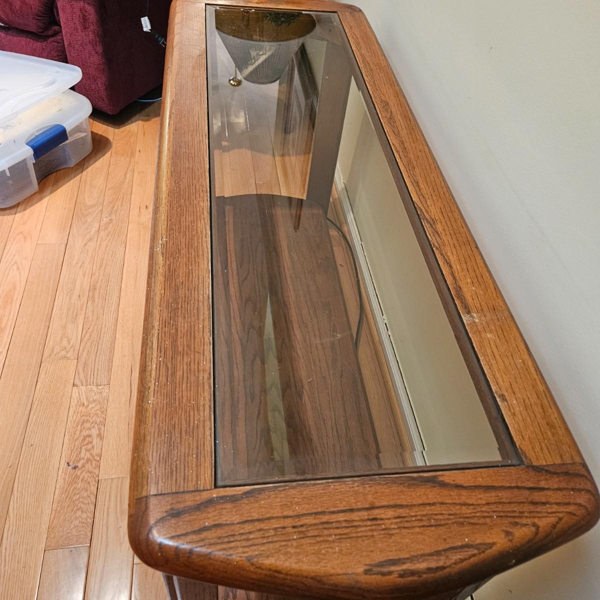 A console table made of oak with a beveled glass insert. It measures approximately 52" x 18.5" x 26"H. There are some paint flecks and minor blemishes. Local pickup only
