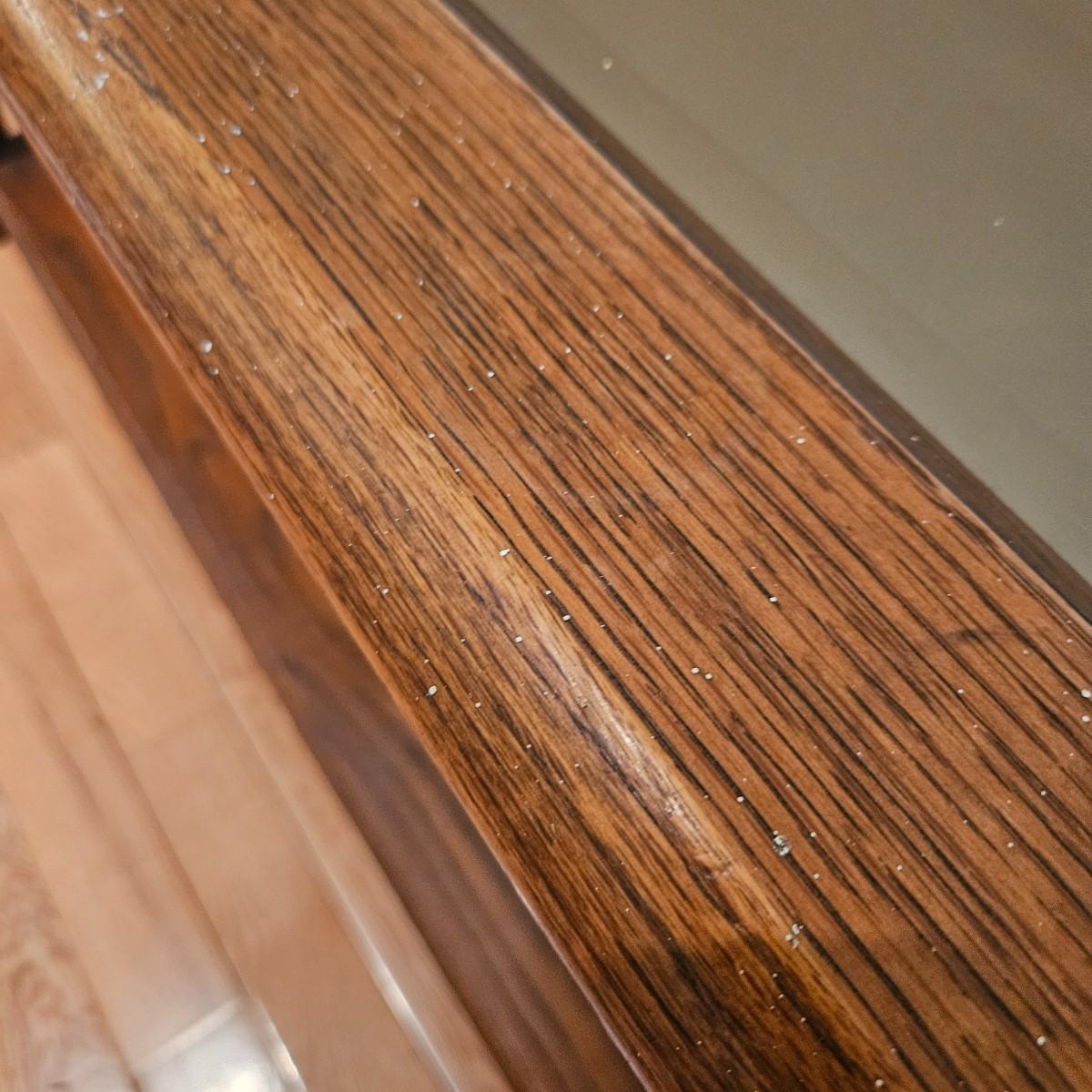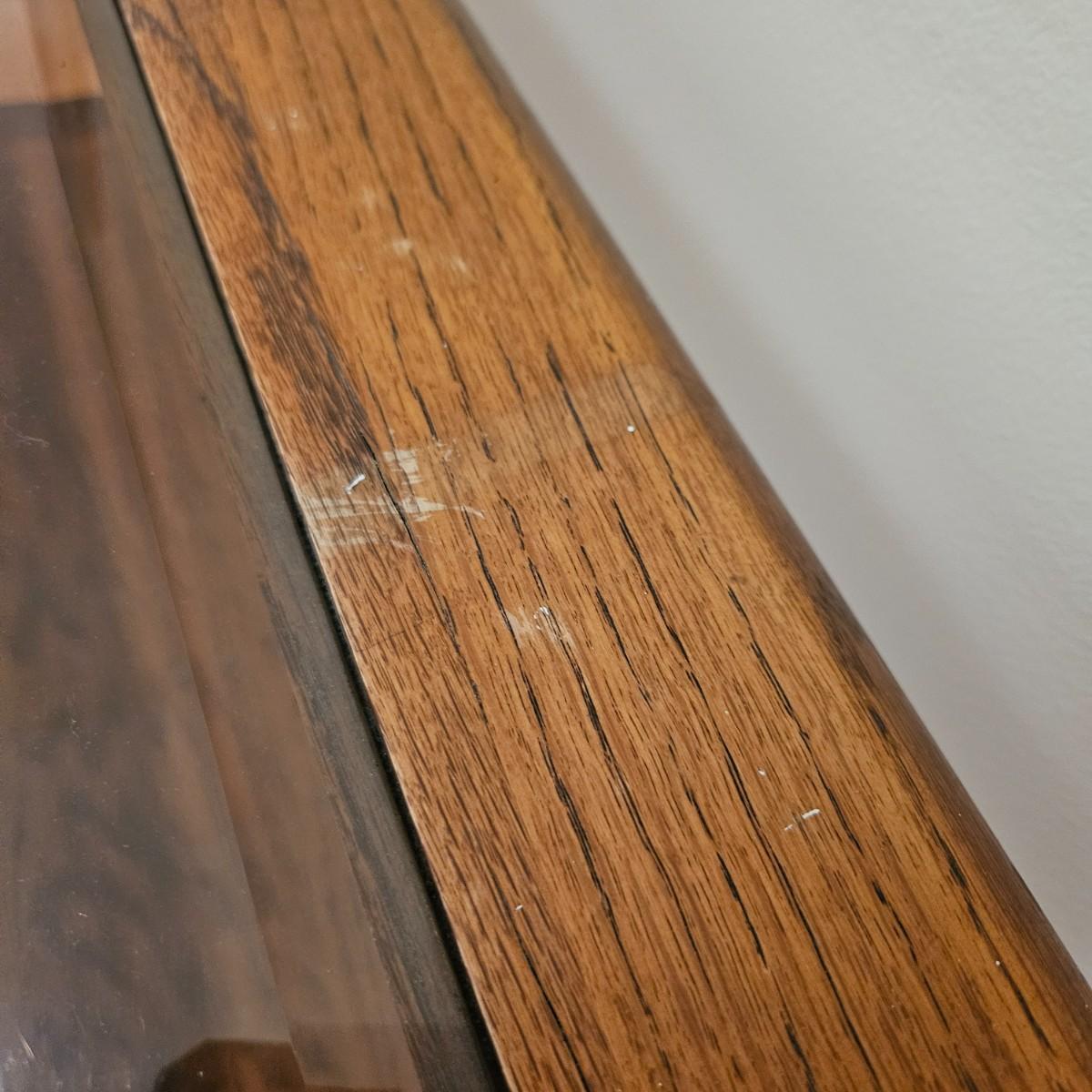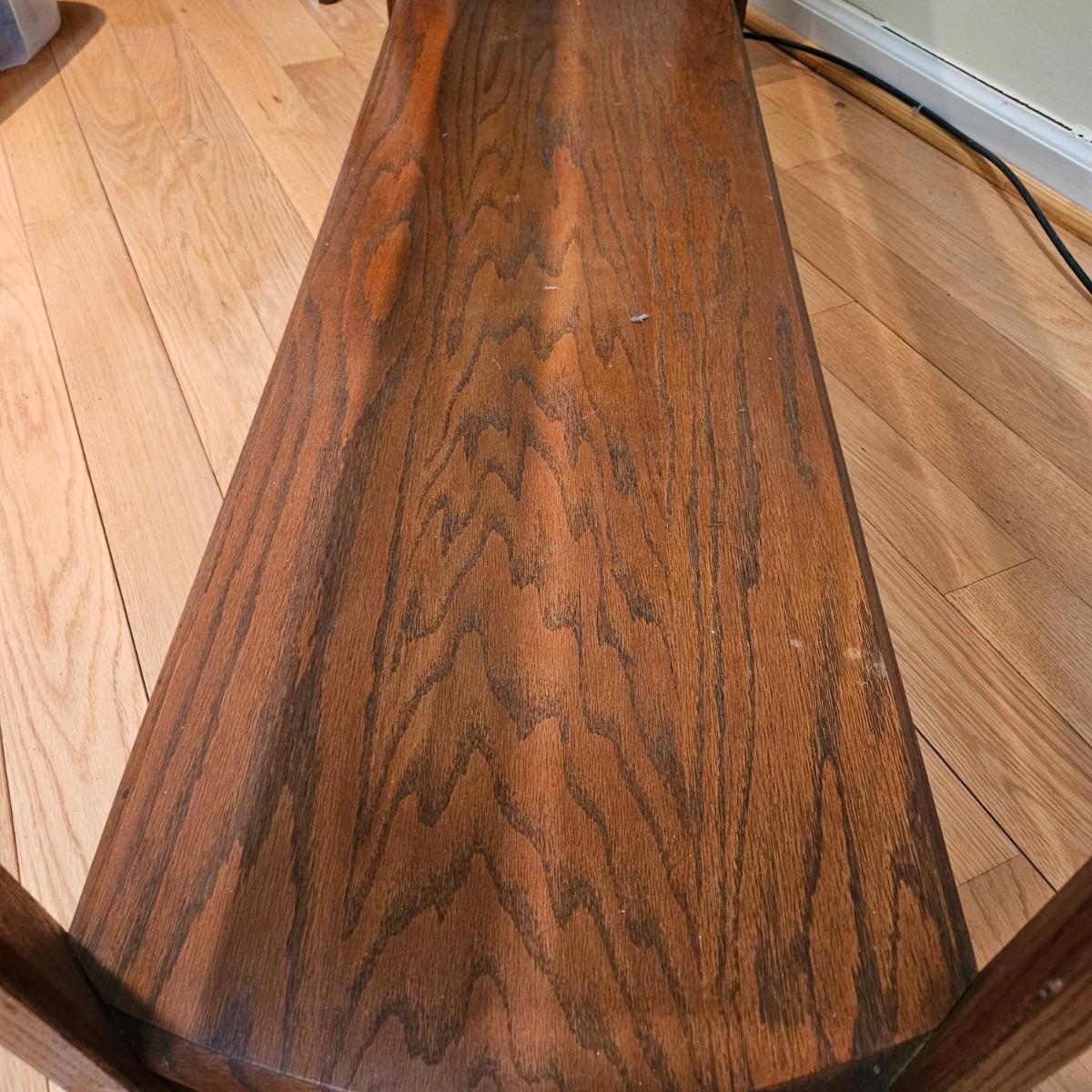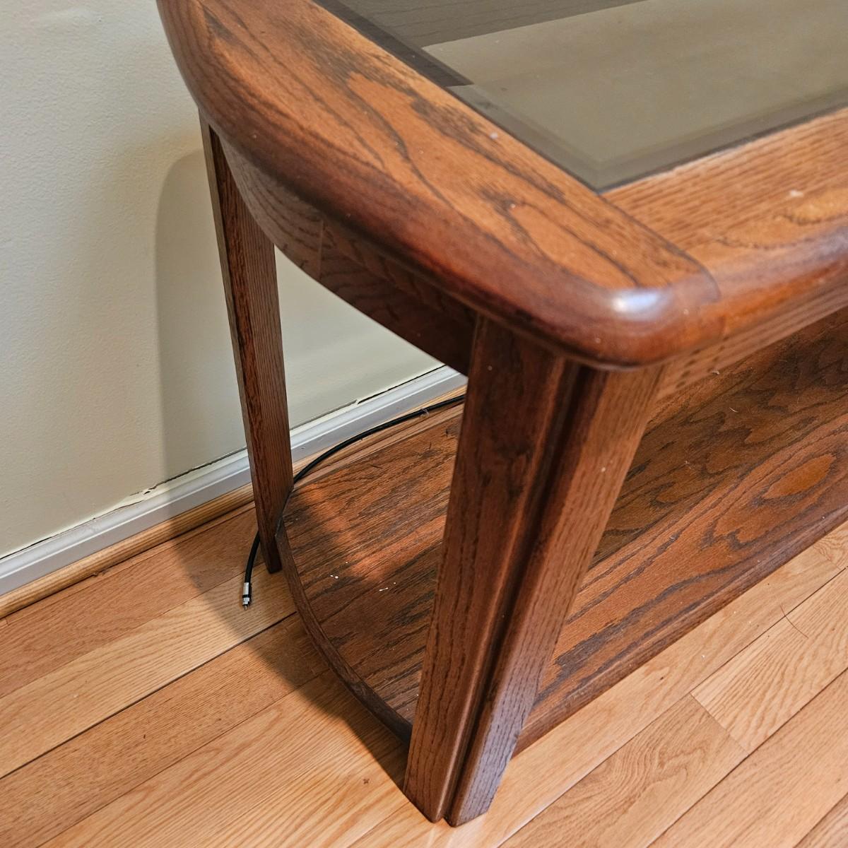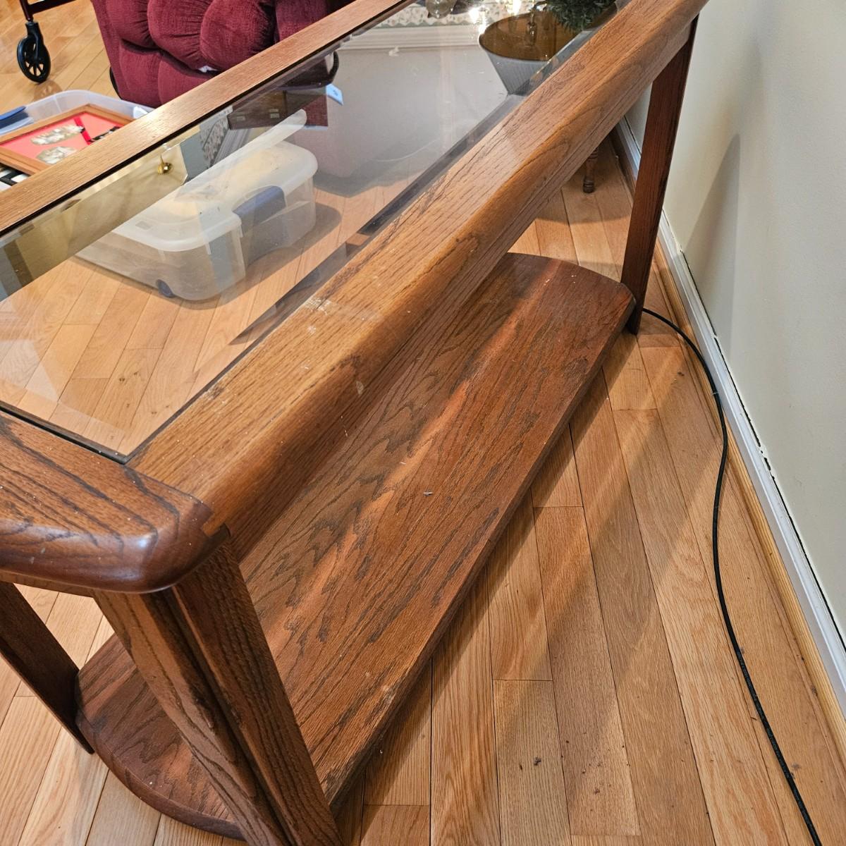 A console table made of oak with a beveled glass insert. It measures approximately 52" x 18.5" x 26"H. There are some paint flecks and minor blemishes. Local pickup only