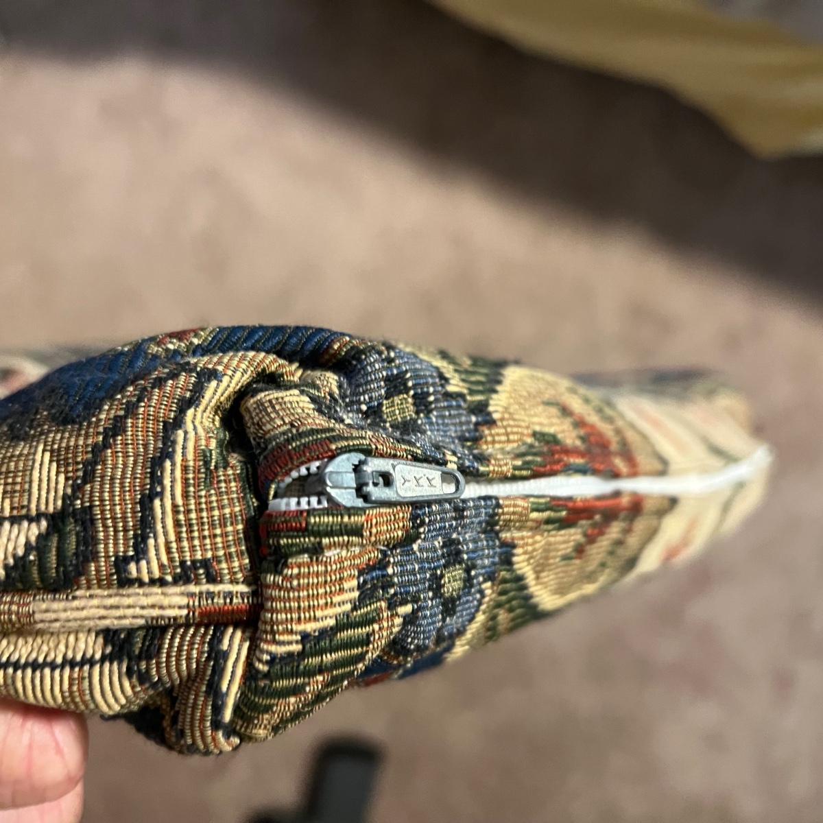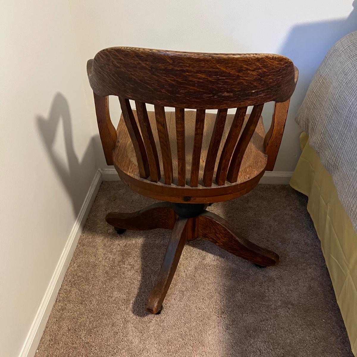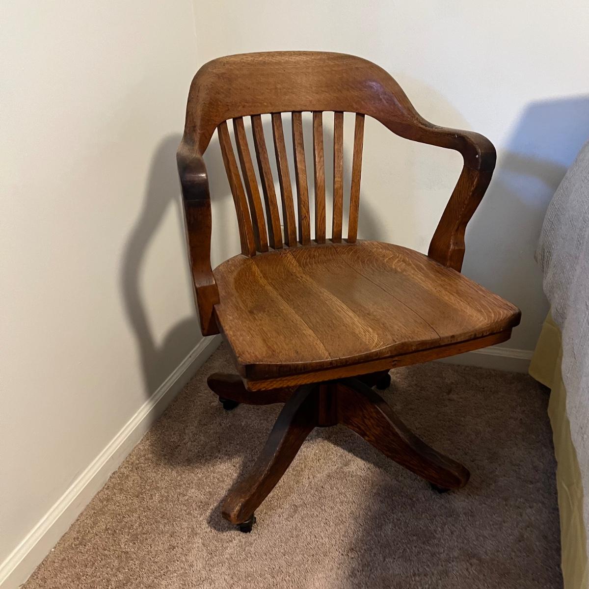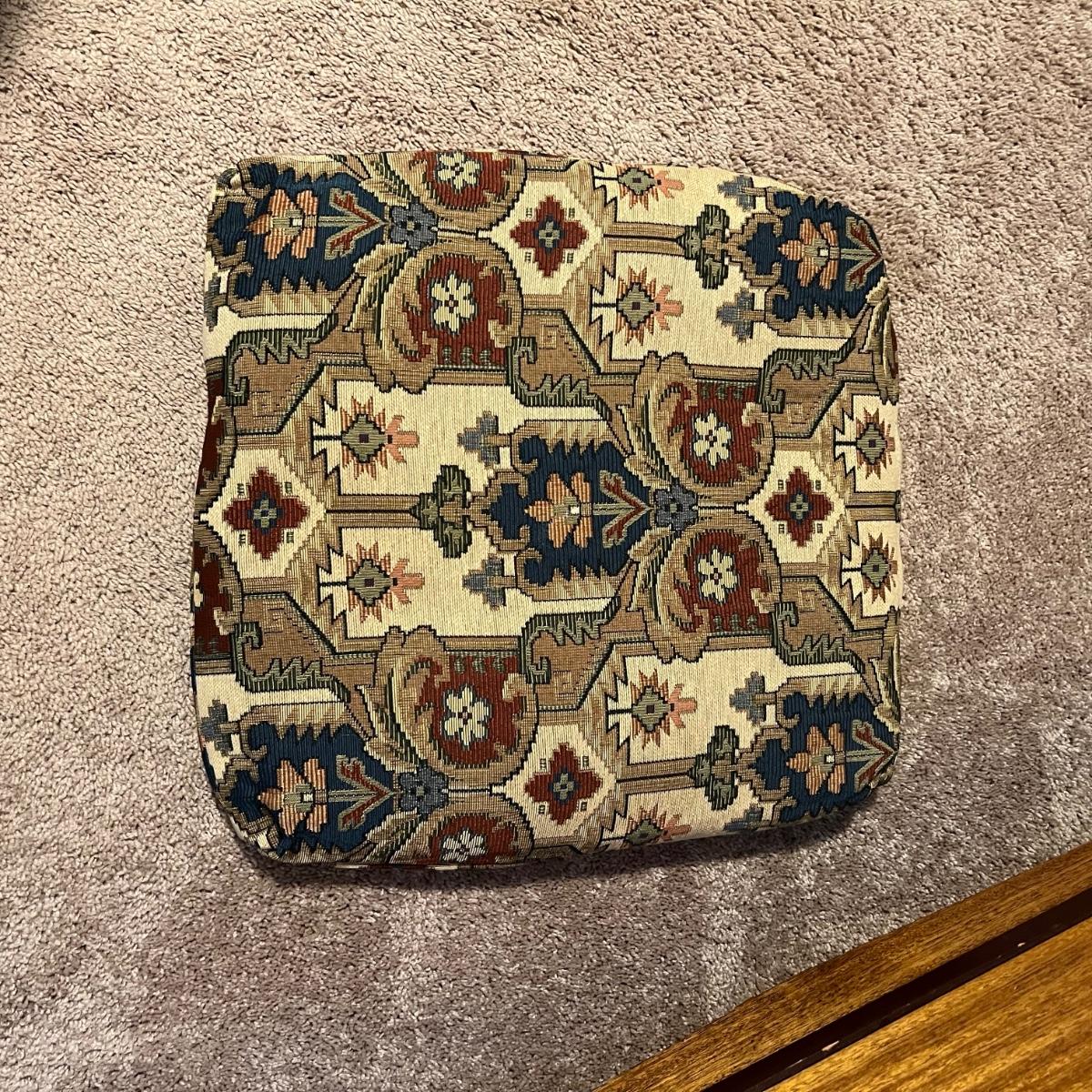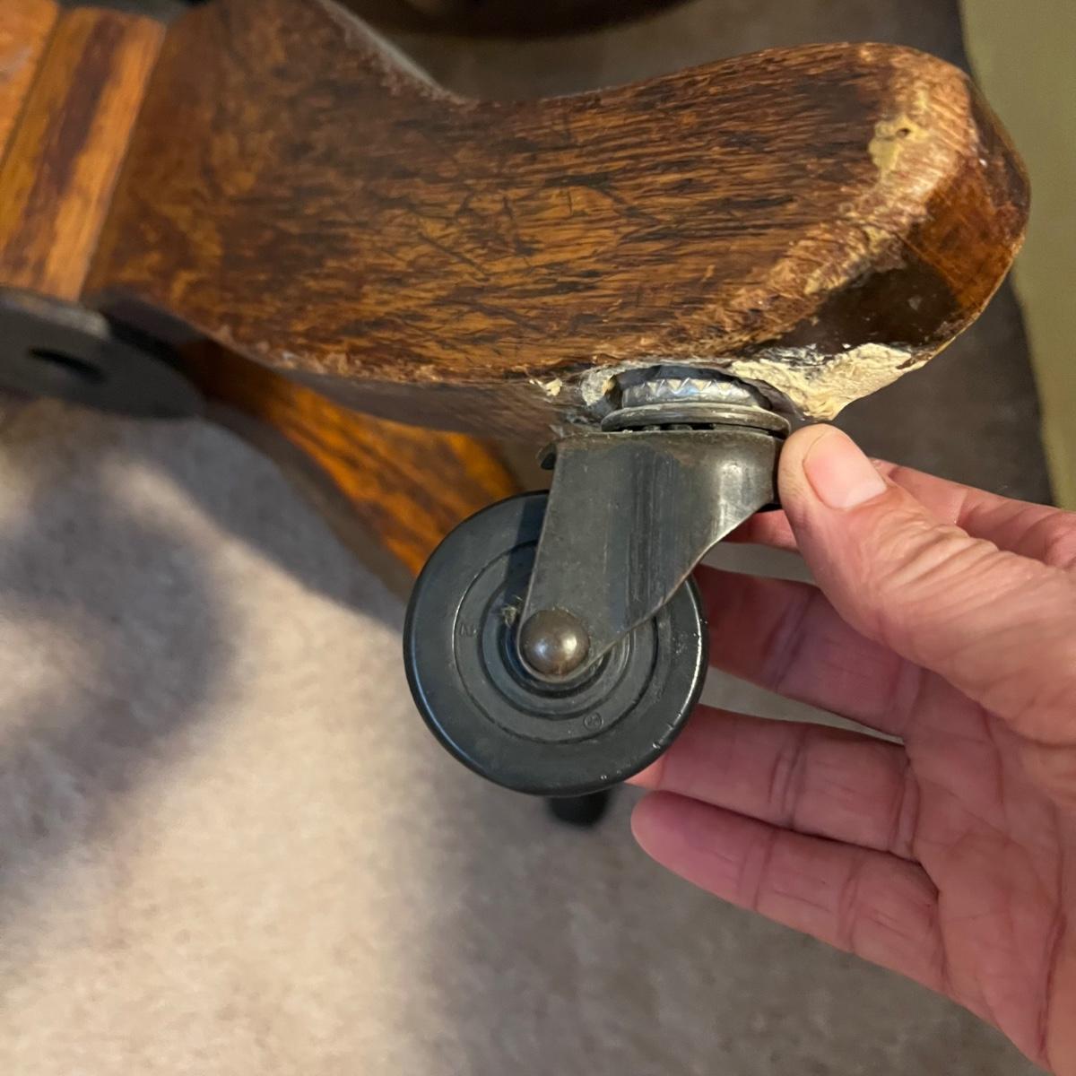 Solid wood rolling chair with upholstered cushion. Fabric on cushion is a tapestry like durable material. Chair rolls smoothly. Looks like one wheel has been glued back into place at some point.