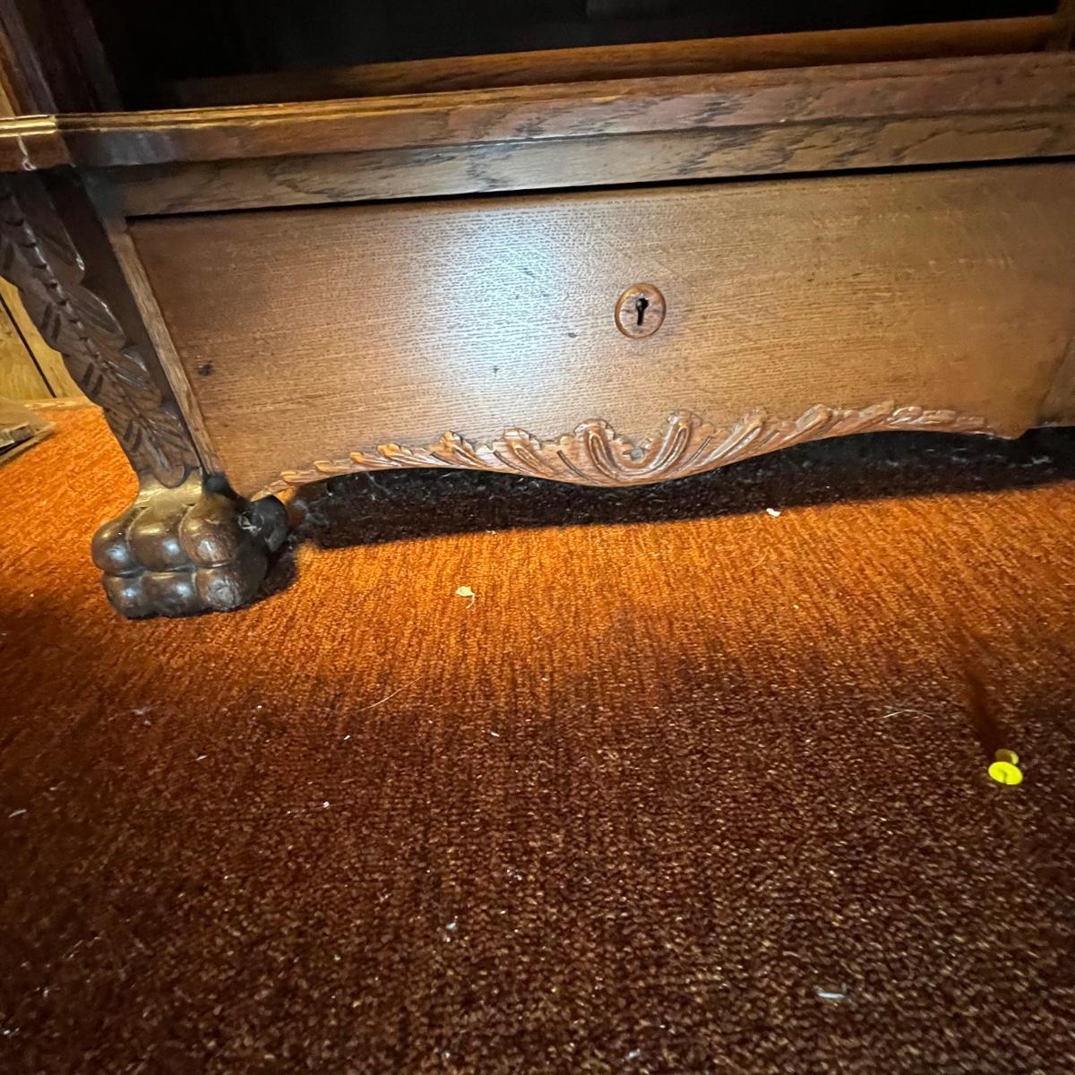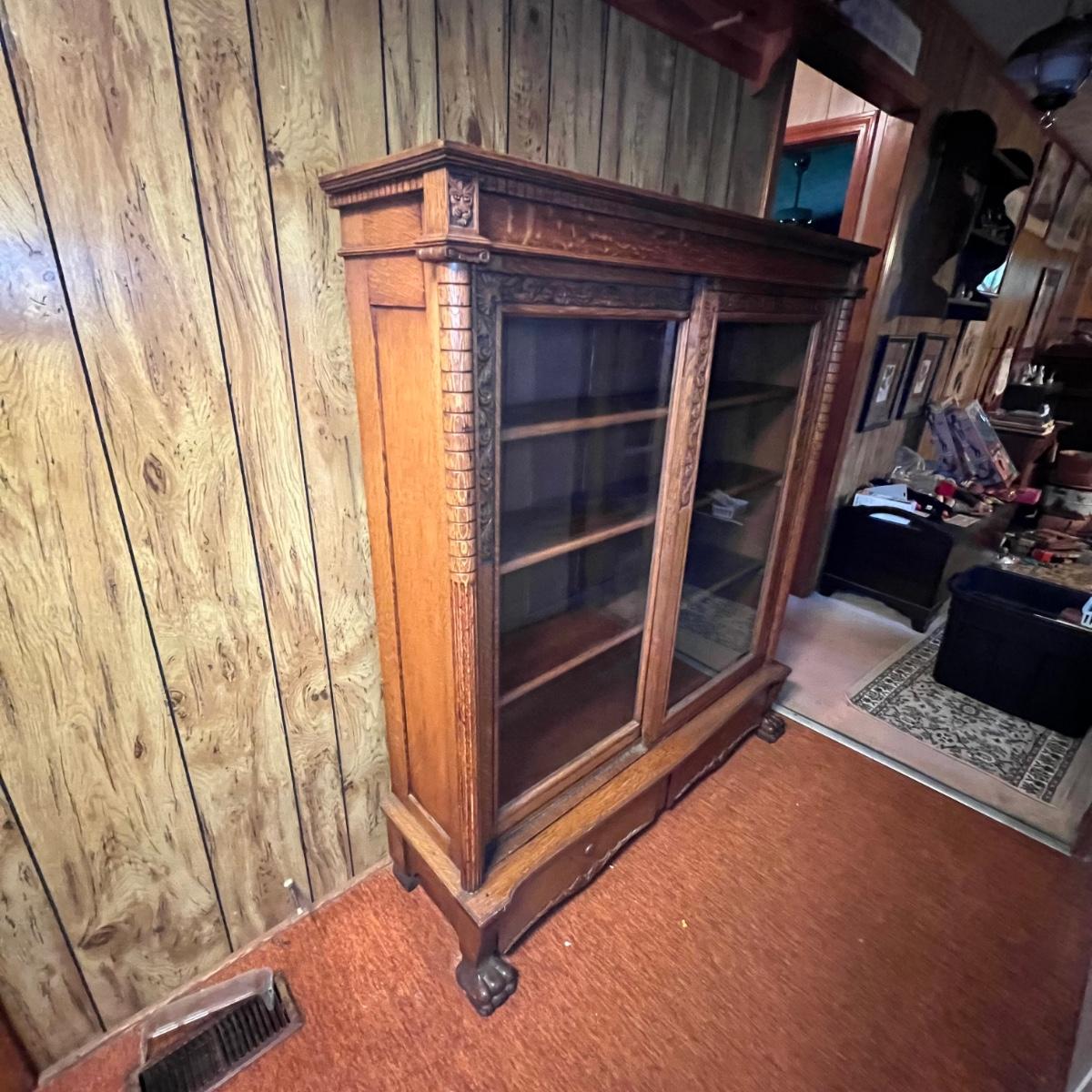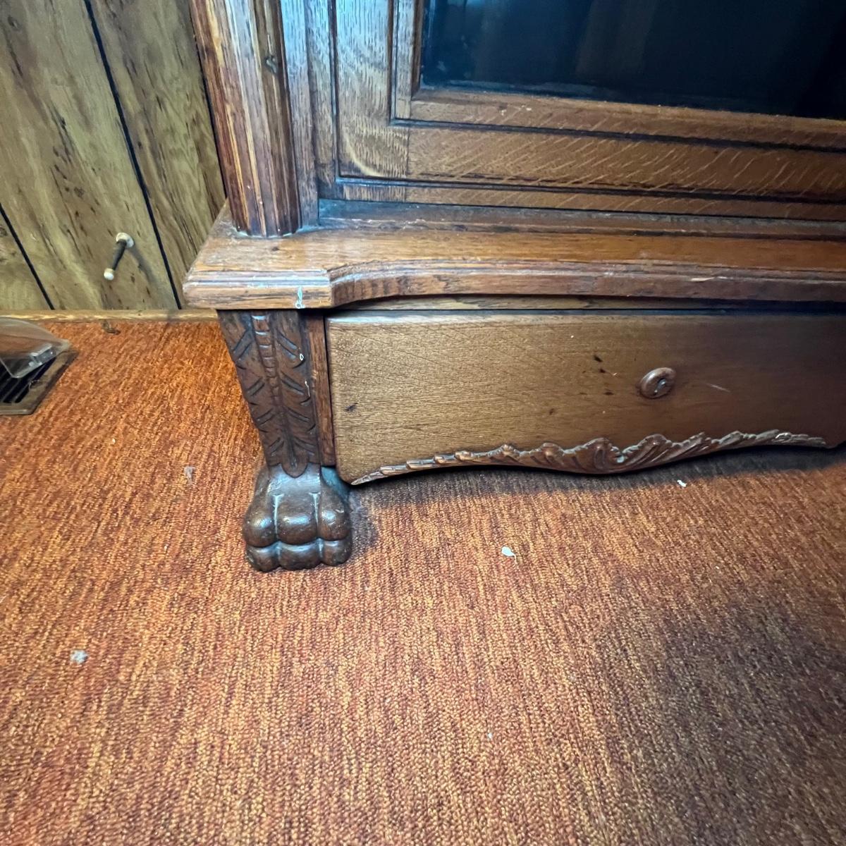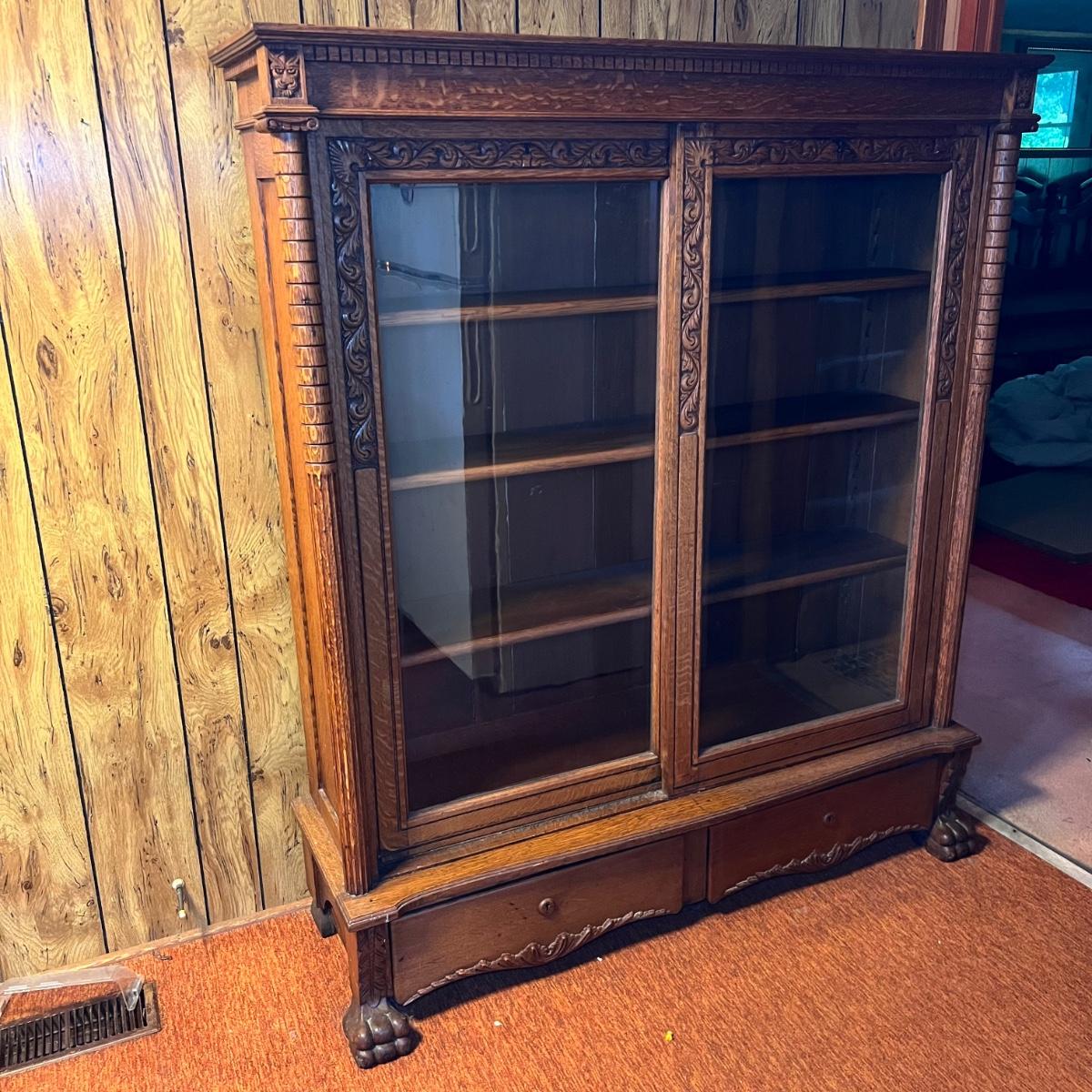 This handsome antique bookcase features two dovetailed drawers (note no keys) that sit below a three shelf cabinet with glass doors. Shelves are adjustable. This is a solid wood piece that appears to be oak. Wood carvings include a lion on each corner, claw feet and more, see images.. No mfg. found. There is a ring stain on the top and a green wax like stain in one drawer, other than that it just needs a good dusting.