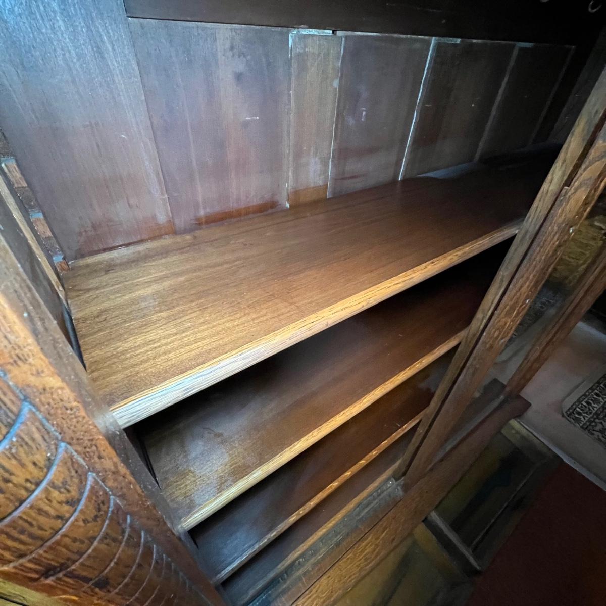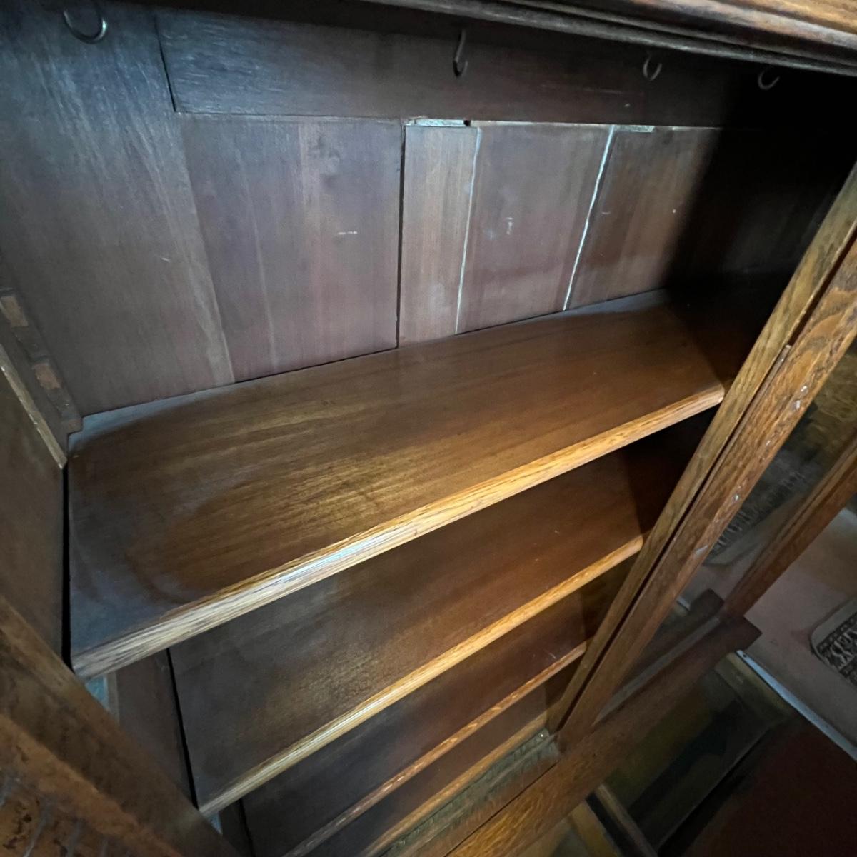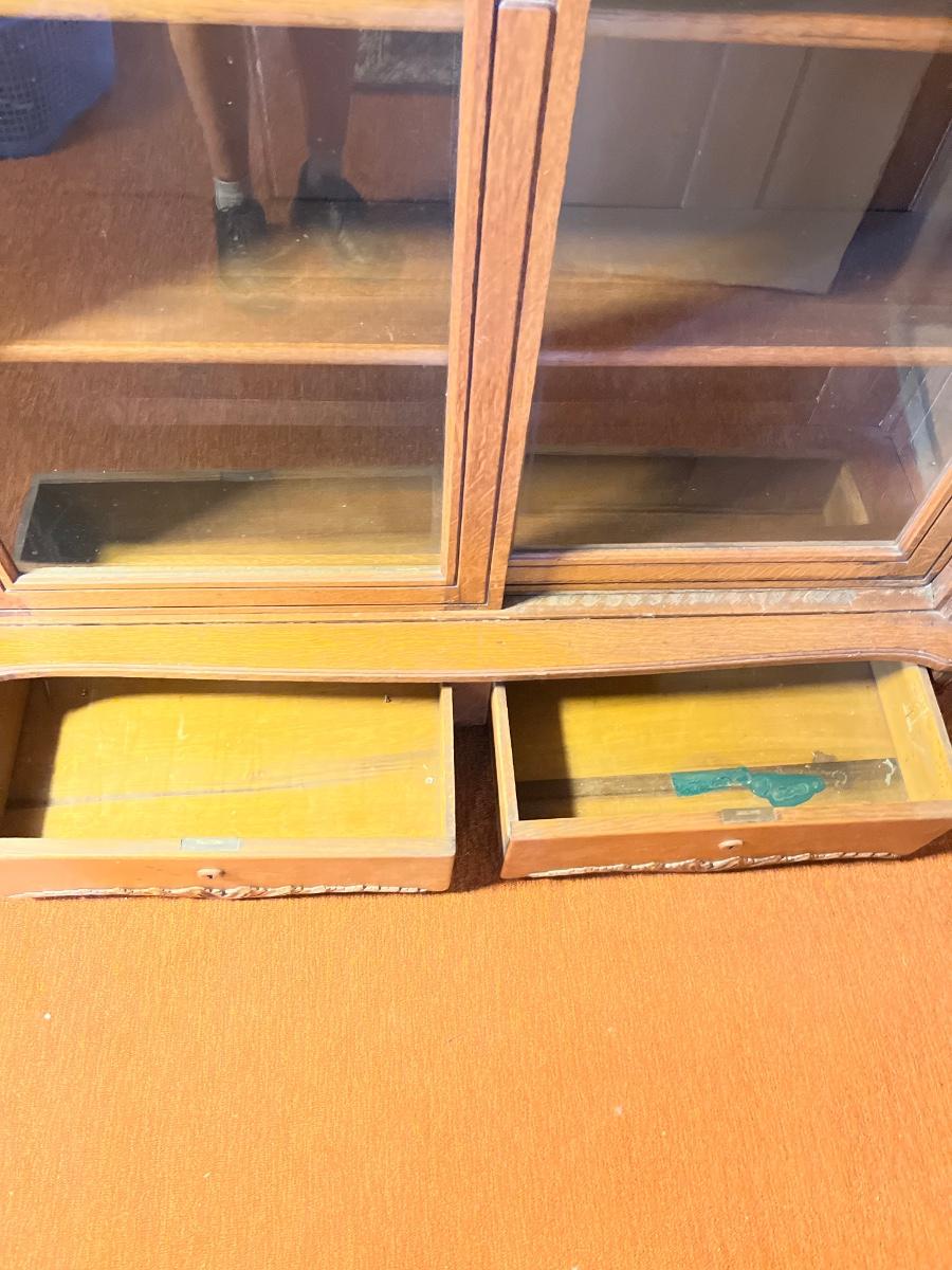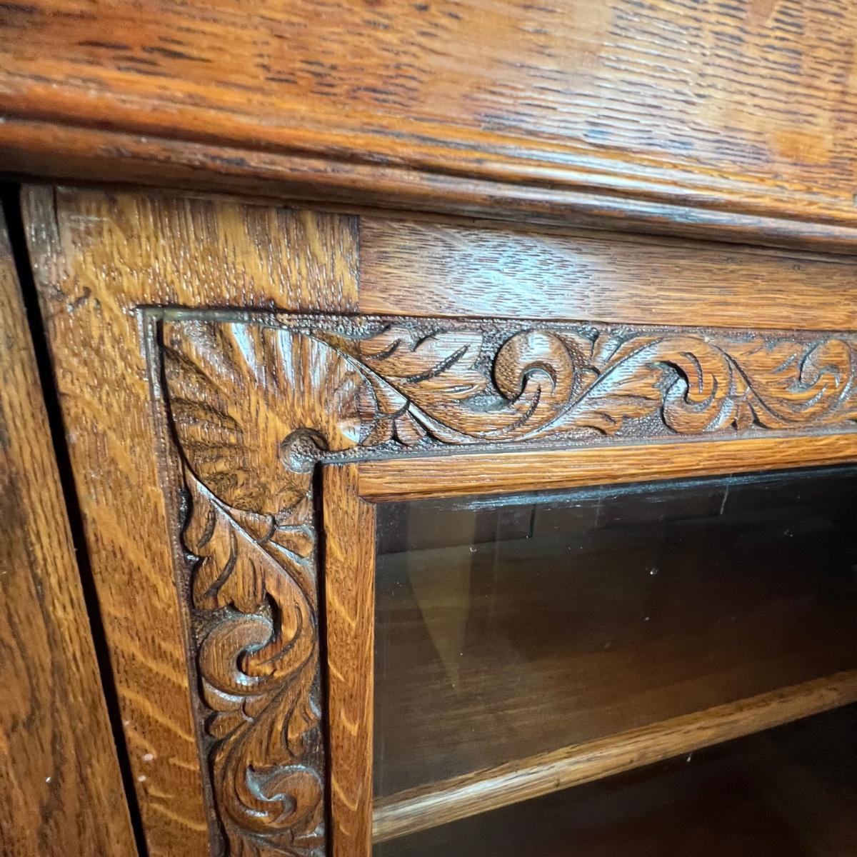 This handsome antique bookcase features two dovetailed drawers (note no keys) that sit below a three shelf cabinet with glass doors. Shelves are adjustable. This is a solid wood piece that appears to be oak. Wood carvings include a lion on each corner, claw feet and more, see images.. No mfg. found. There is a ring stain on the top and a green wax like stain in one drawer, other than that it just needs a good dusting.