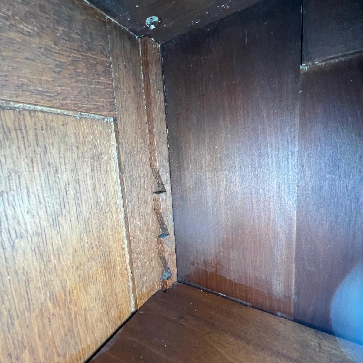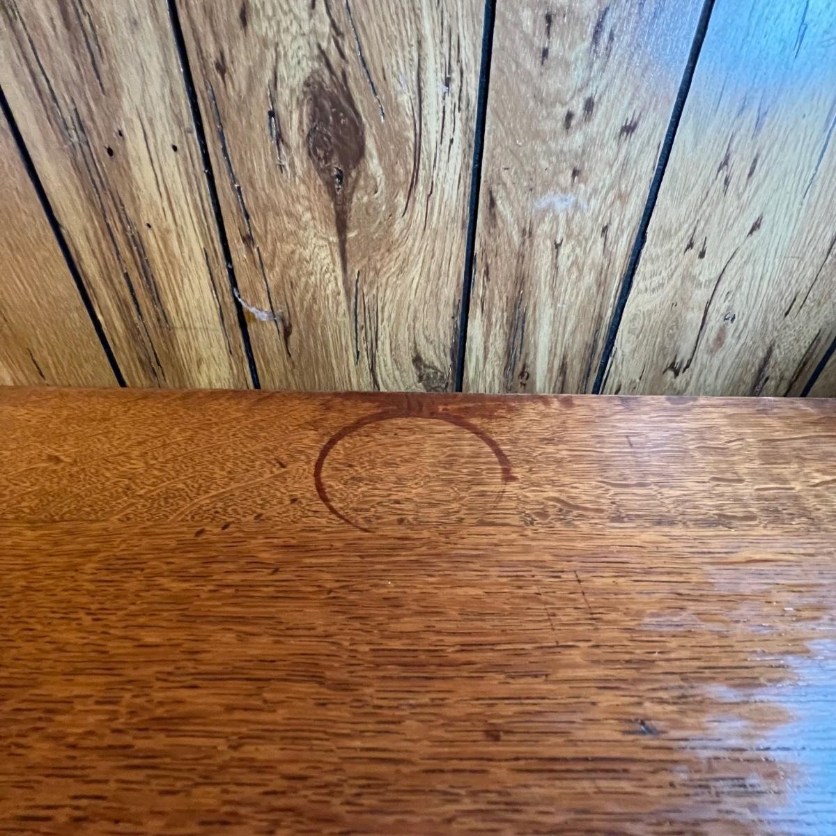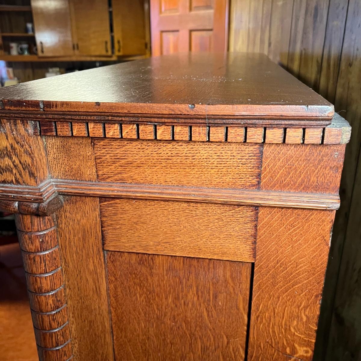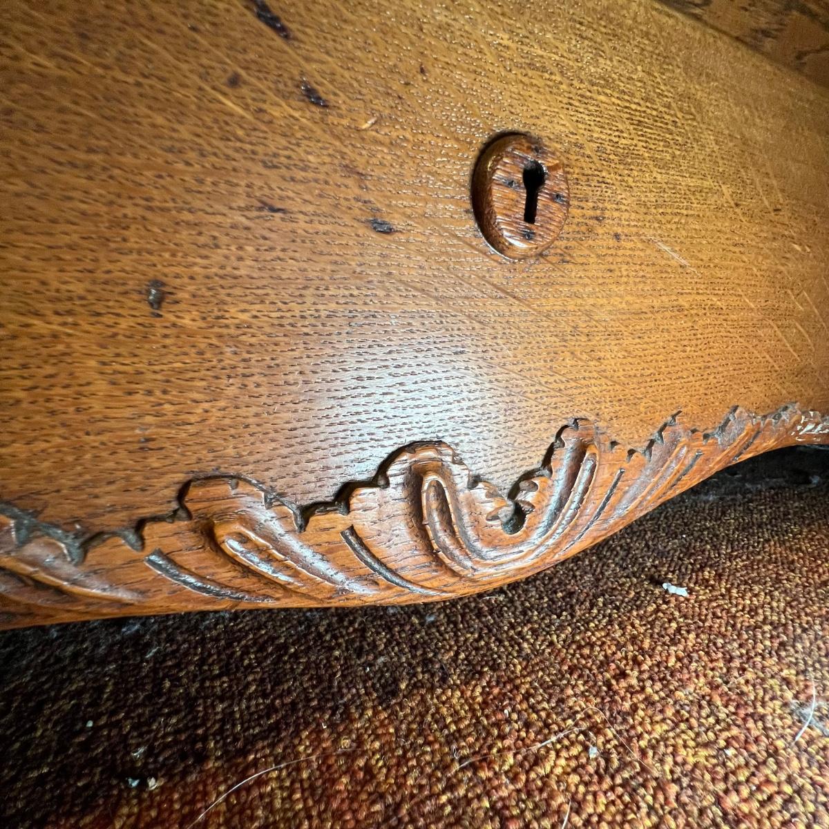 This handsome antique bookcase features two dovetailed drawers (note no keys) that sit below a three shelf cabinet with glass doors. Shelves are adjustable. This is a solid wood piece that appears to be oak. Wood carvings include a lion on each corner, claw feet and more, see images.. No mfg. found. There is a ring stain on the top and a green wax like stain in one drawer, other than that it just needs a good dusting.
