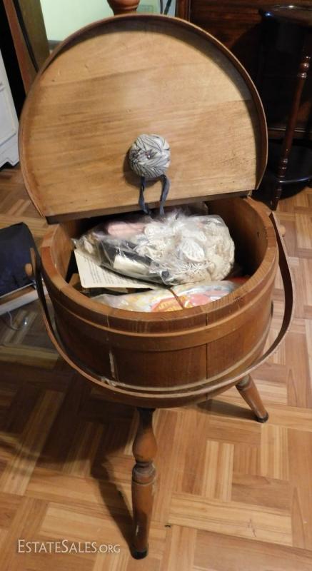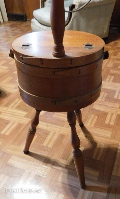 Oak bucket transformed into lamp and sewing kit. Unique.