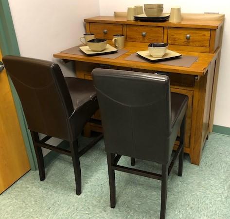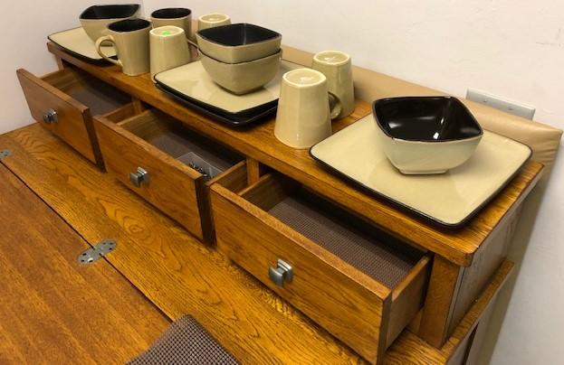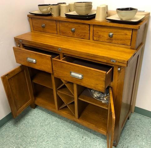 Oak Buffet w/ bonded leather counter stools & dinnerware