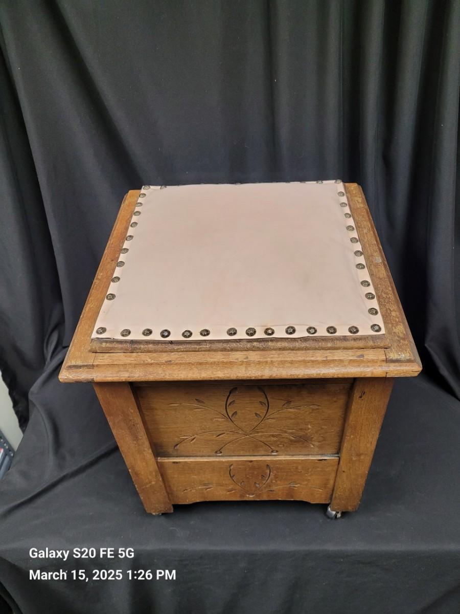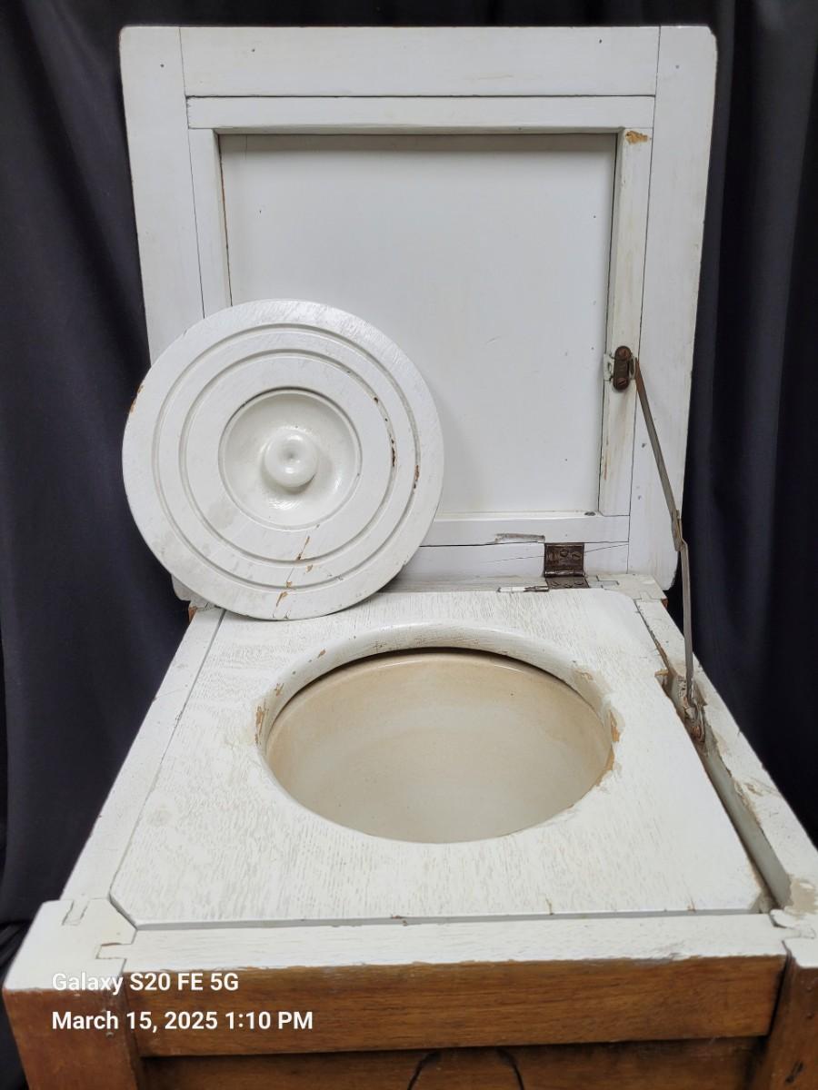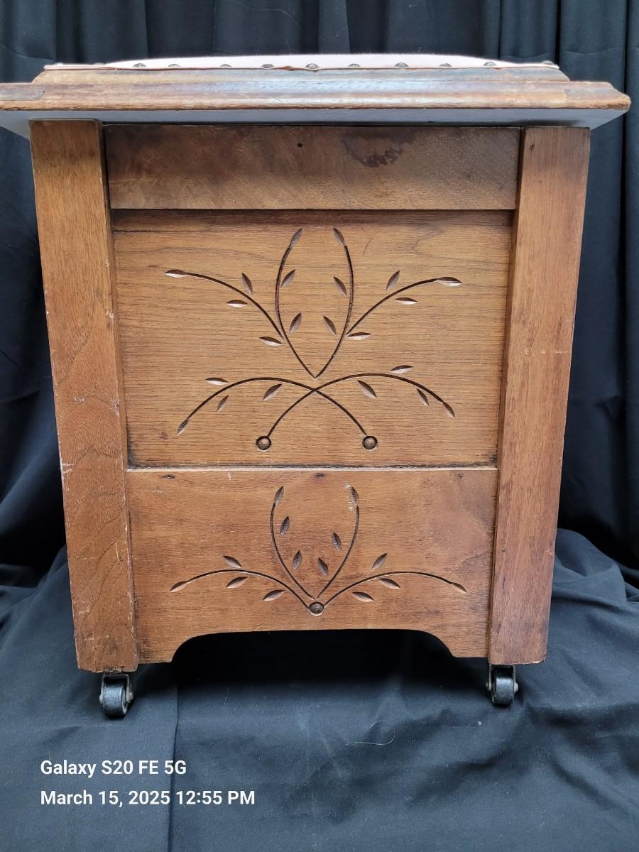 Child's potty chair,commode. China potty insert with carved wooden lid. Carving on 3 side of base, Top upholstery not original to piece.