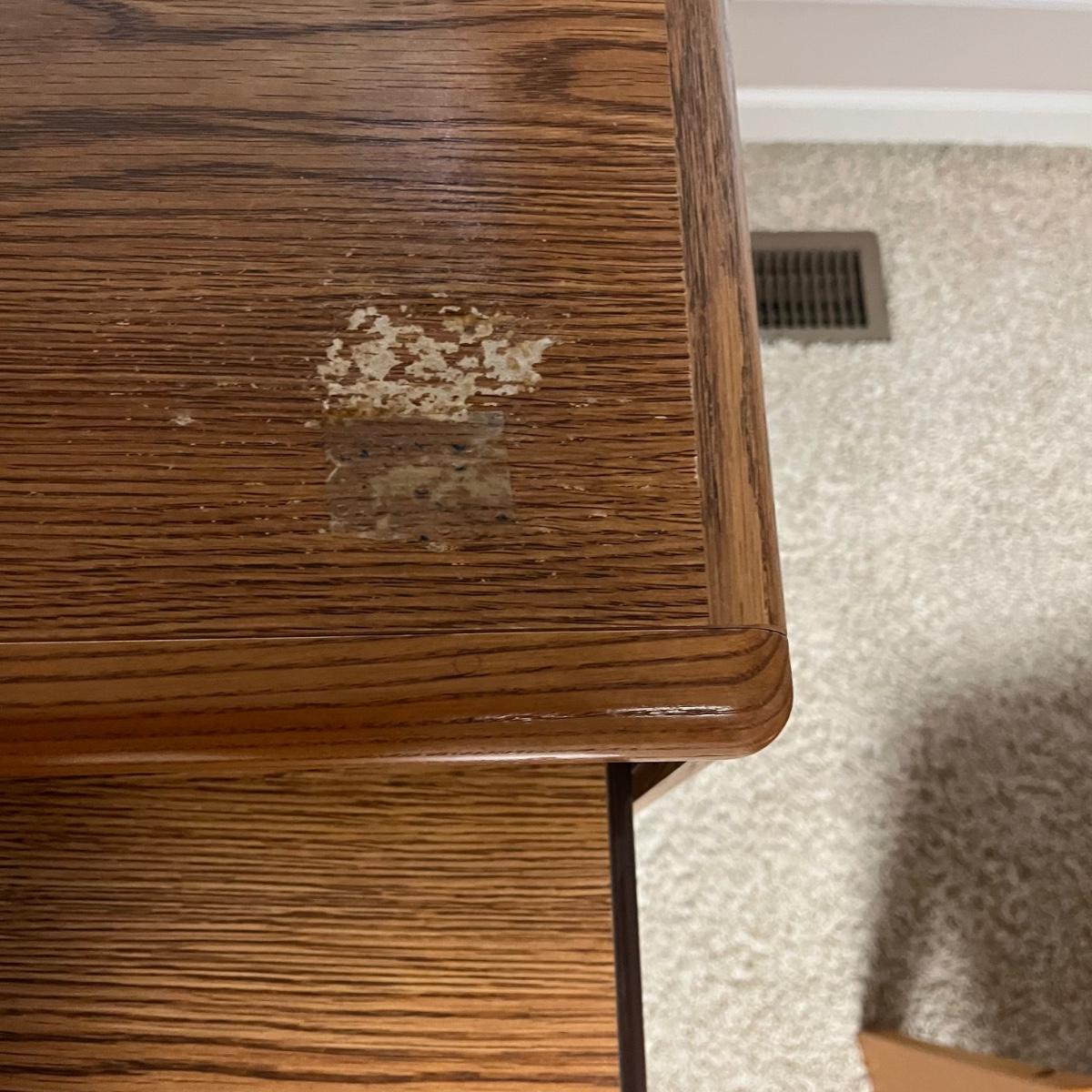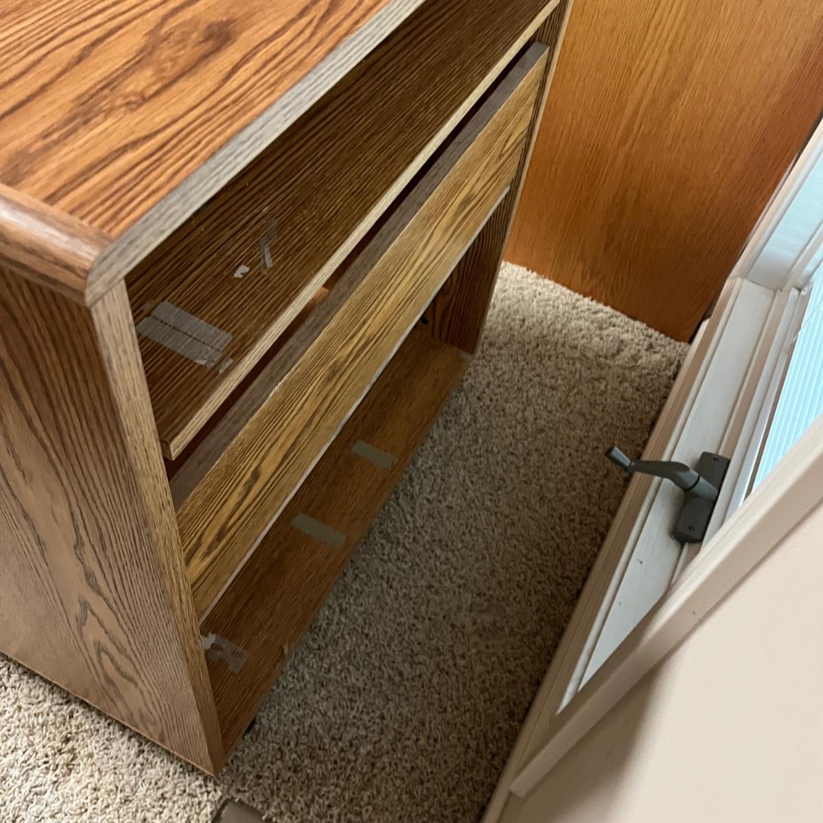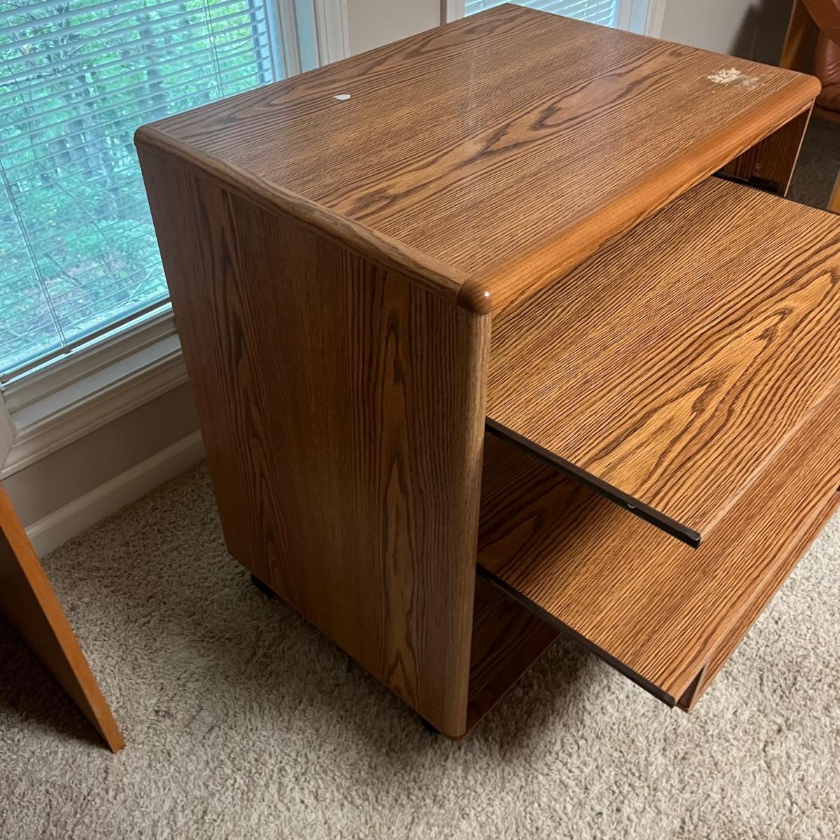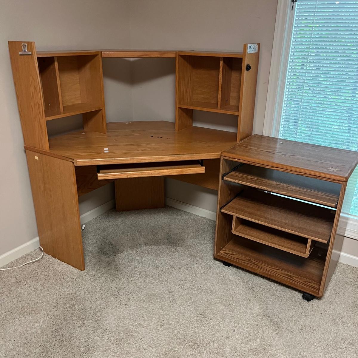 Lot includes a computer desk with pullout keyboard tray. Desk has scratches and things stuck to desk surface, see pictures. Also included is a rolling storage unit that has wear on top, see pictures. It measures 26.5" x 19.5" x 30.5"H. Desk measures 34” x 57” x 54”H. Desk appears to come apart in two pieces with the removal of screws, but we cannot be sure it does. Both pieces of furniture appear to be made of manufactured wood.