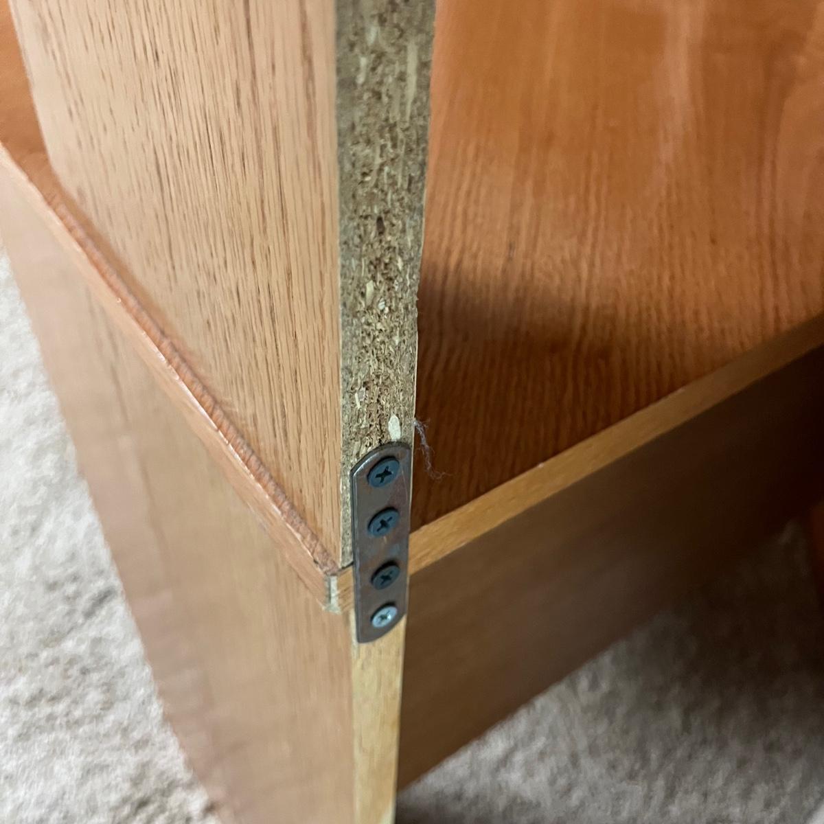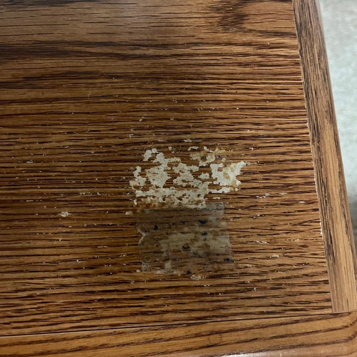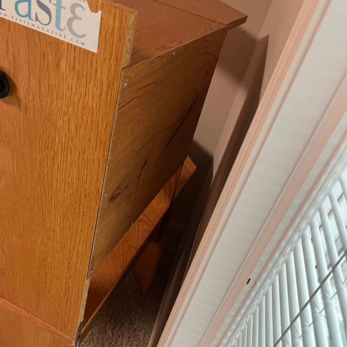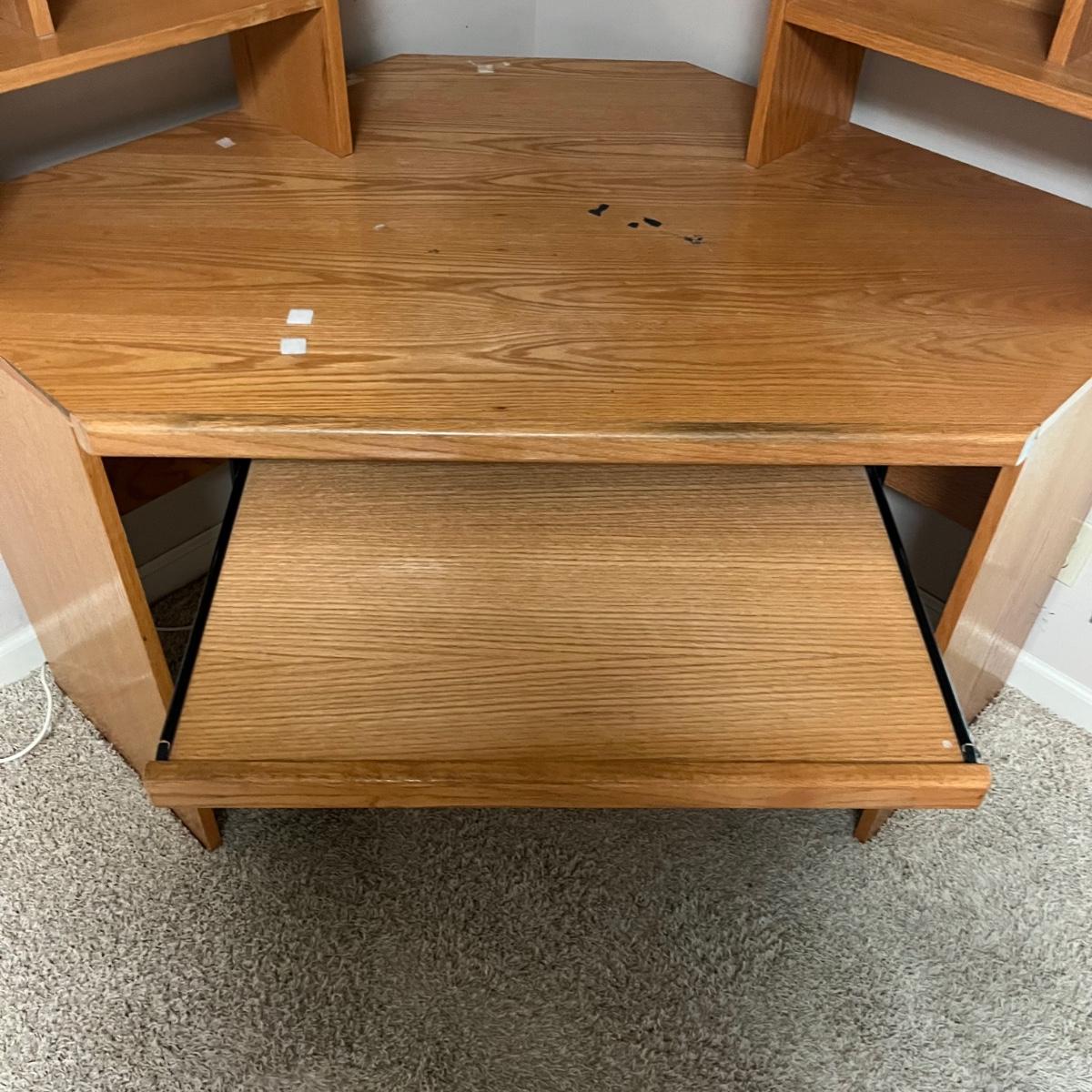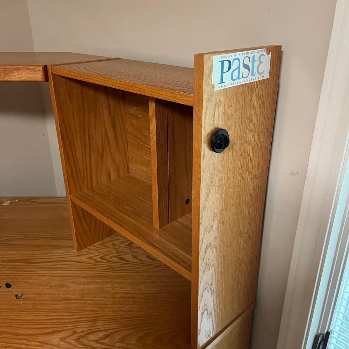 Lot includes a computer desk with pullout keyboard tray. Desk has scratches and things stuck to desk surface, see pictures. Also included is a rolling storage unit that has wear on top, see pictures. It measures 26.5" x 19.5" x 30.5"H. Desk measures 34” x 57” x 54”H. Desk appears to come apart in two pieces with the removal of screws, but we cannot be sure it does. Both pieces of furniture appear to be made of manufactured wood.