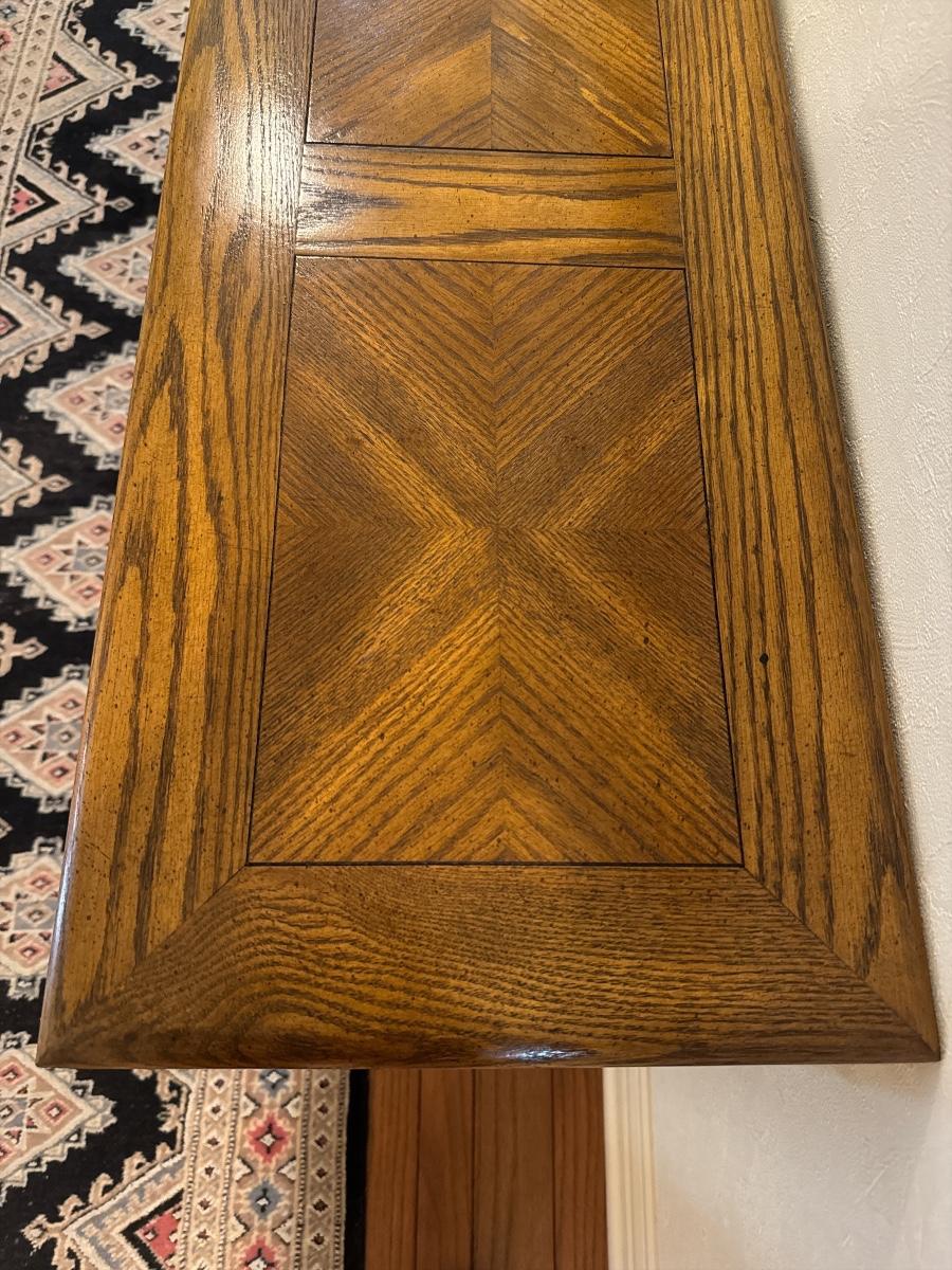 Classic oak hall table with chevron-style top and carved leg detail. Sturdy and timeless—great for entryways or behind a sofa.