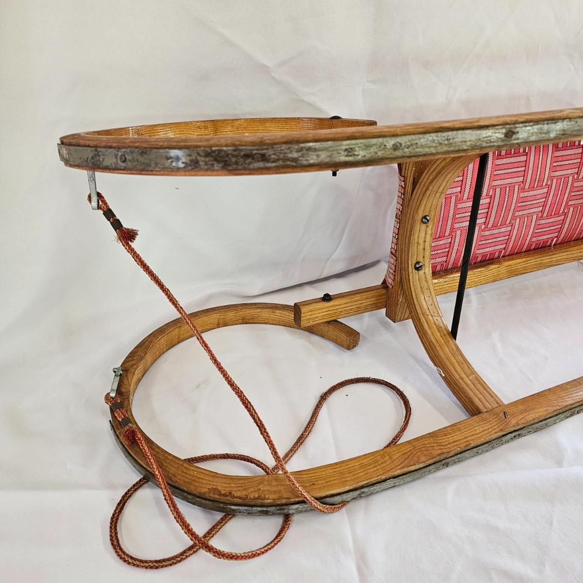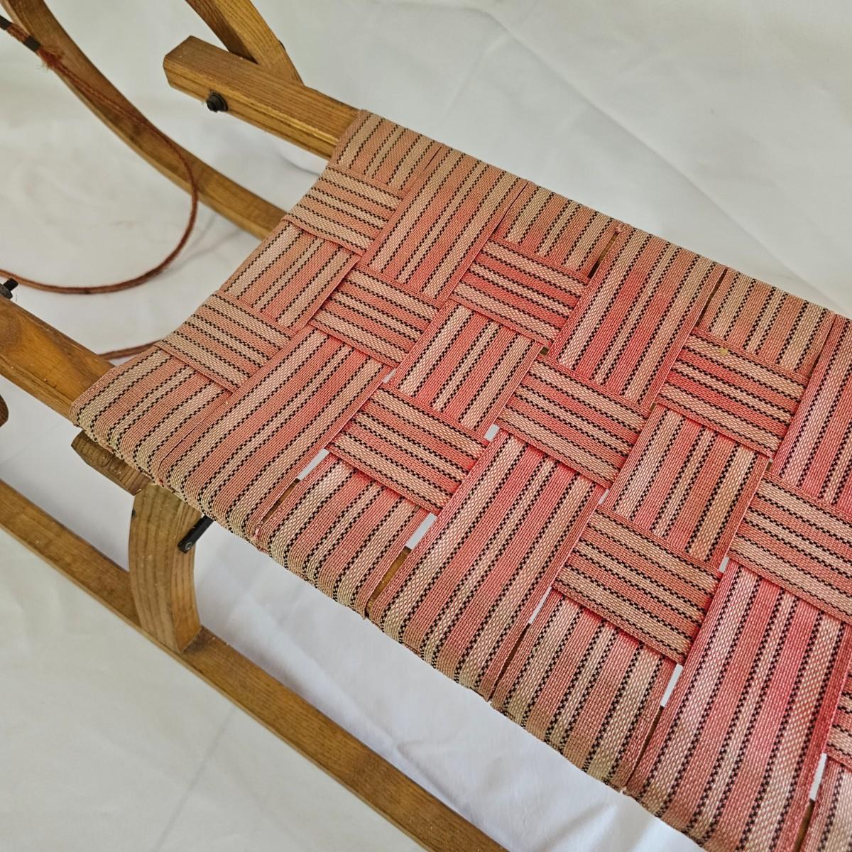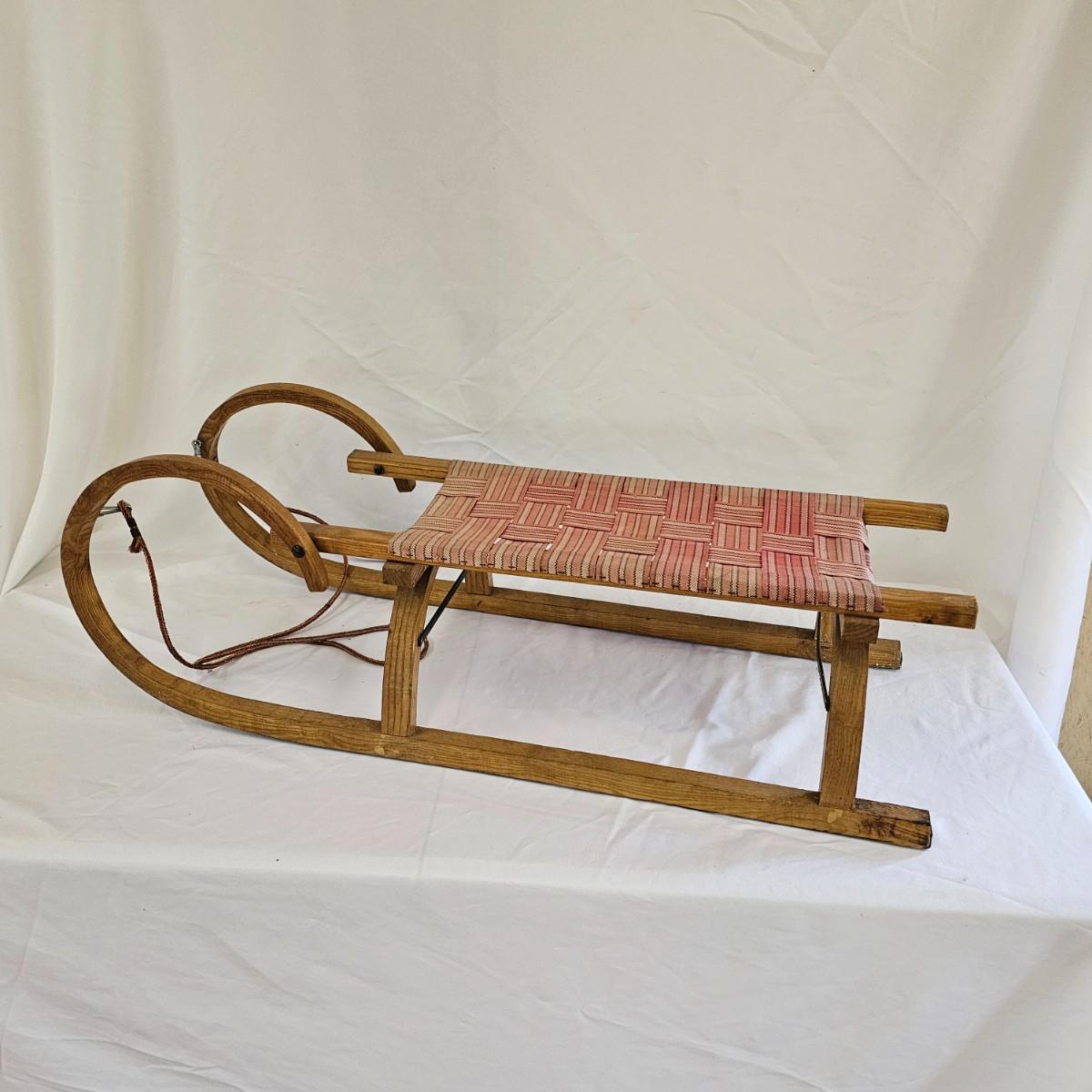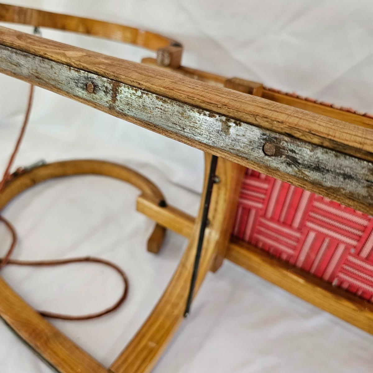 A beautiful solid wood sleigh with curved runners and a woven webbing seat. Webbing appears to be red, pink, and black in color. Wood appears to be oak. Has pull rope and steel runner strips on bottom. Sleigh measures 41" x 15" x 14"H. Slight discoloring and one small crack in runner, see photos for details. Local pickup only.